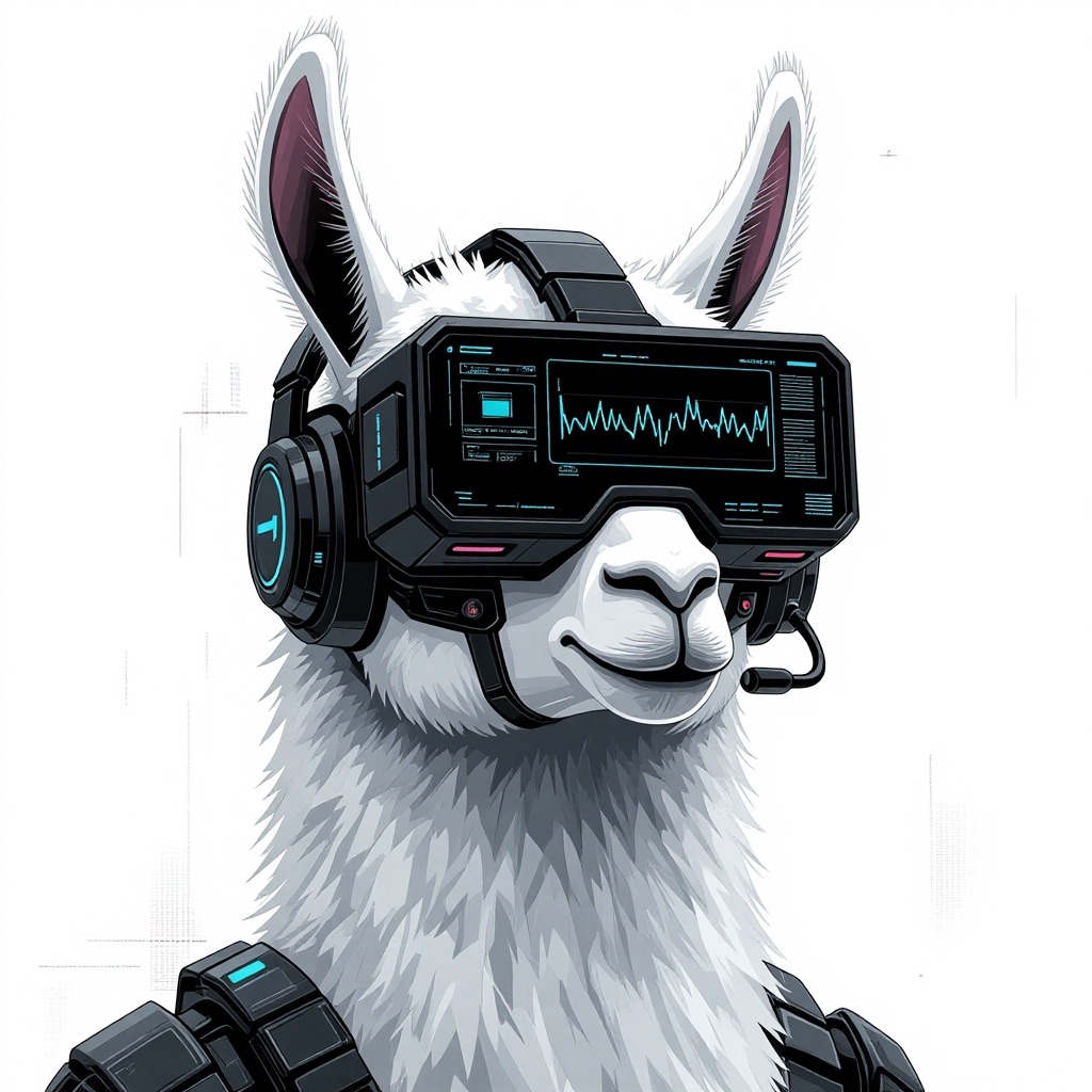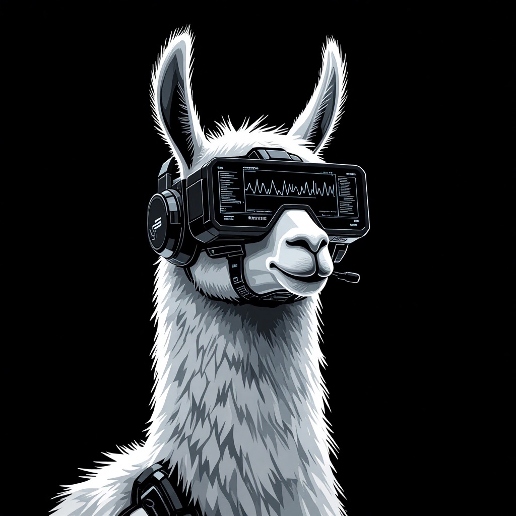 A Biomechanical llama with a monitor screen headset, rendered in a cyberpunk style with black and white tones, featuring sharp contrasts, expressive brushwork, and a sleek, futuristic aesthetic. White isolated background.
