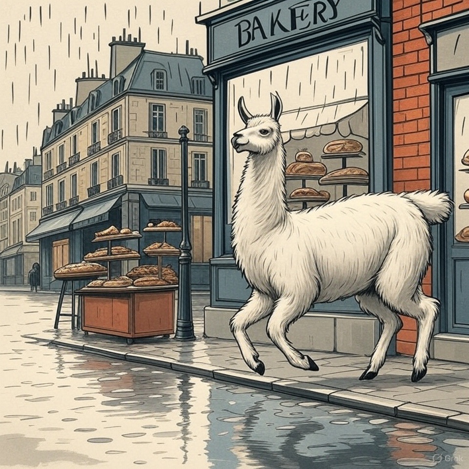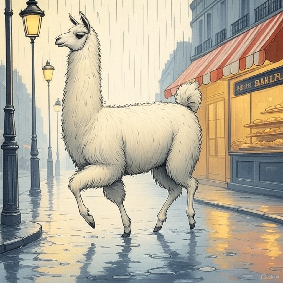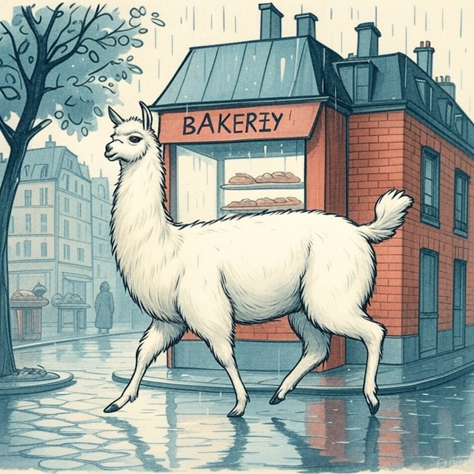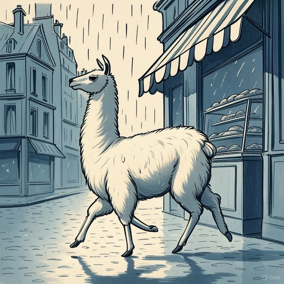 A classic French children’s book illustration from the 1950s, showing a llama walking past a bakery on a rainy Paris street. Clean black ink lines, flat muted colors like navy blue and brick red, white background. Inspired by Sempé and Jean de Brunhoff.