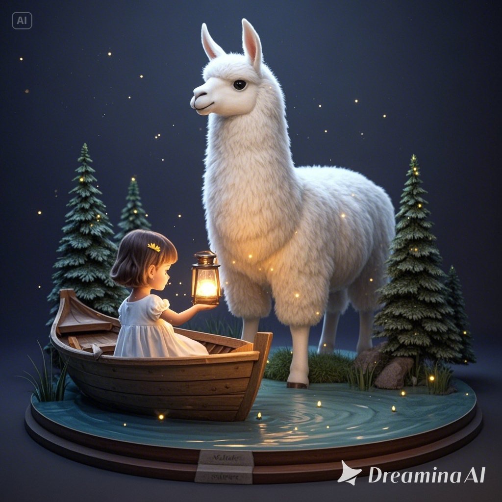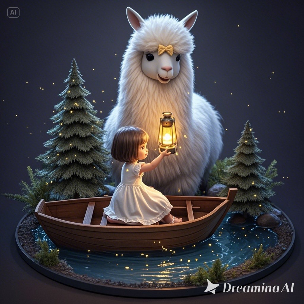 3d hyperrealistic model back-view of a little girl with bob-haircut wearing a white dress sitting inside a wooden boat holding a magical glowing lantern made of fireflies on her hand in the foreground, a gigantic cute white furry llama to her half-submerged in the background, a few pine trees around, setting on a round lake base, dark background