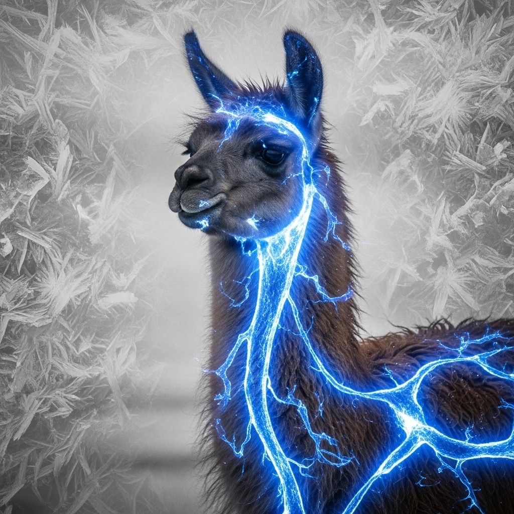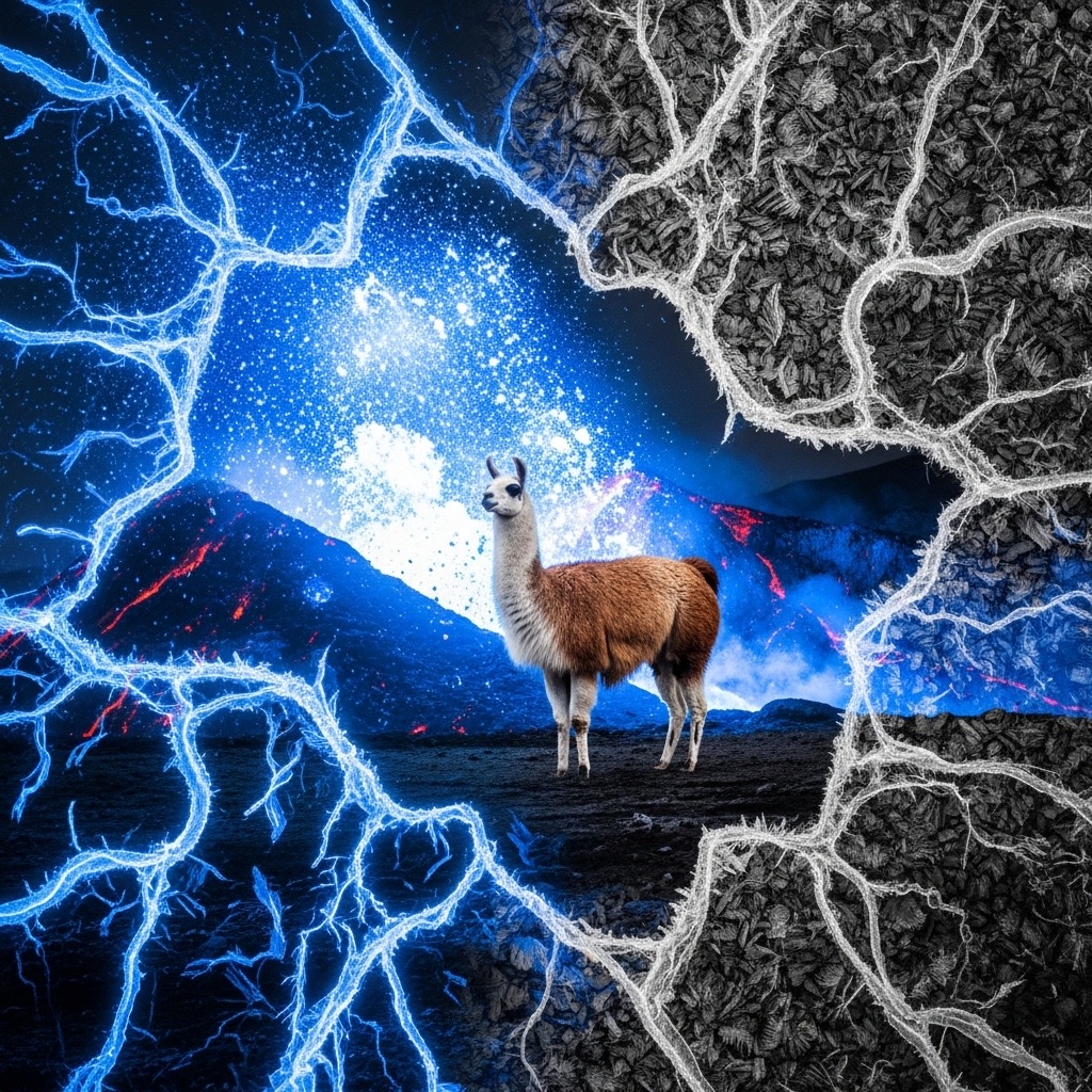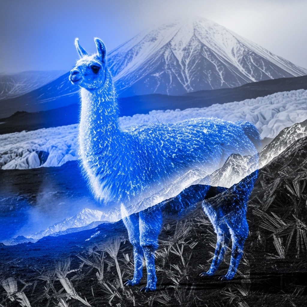 A Volcanic Ice Paradox portrayal of Llama, where opposing natural forces coexist. Combine molten blue heat signatures with crystalline black frost patterns in a double exposure of elemental contrast