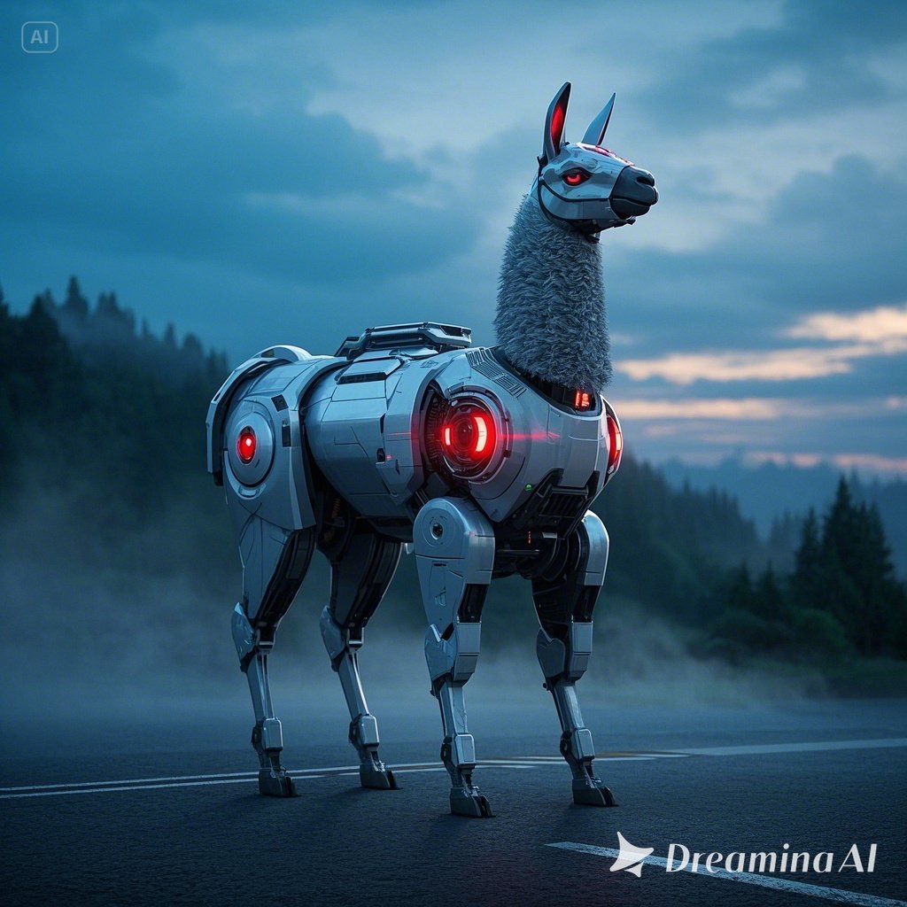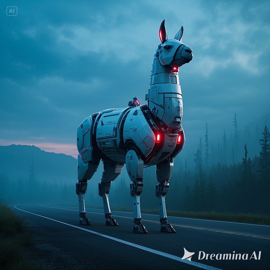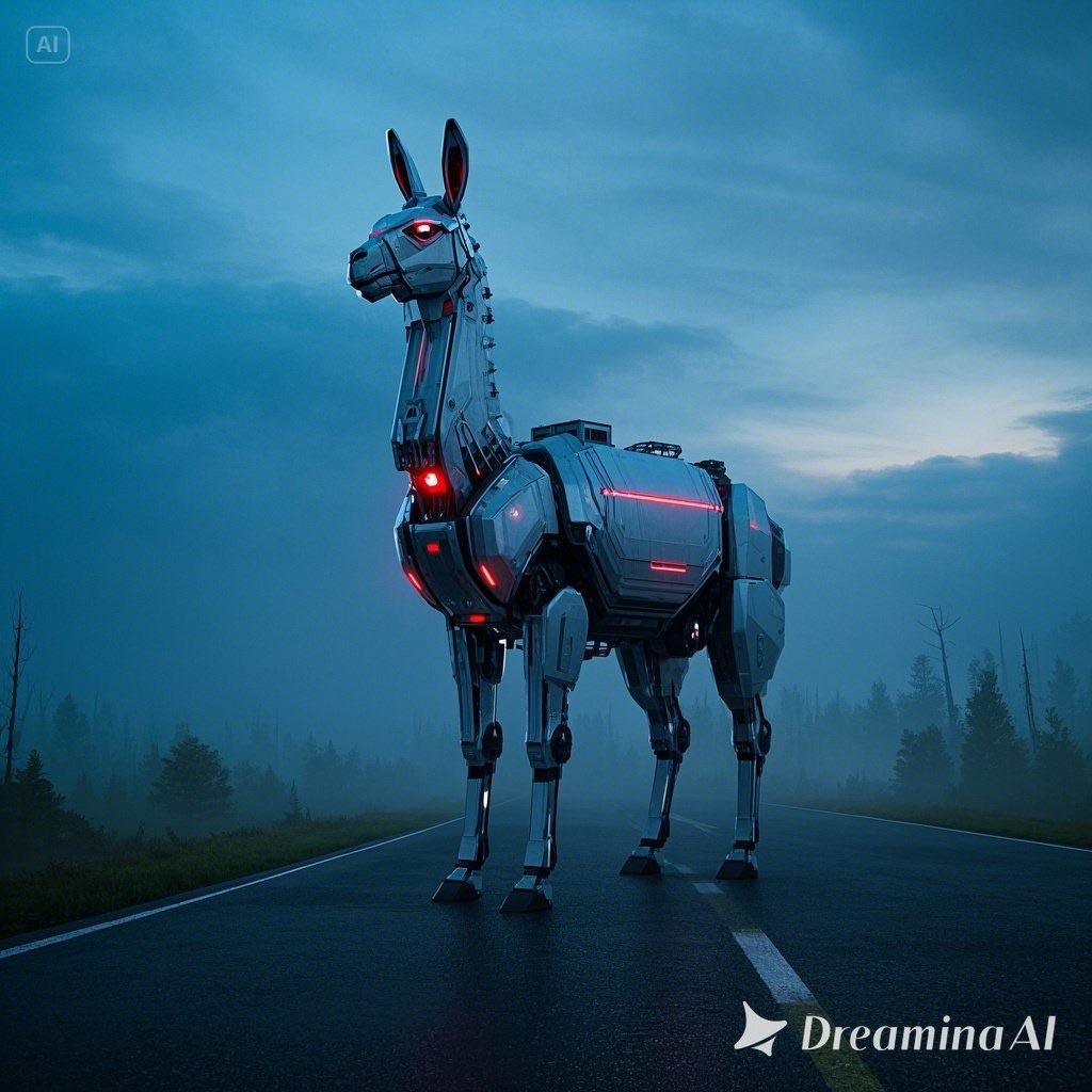 A massive futuristic mechanical llama, designed with sleek white metallic surfaces and glowing red light cores, standing on an empty misty road at twilight. The scene is cinematic, with dramatic soft lighting and atmospheric fog. The camera is set at a low angle, with shallow depth of field. Ultra-detailed, hyperrealistic lighting and reflections. Wide-angle composition, sci-fi mood.