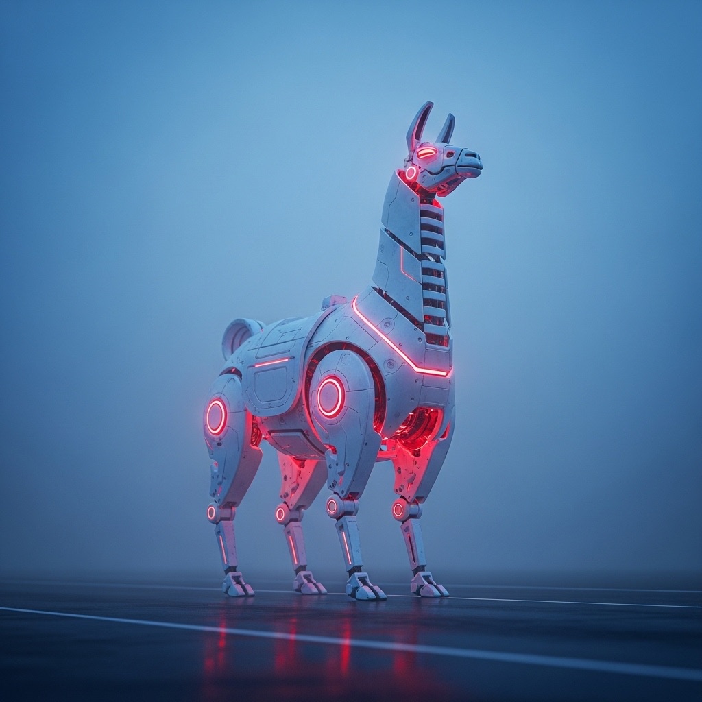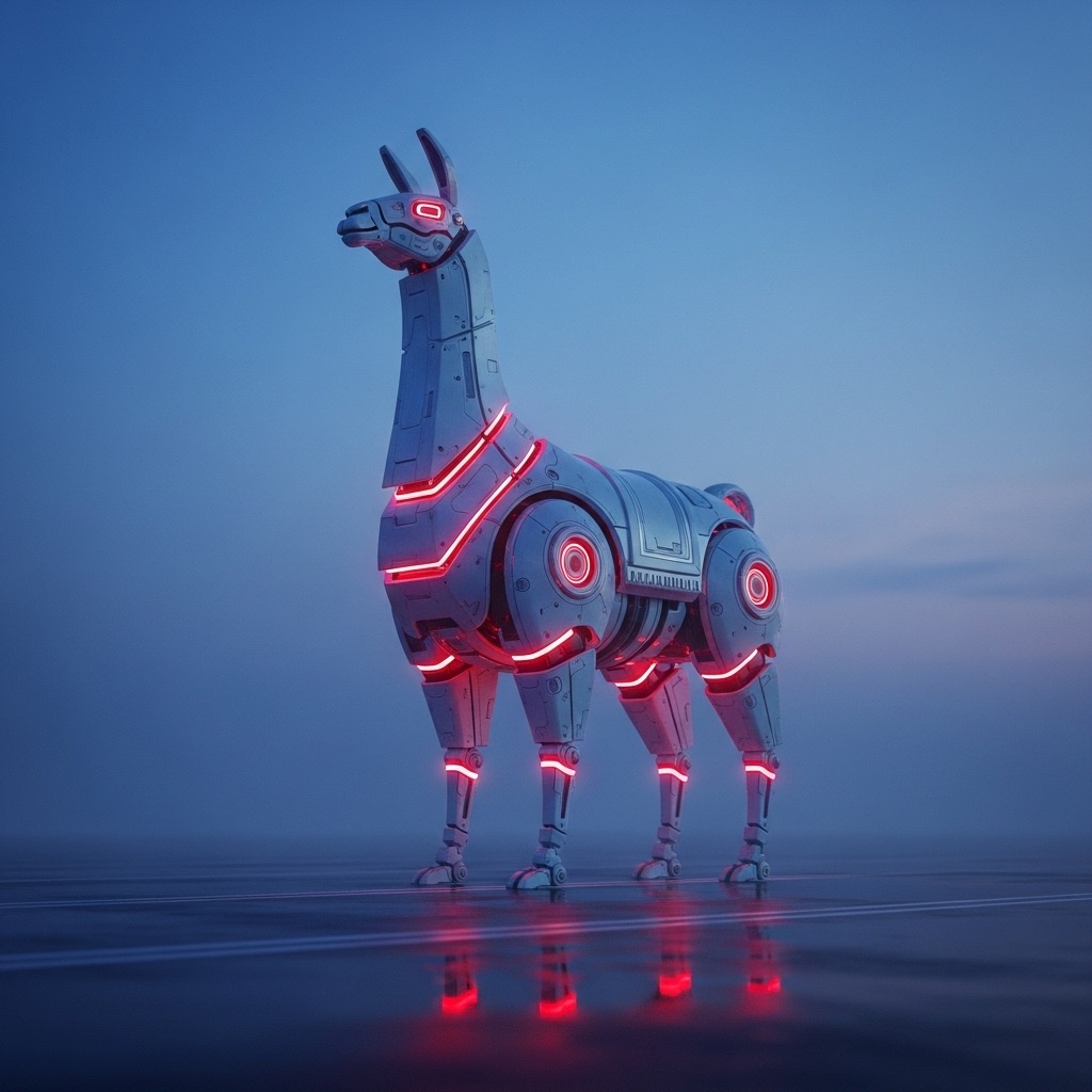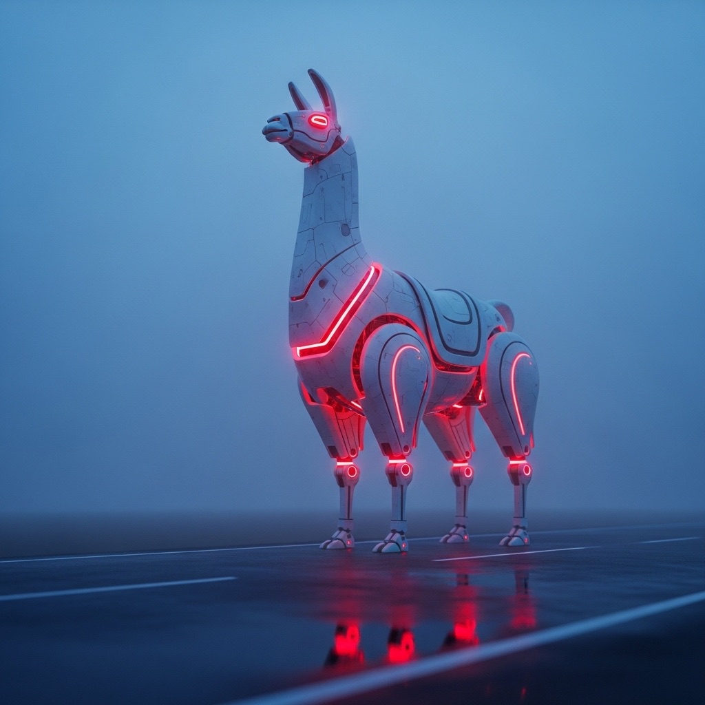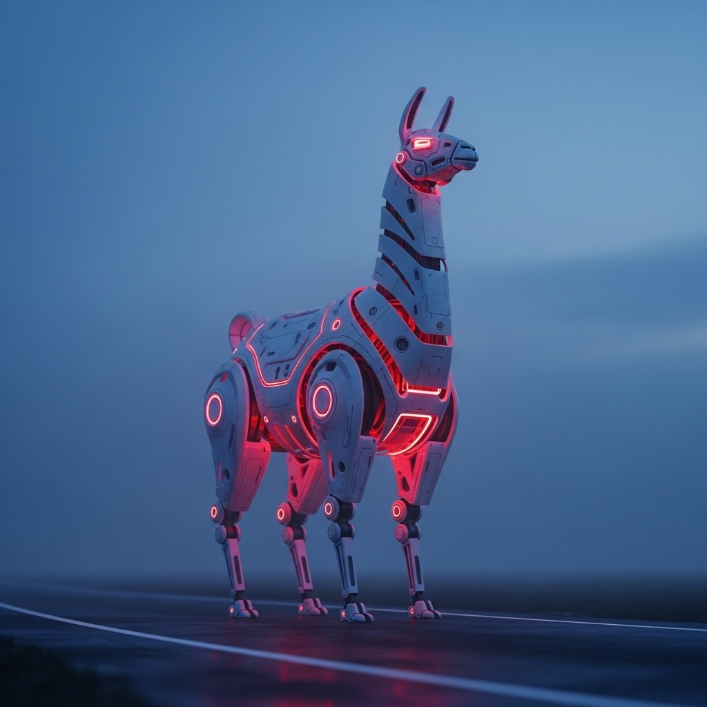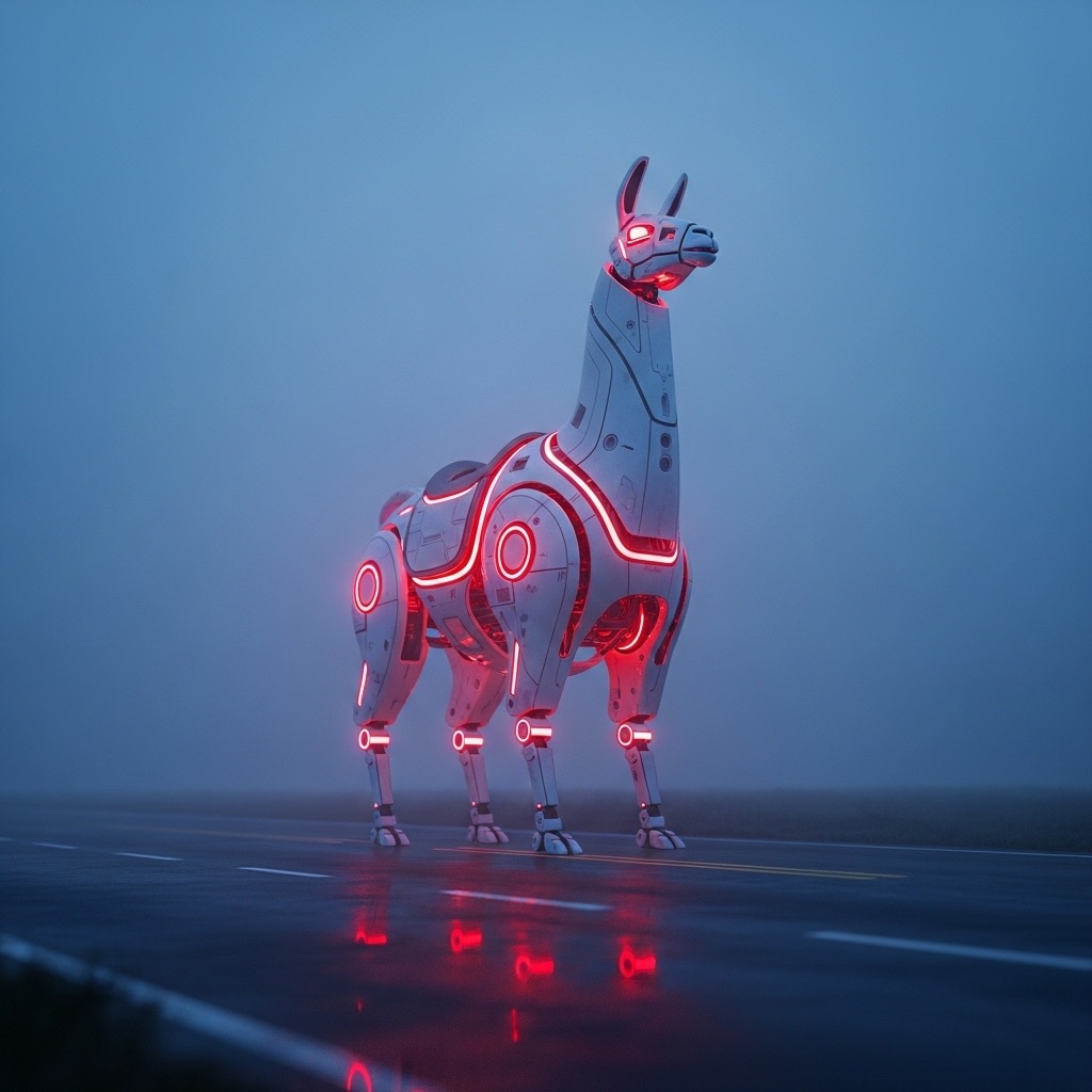 A massive futuristic mechanical llama, designed with sleek white metallic surfaces and glowing red light cores, standing on an empty misty road at twilight. The scene is cinematic, with dramatic soft lighting and atmospheric fog. The camera is set at a low angle, with shallow depth of field. Ultra-detailed, hyperrealistic lighting and reflections. Wide-angle composition, sci-fi mood.