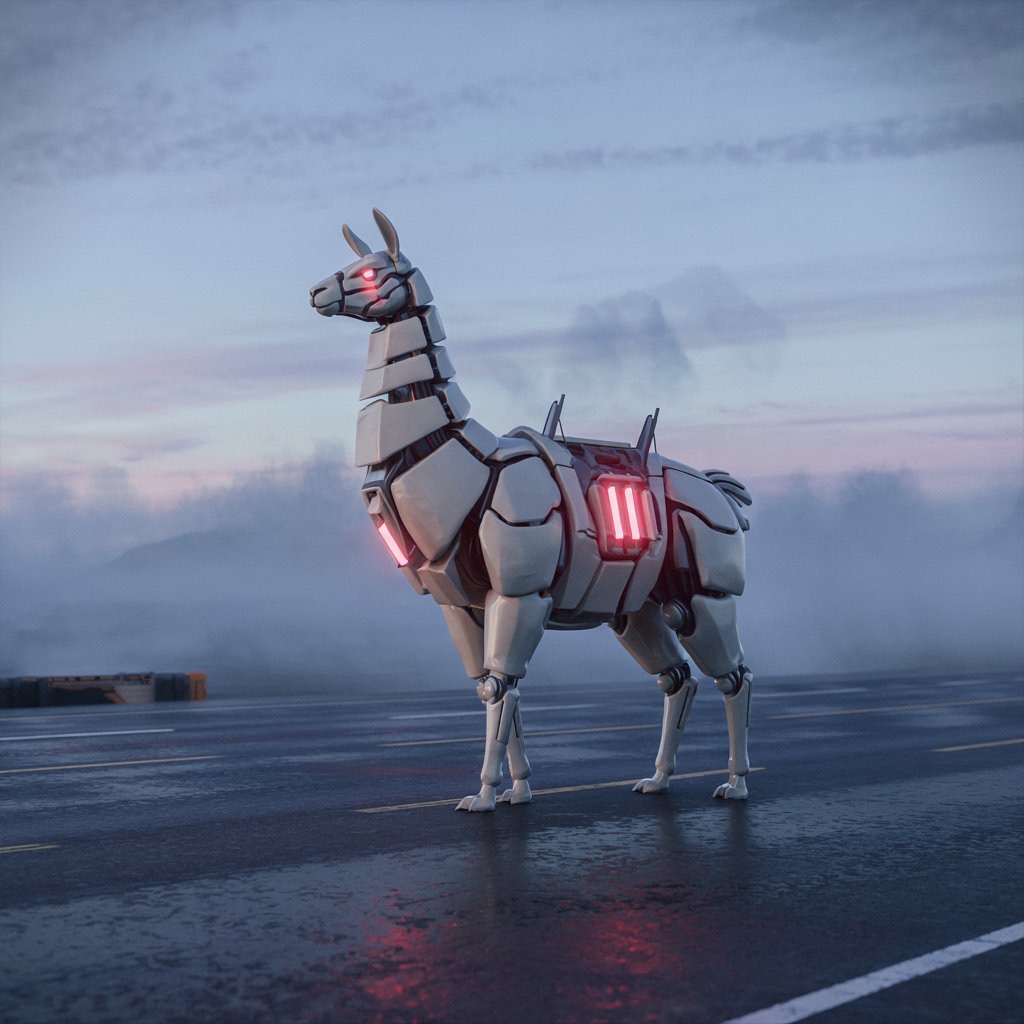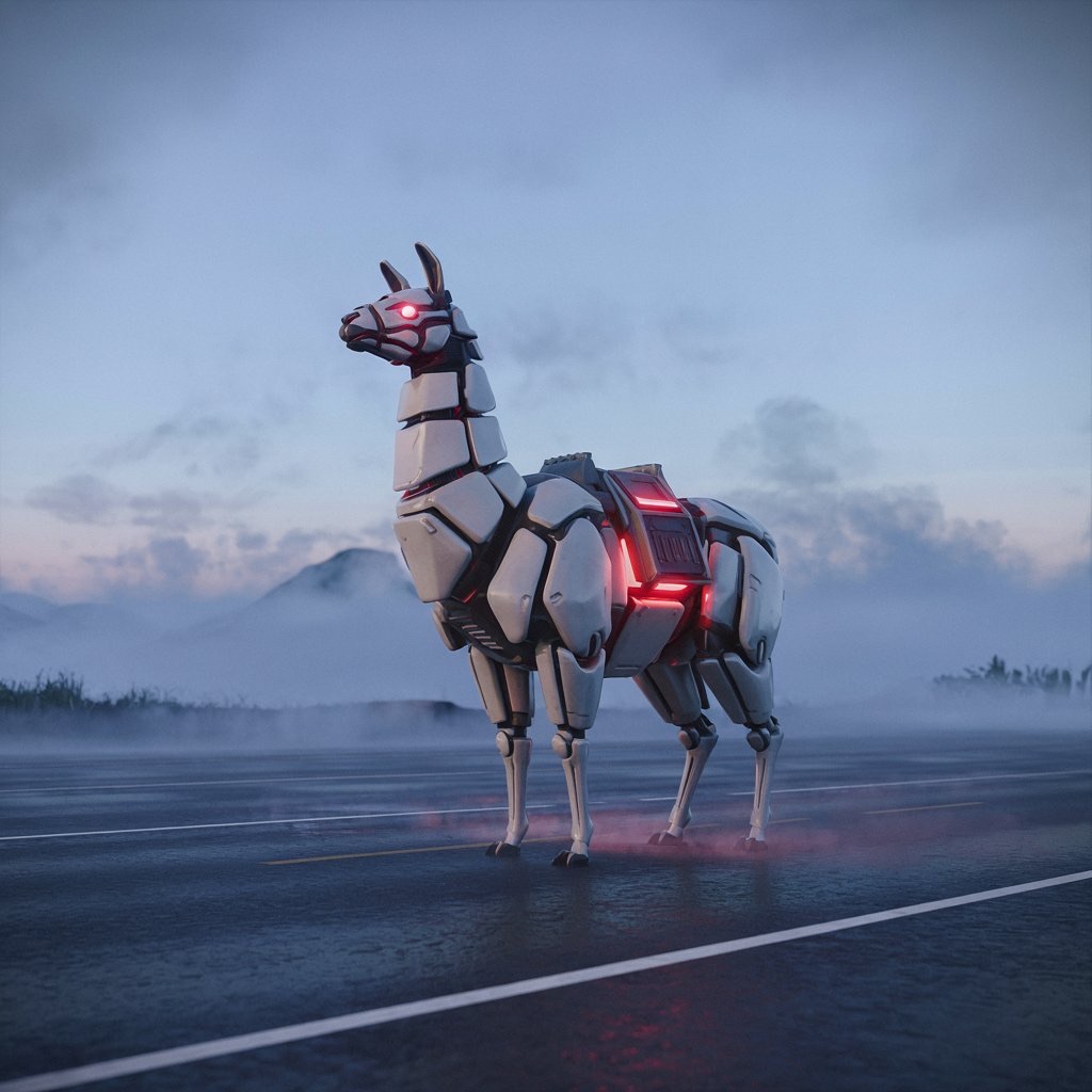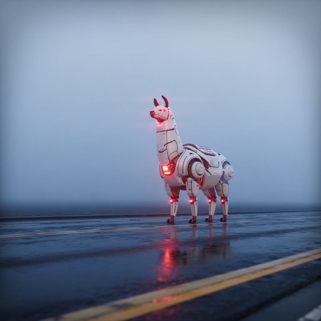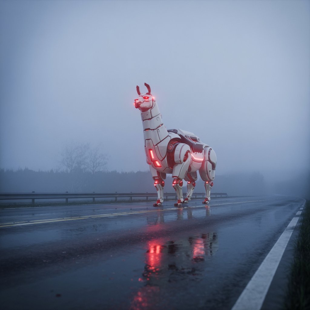 A massive futuristic mechanical llama, designed with sleek white metallic surfaces and glowing red light cores, standing on an empty misty road at twilight. The scene is cinematic, with dramatic soft lighting and atmospheric fog. The camera is set at a low angle, with shallow depth of field. Ultra-detailed, hyperrealistic lighting and reflections. Wide-angle composition, sci-fi mood.
