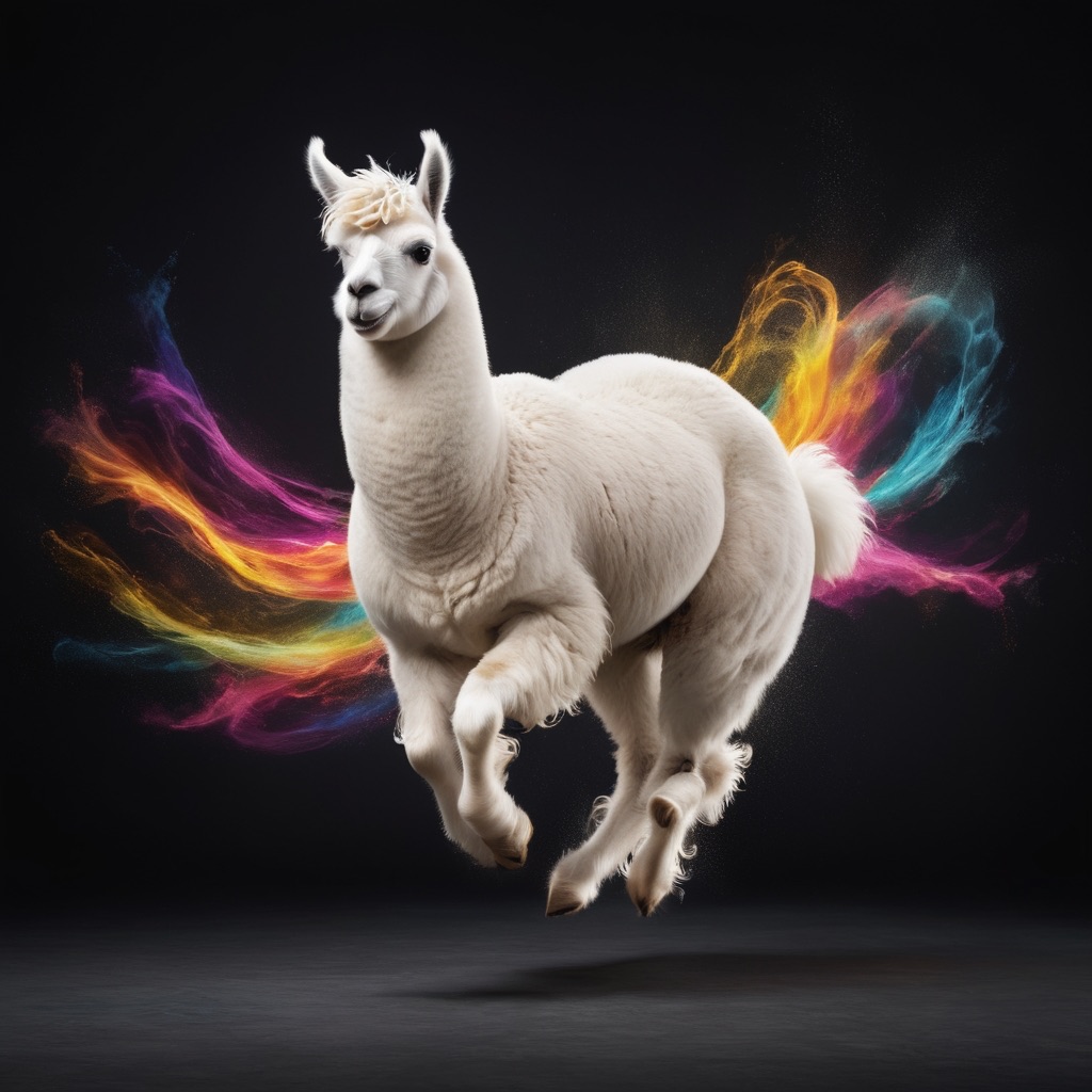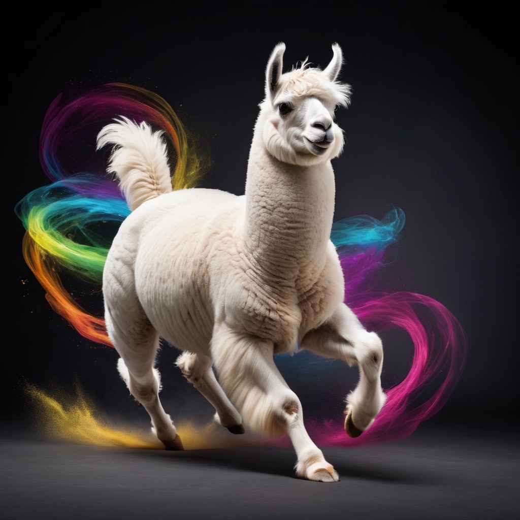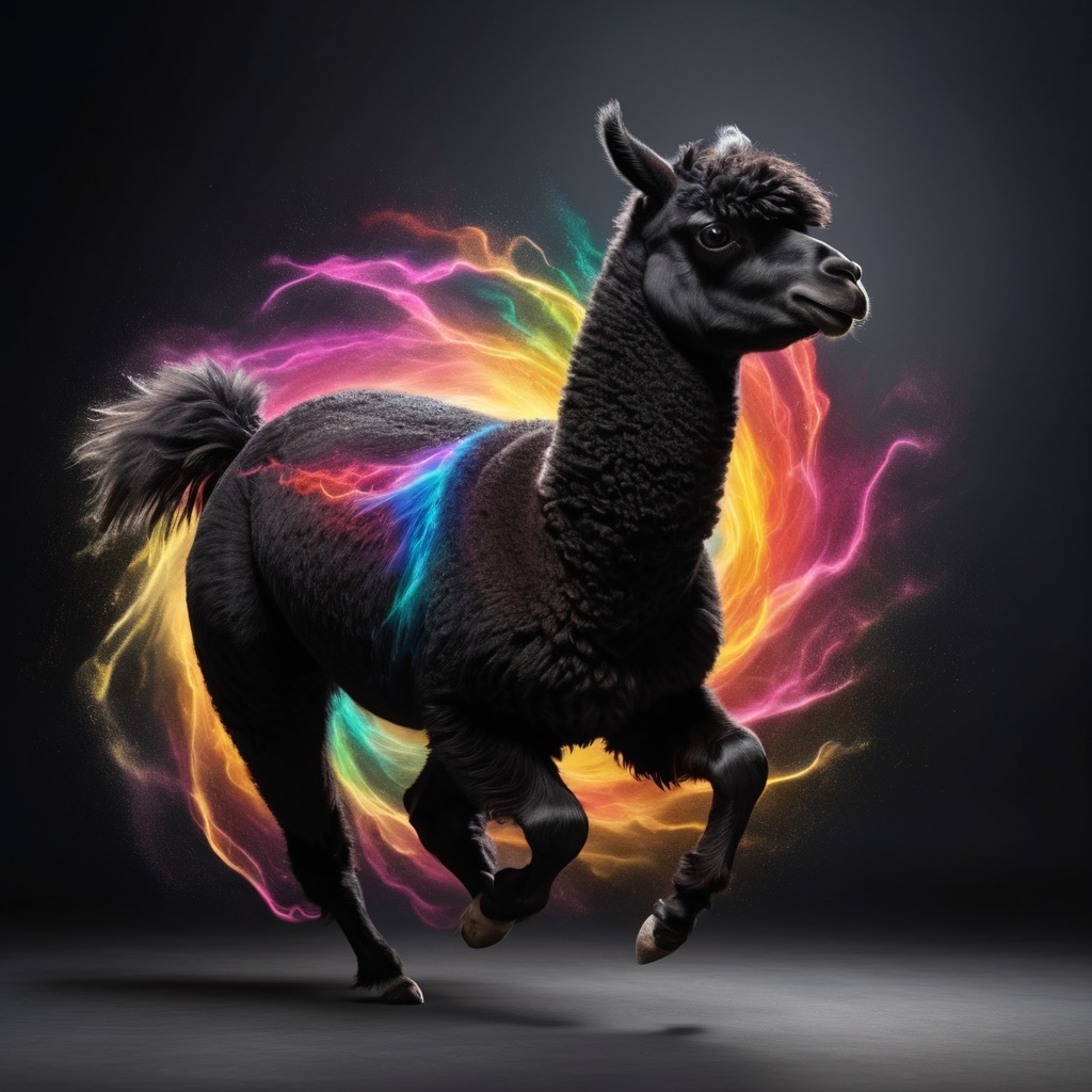 Realistic shot of a dynamic action photo featuring a black/white llama running through the air, surrounded by colorful energy waves that highlight its speed and agility as it glides through space. The dark gray background creates strong contrast, with lighting that adds depth to emphasize motion and movement.