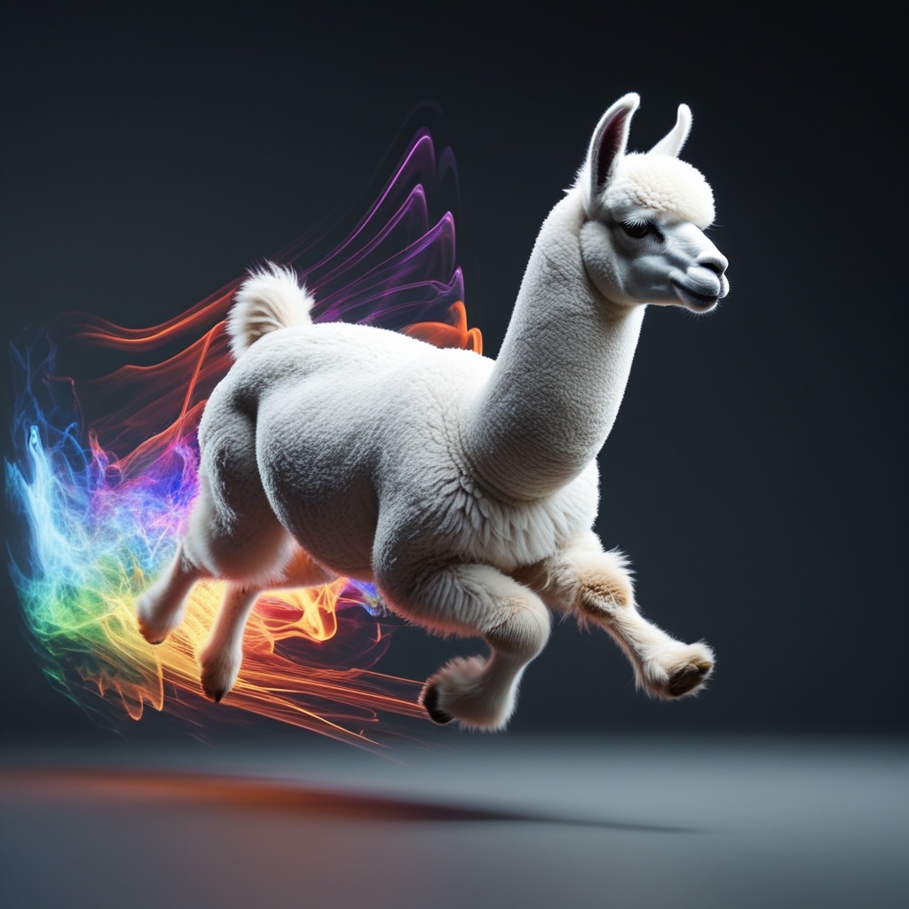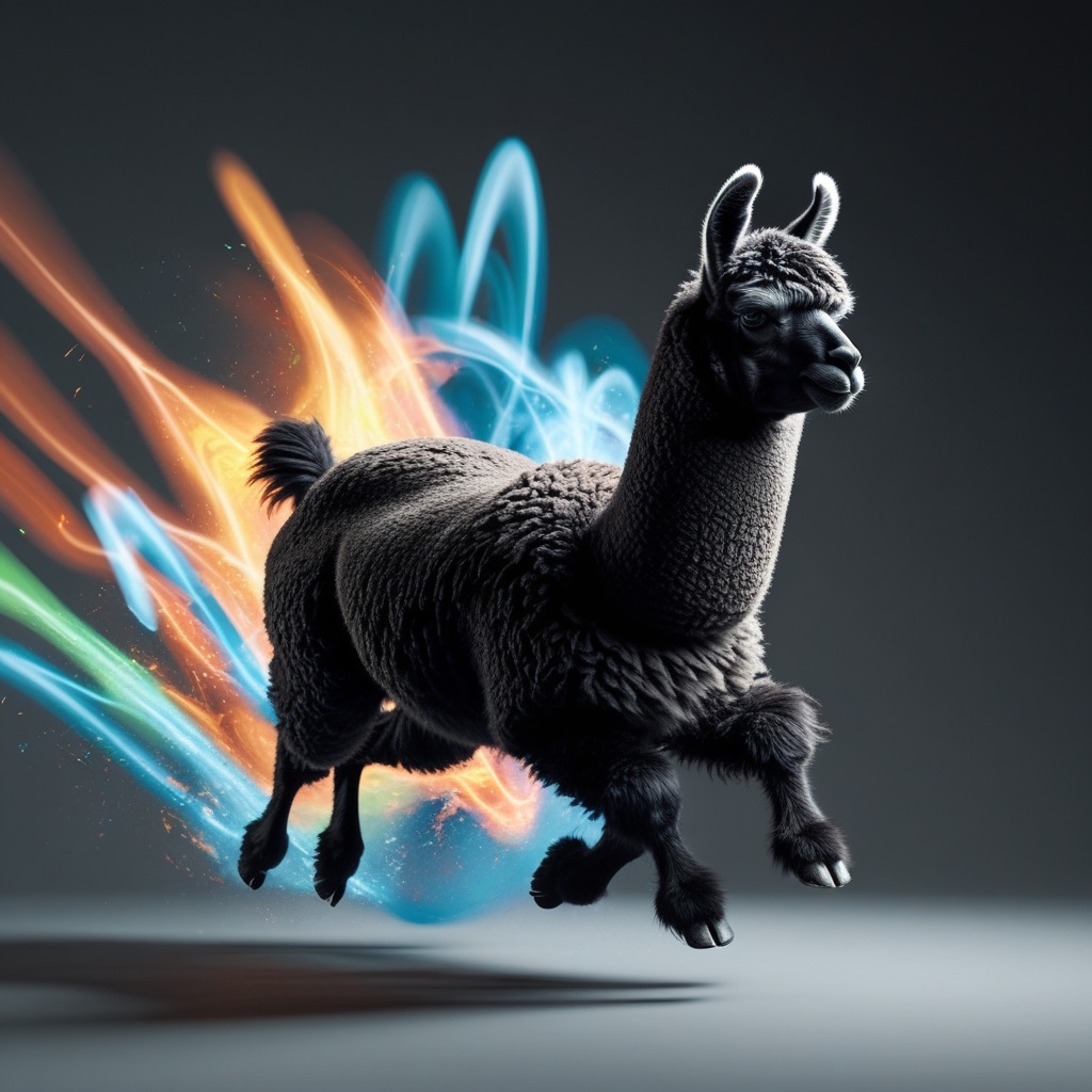 Realistic shot of a dynamic action photo featuring a black/white llama running through the air, surrounded by colorful energy waves that highlight its speed and agility as it glides through space. The dark gray background creates strong contrast, with lighting that adds depth to emphasize motion and movement.
