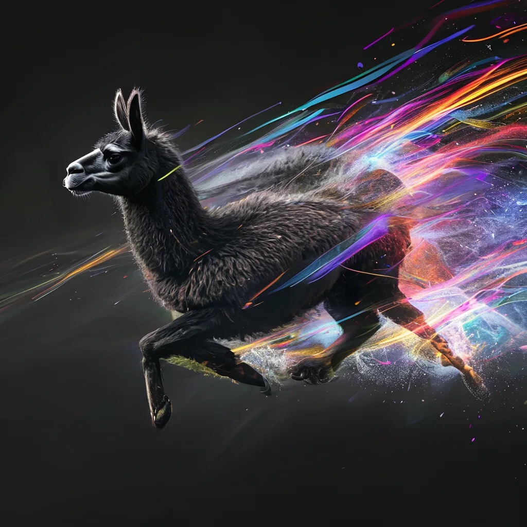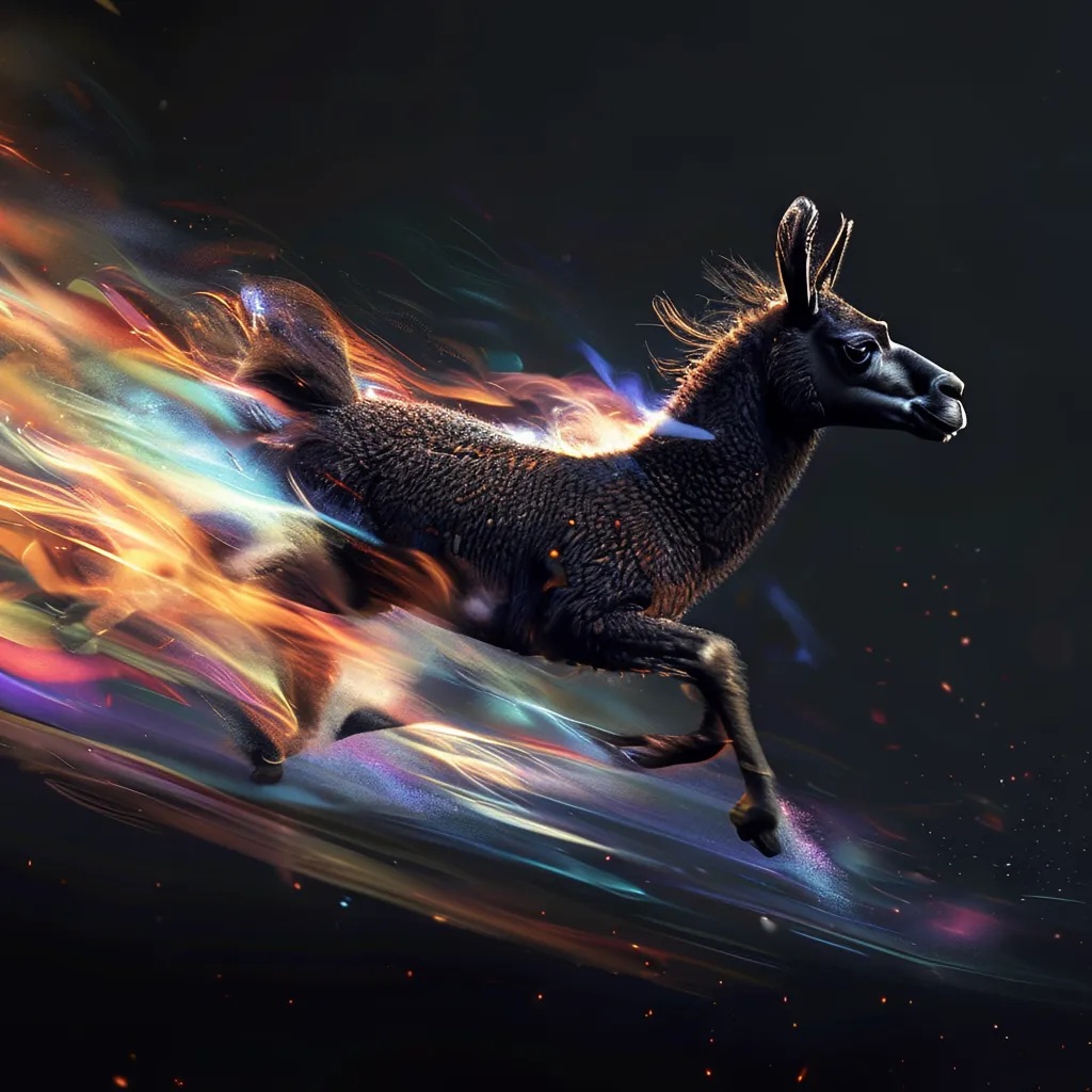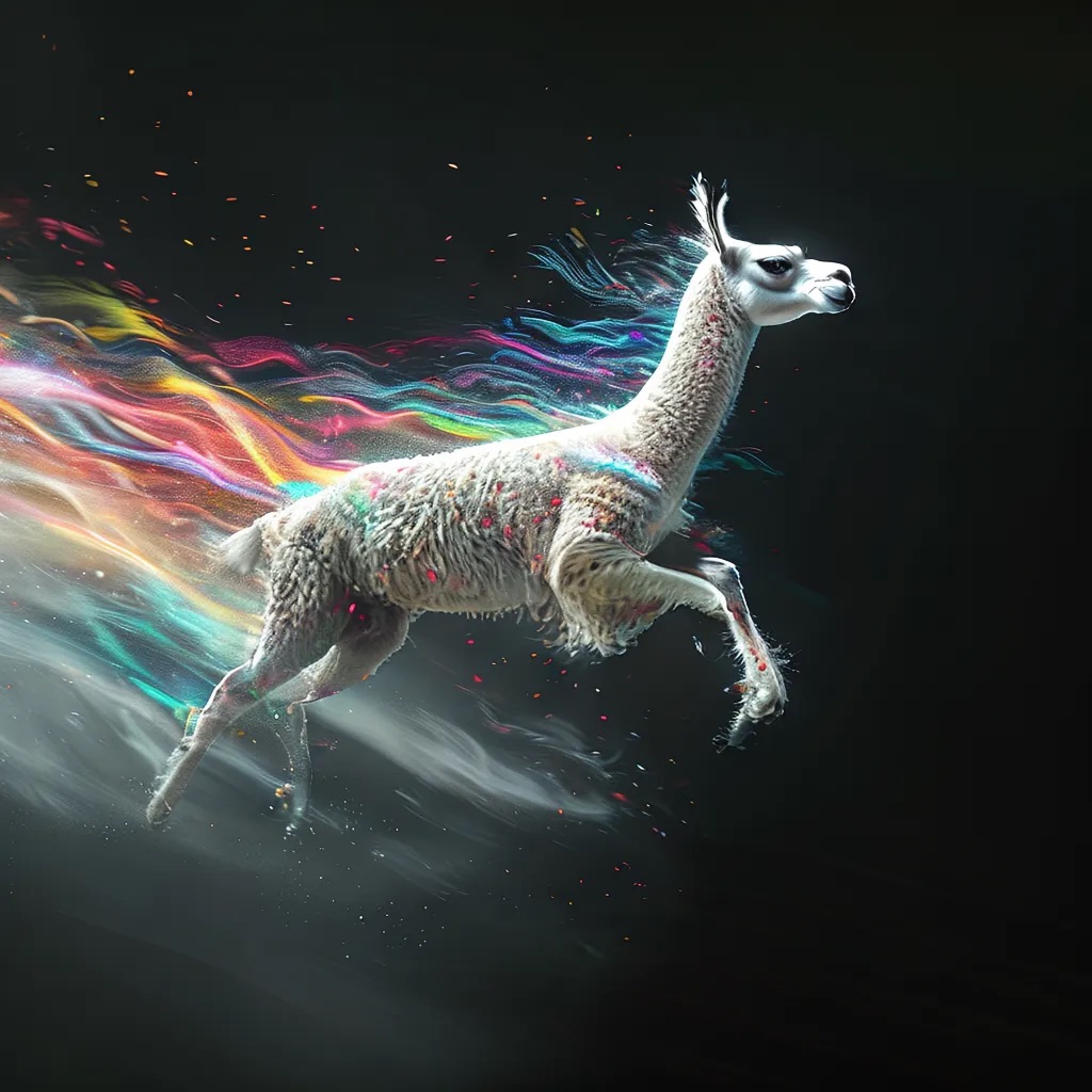Realistic shot of a dynamic action photo featuring a black/white llama running through the air, surrounded by colorful energy waves that highlight its speed and agility as it glides through space. The dark gray background creates strong contrast, with lighting that adds depth to emphasize motion and movement.