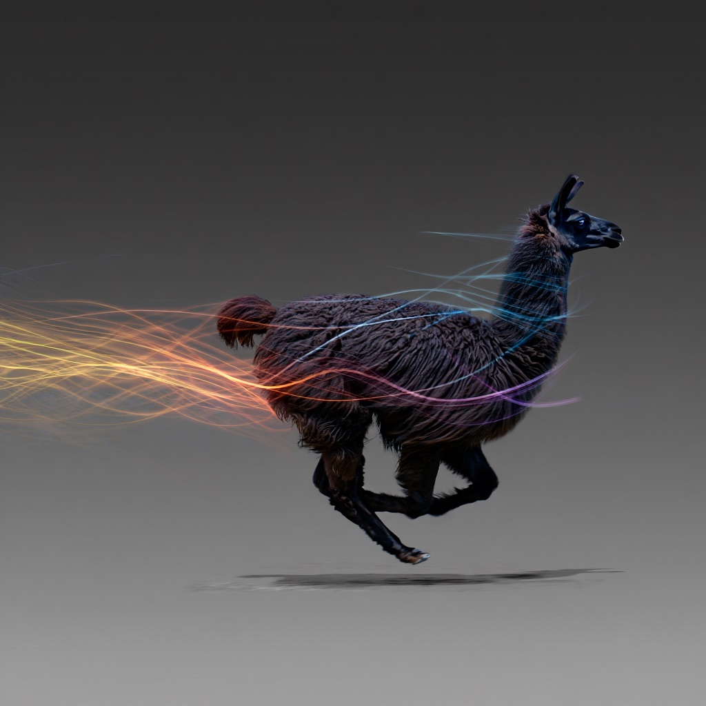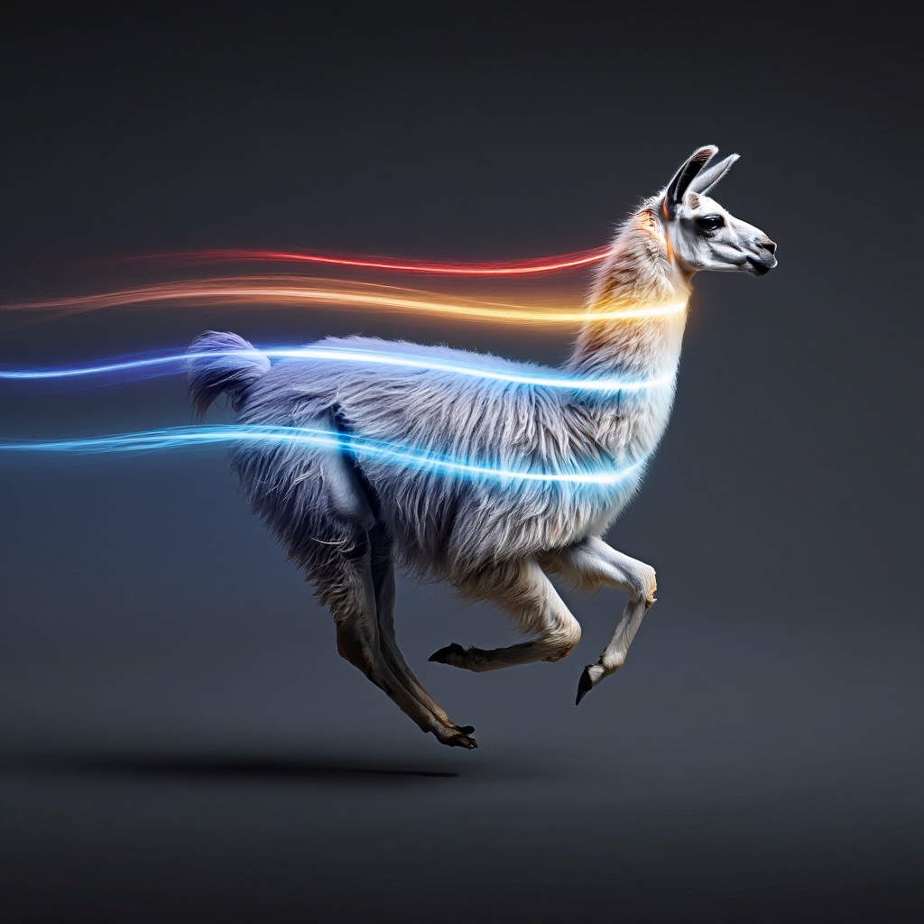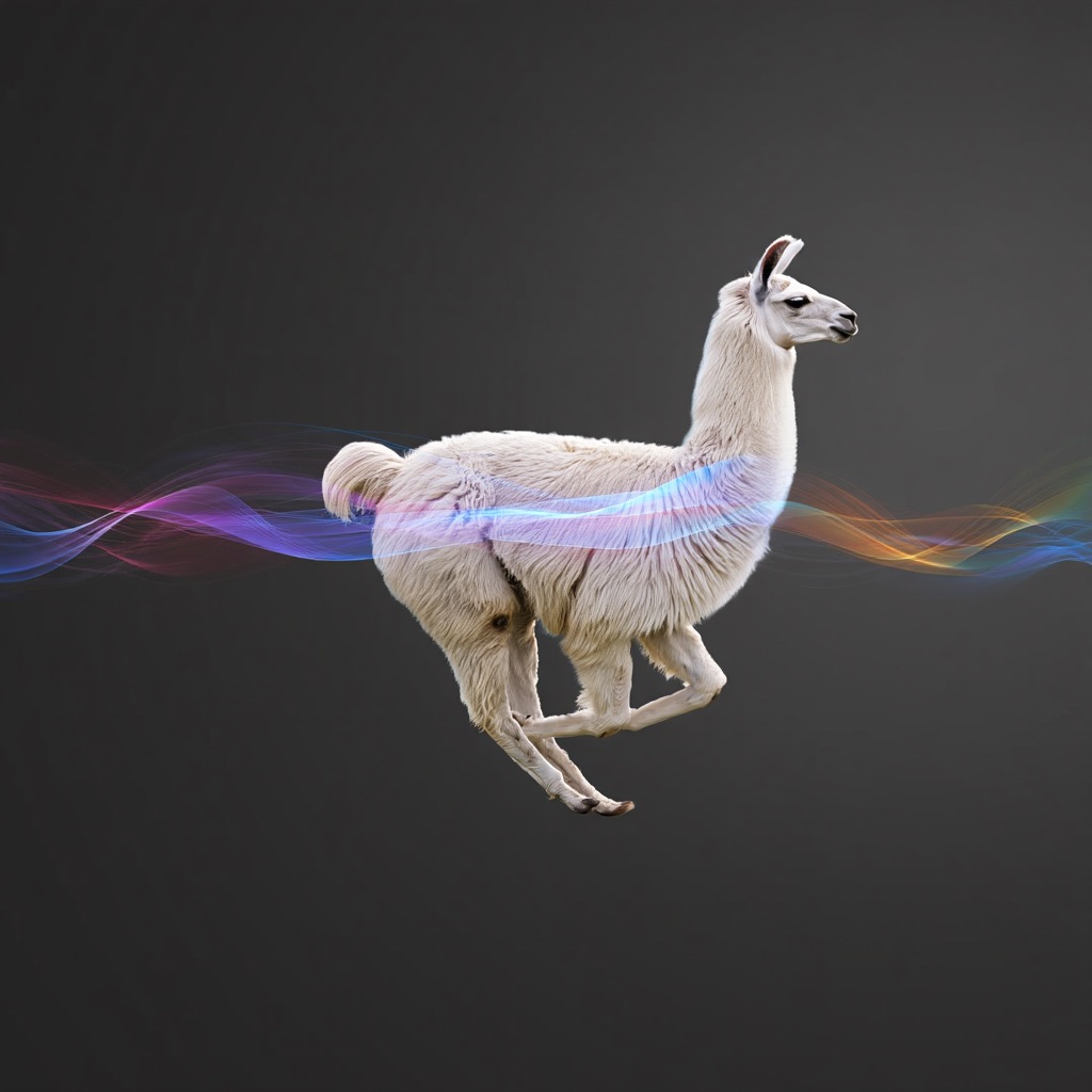 Realistic shot of a dynamic action photo featuring a black/white llama running through the air, surrounded by colorful energy waves that highlight its speed and agility as it glides through space. The dark gray background creates strong contrast, with lighting that adds depth to emphasize motion and movement.