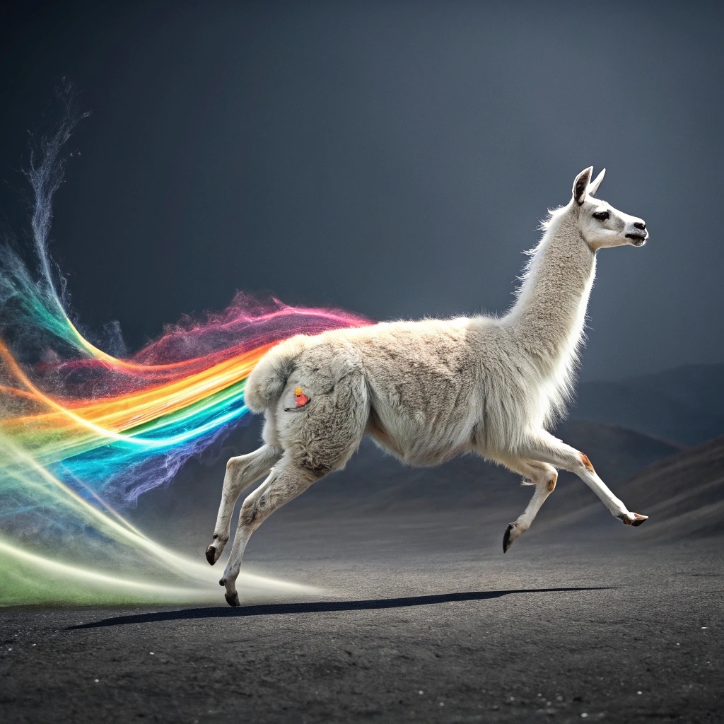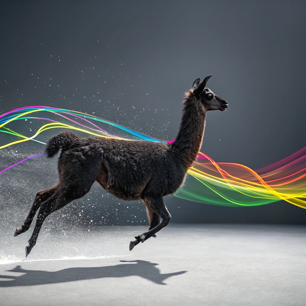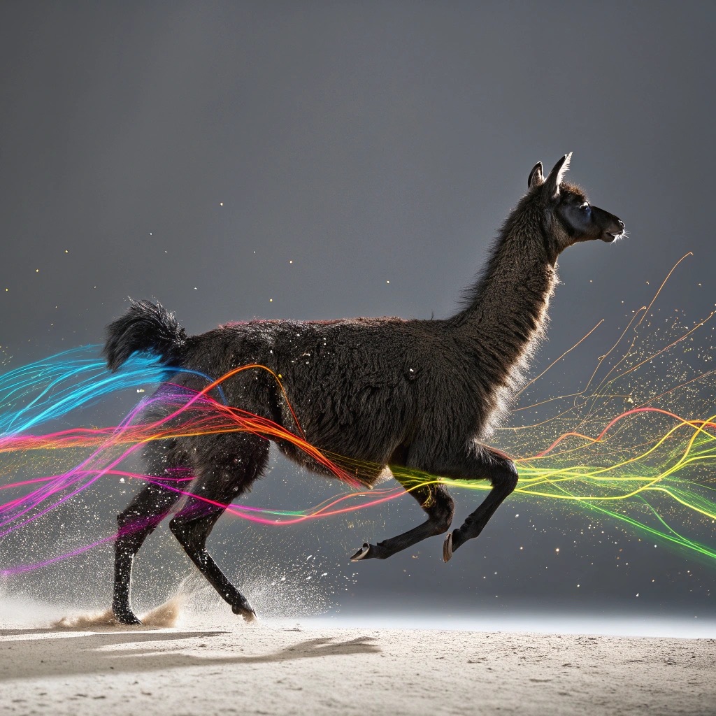 Realistic shot of a dynamic action photo featuring a black/white llama running through the air, surrounded by colorful energy waves that highlight its speed and agility as it glides through space. The dark gray background creates strong contrast, with lighting that adds depth to emphasize motion and movement.