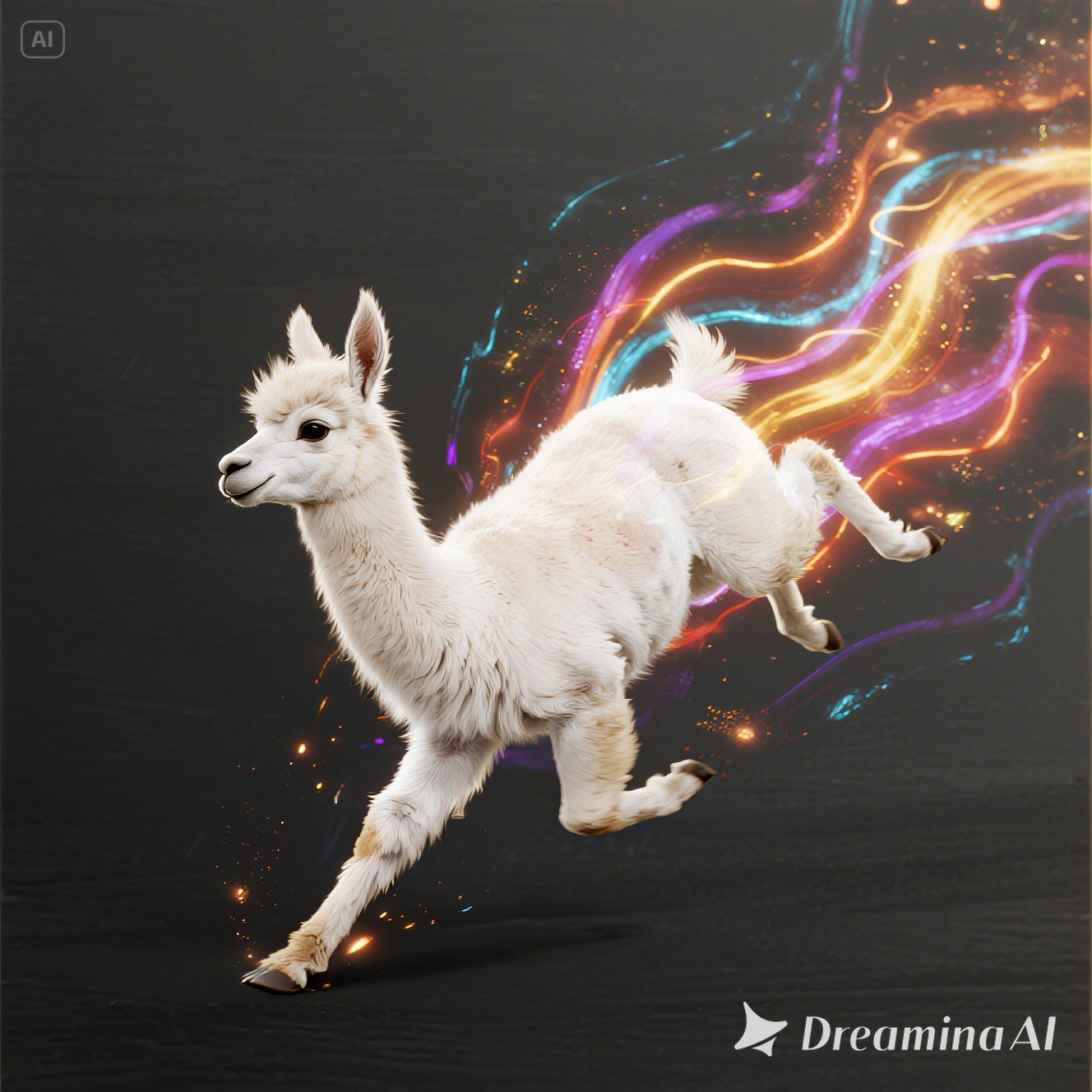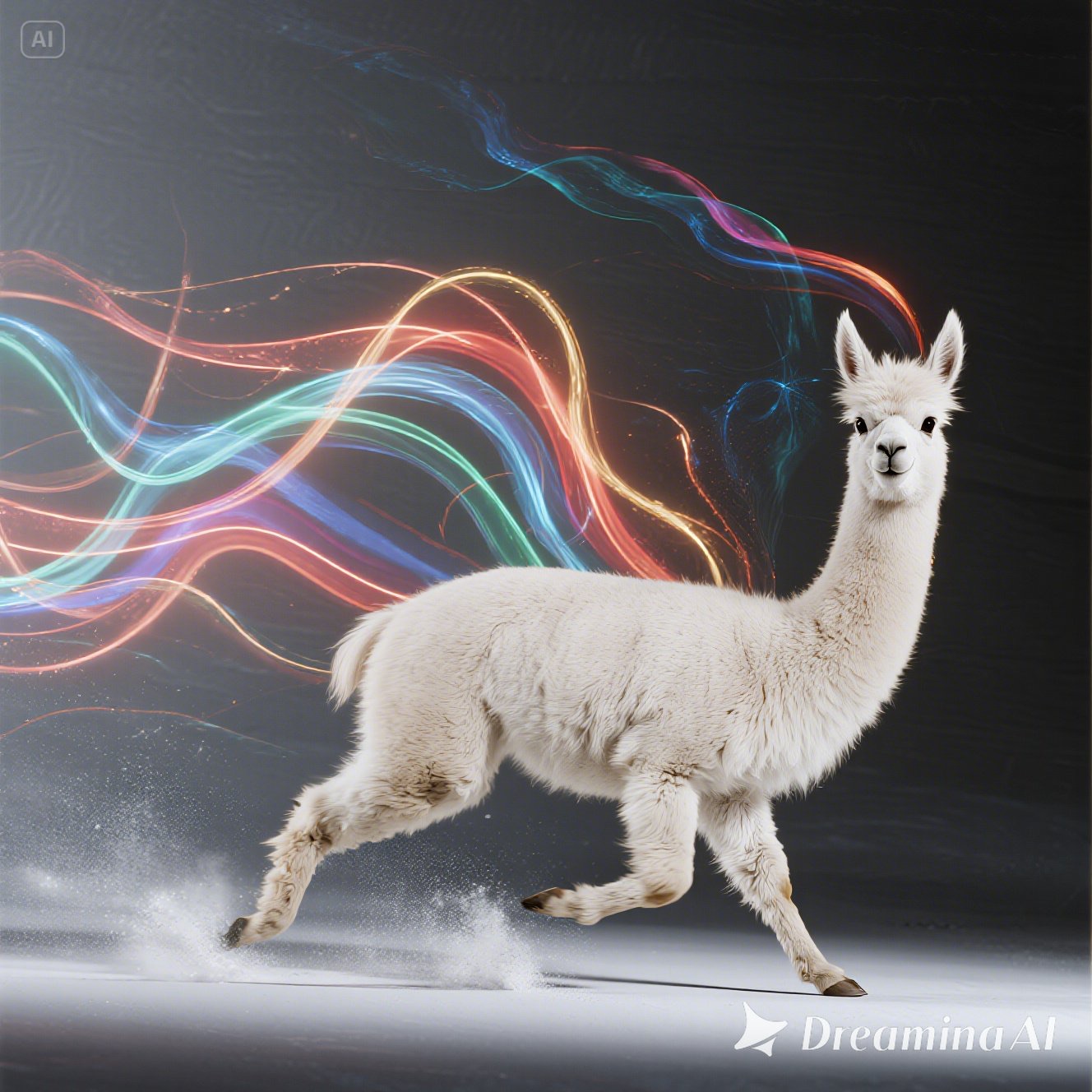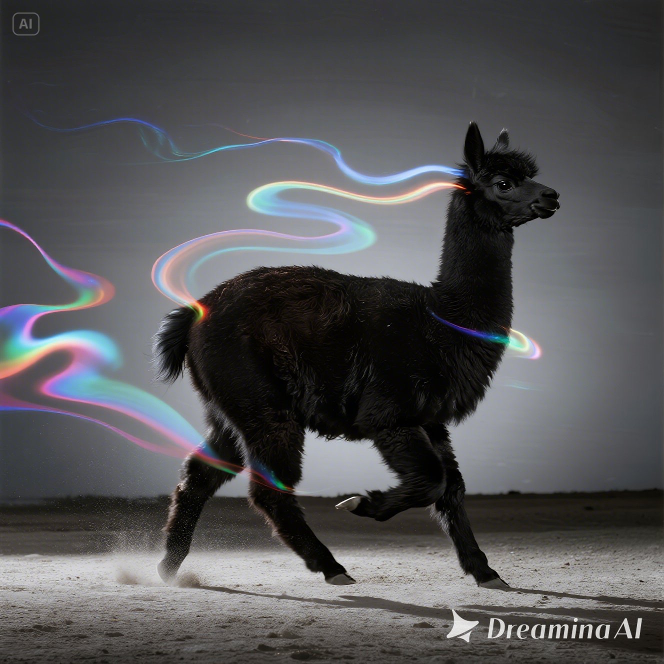Realistic shot of a dynamic action photo featuring a black/white llama running through the air, surrounded by colorful energy waves that highlight its speed and agility as it glides through space. The dark gray background creates strong contrast, with lighting that adds depth to emphasize motion and movement.
