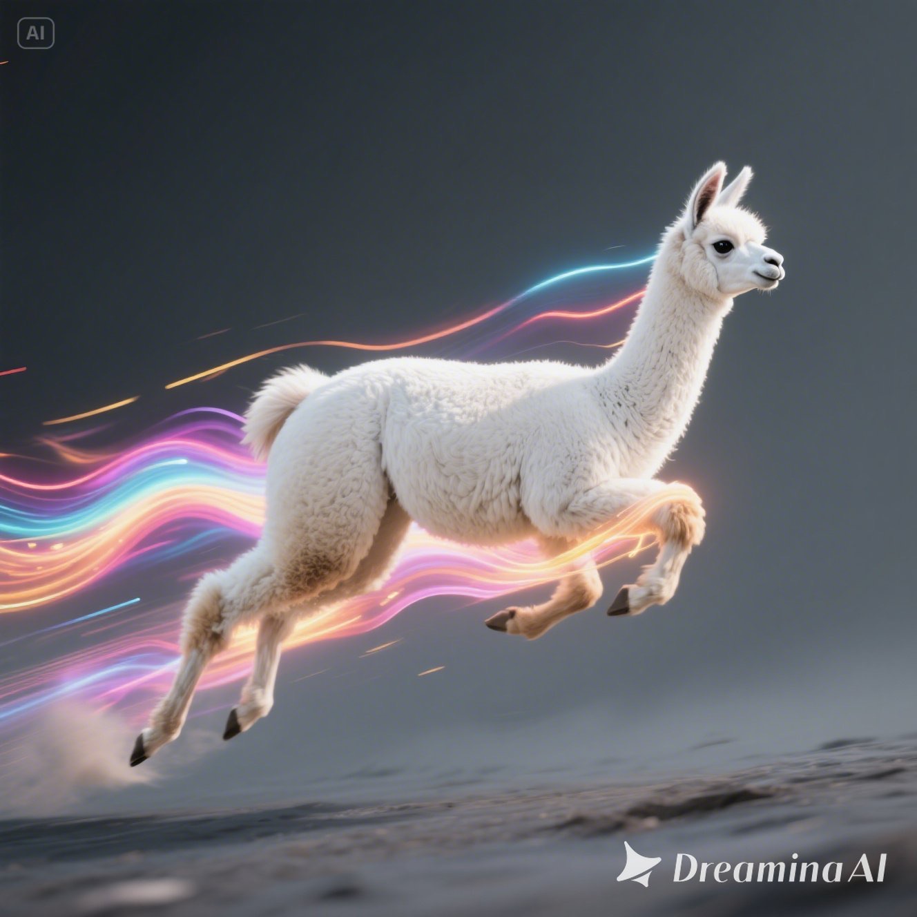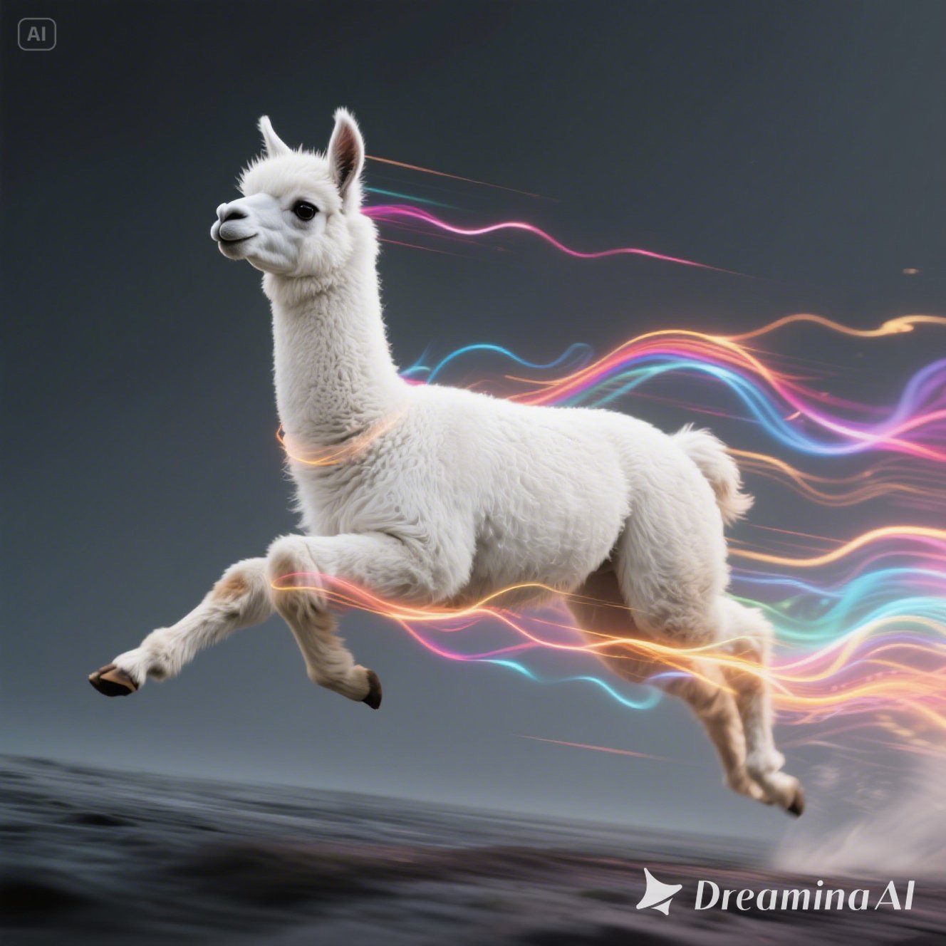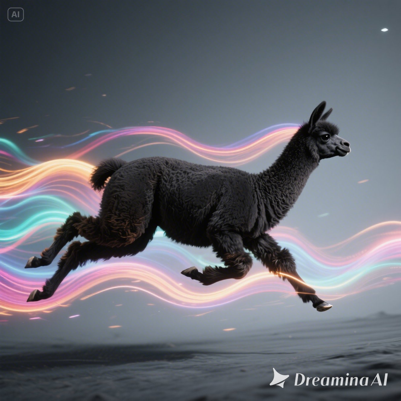 Realistic shot of a dynamic action photo featuring a black/white llama running through the air, surrounded by colorful energy waves that highlight its speed and agility as it glides through space. The dark gray background creates strong contrast, with lighting that adds depth to emphasize motion and movement.