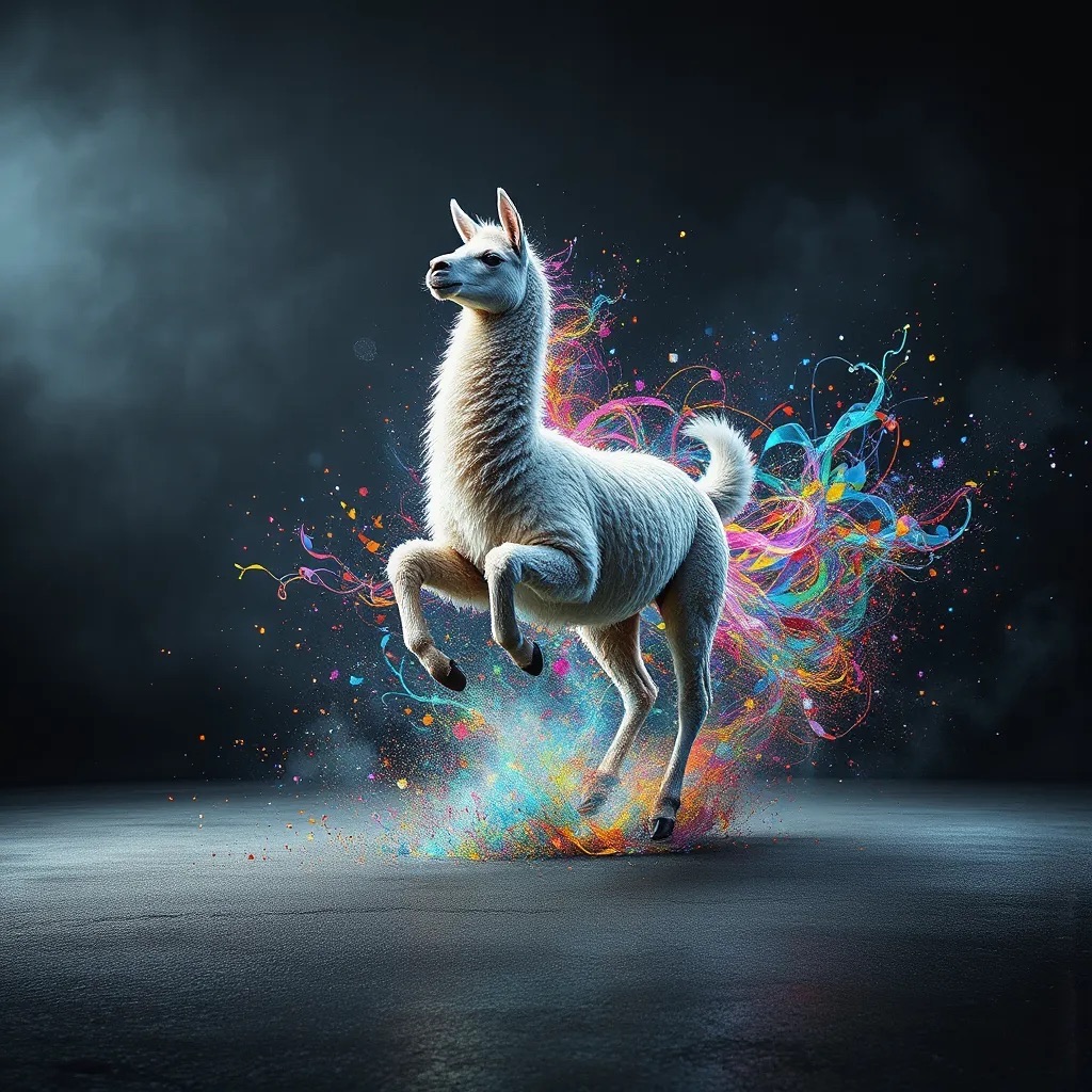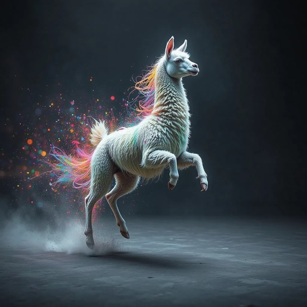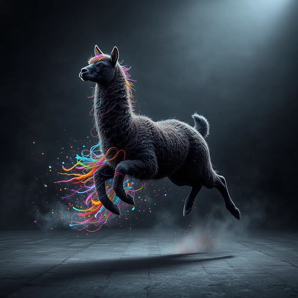 Realistic shot of a dynamic action photo featuring a black/white llama running through the air, surrounded by colorful energy waves that highlight its speed and agility as it glides through space. The dark gray background creates strong contrast, with lighting that adds depth to emphasize motion and movement.