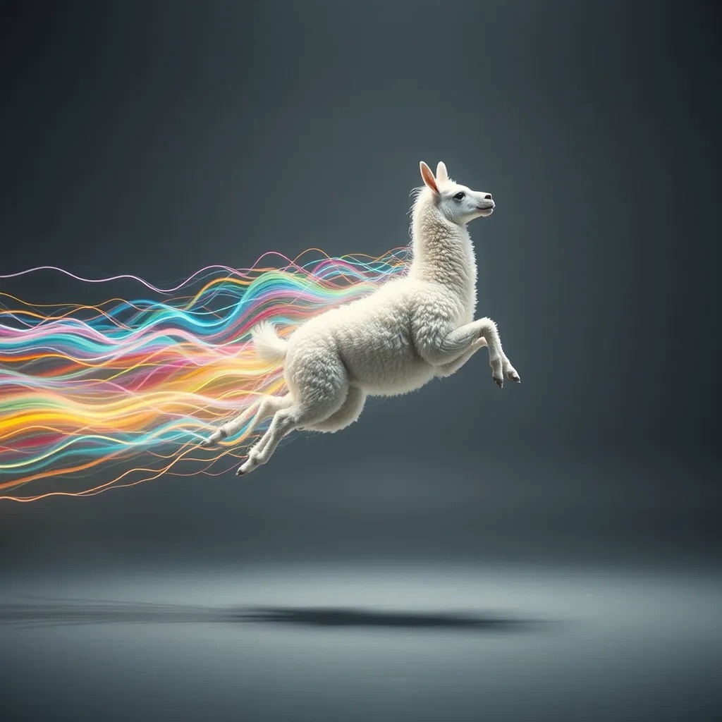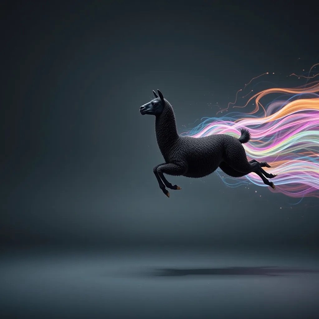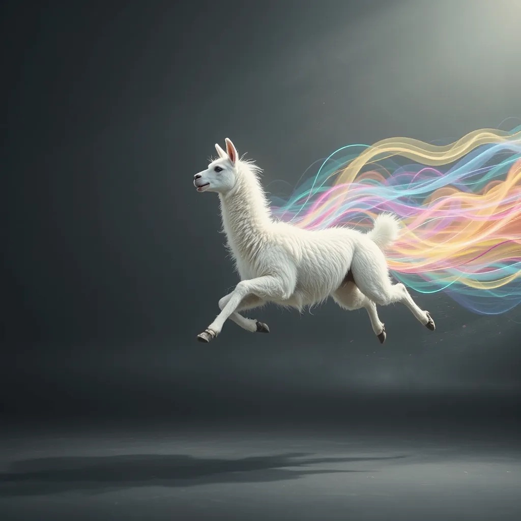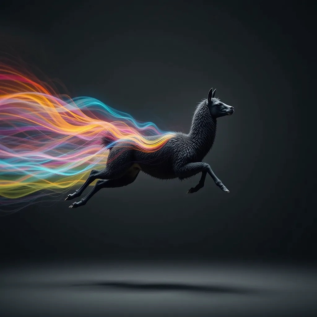 Realistic shot of a dynamic action photo featuring a black/white llama running through the air, surrounded by colorful energy waves that highlight its speed and agility as it glides through space. The dark gray background creates strong contrast, with lighting that adds depth to emphasize motion and movement.