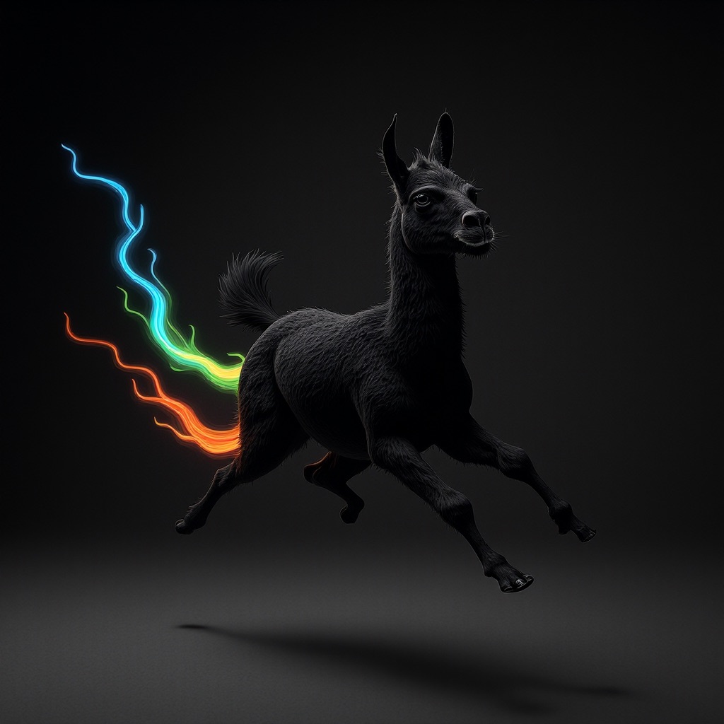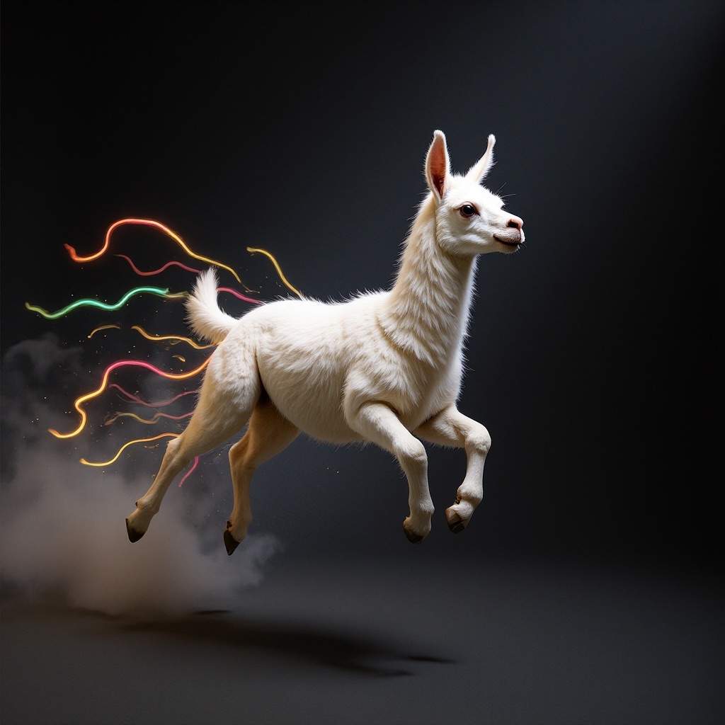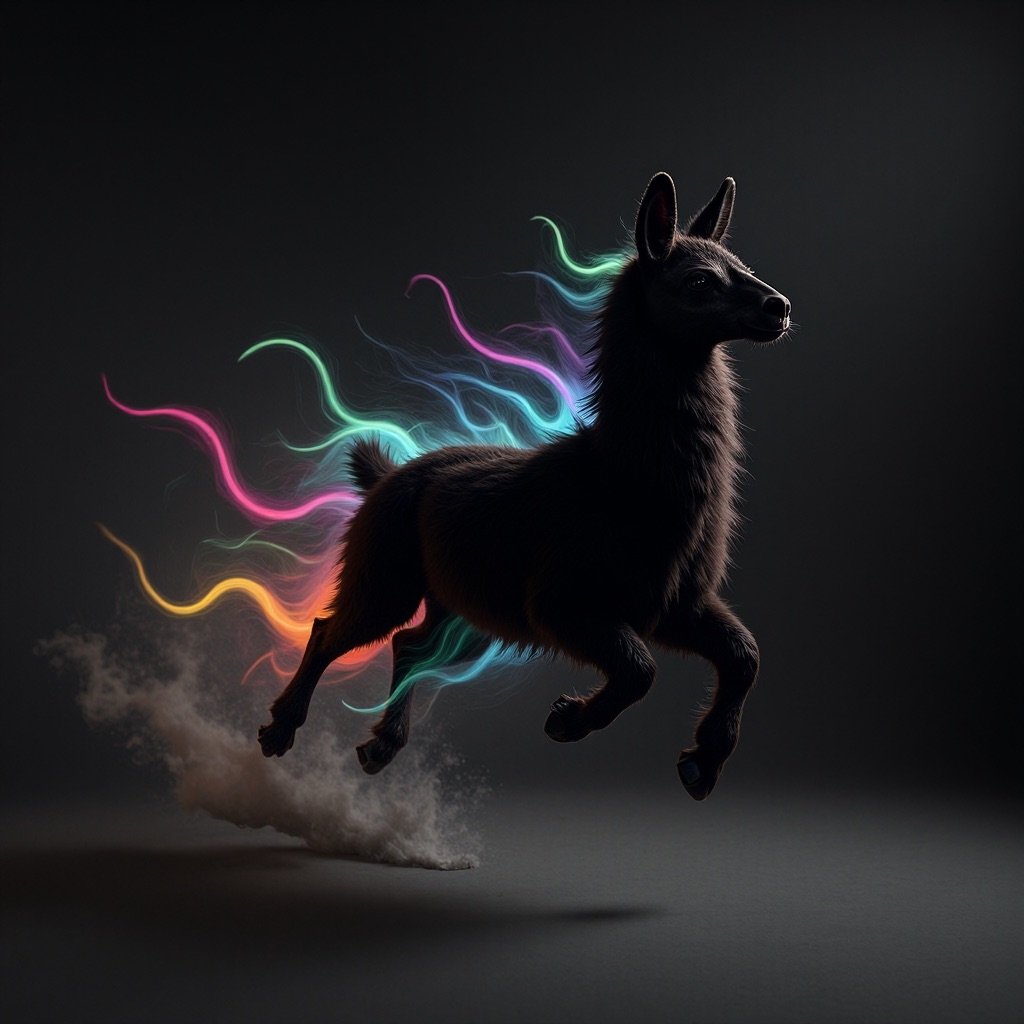 Realistic shot of a dynamic action photo featuring a black/white llama running through the air, surrounded by colorful energy waves that highlight its speed and agility as it glides through space. The dark gray background creates strong contrast, with lighting that adds depth to emphasize motion and movement.