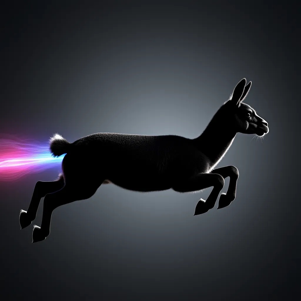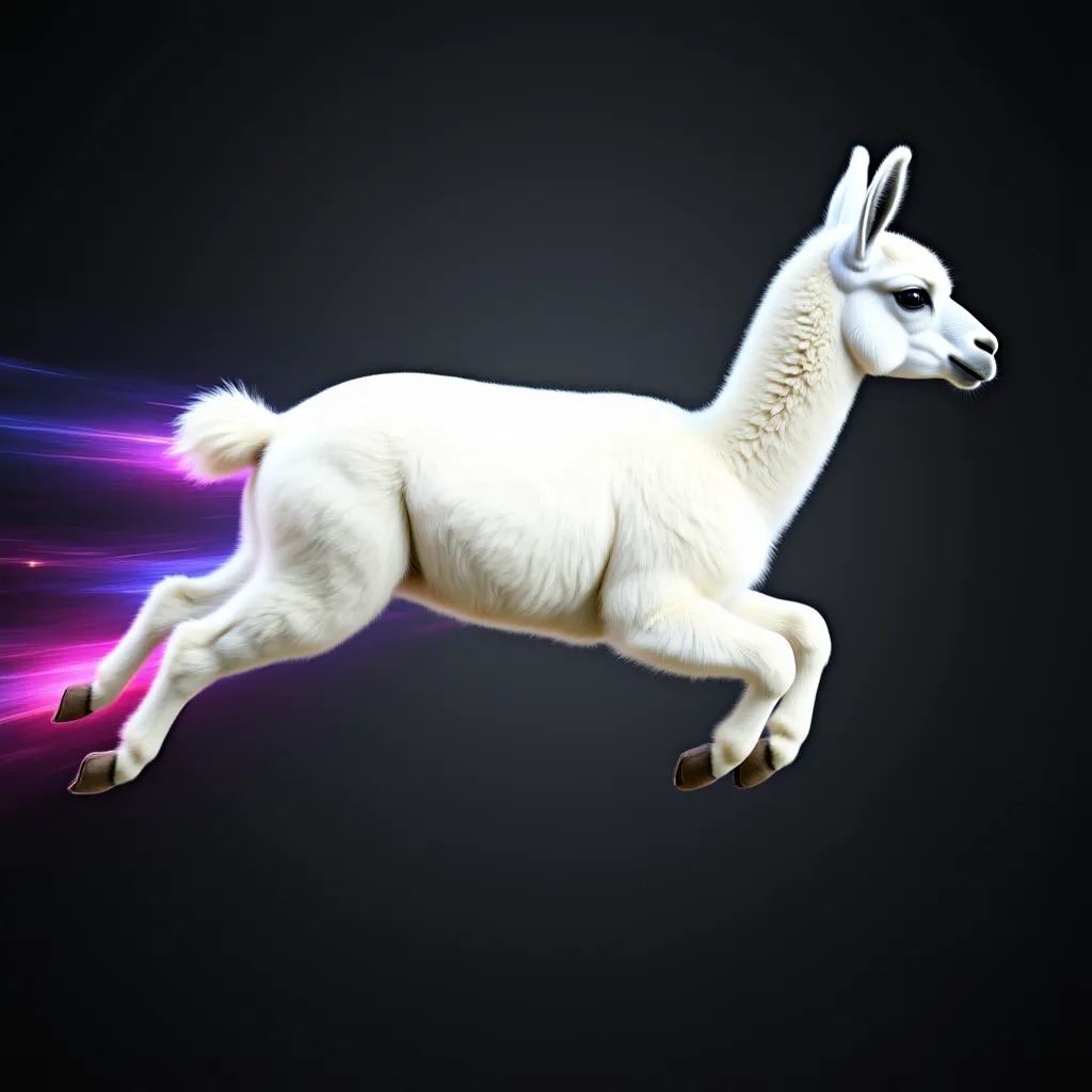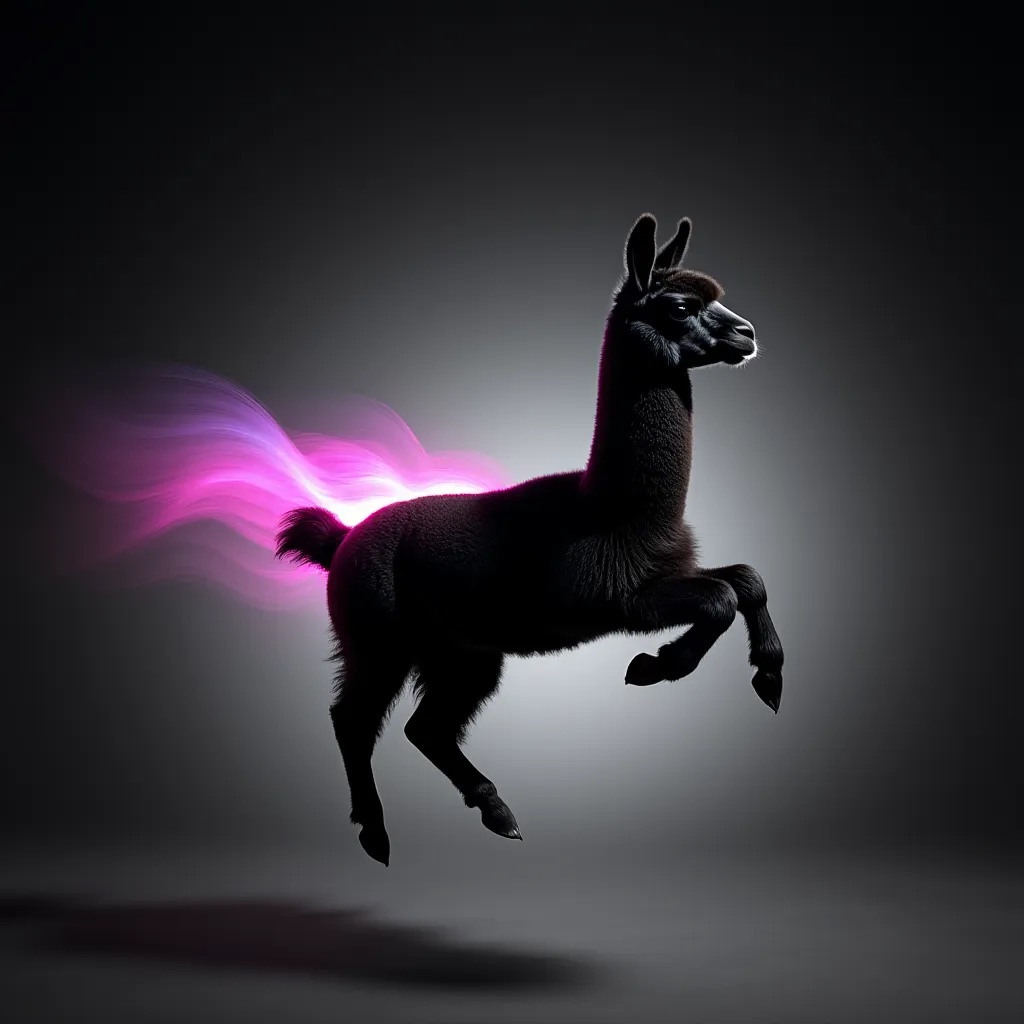 Realistic shot of a dynamic action photo featuring a black/white llama running through the air, surrounded by colorful energy waves that highlight its speed and agility as it glides through space. The dark gray background creates strong contrast, with lighting that adds depth to emphasize motion and movement.
