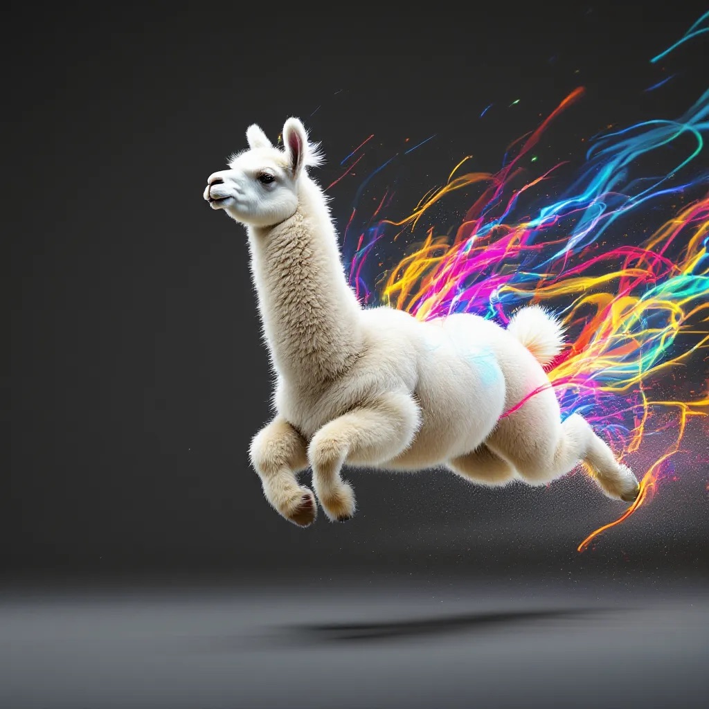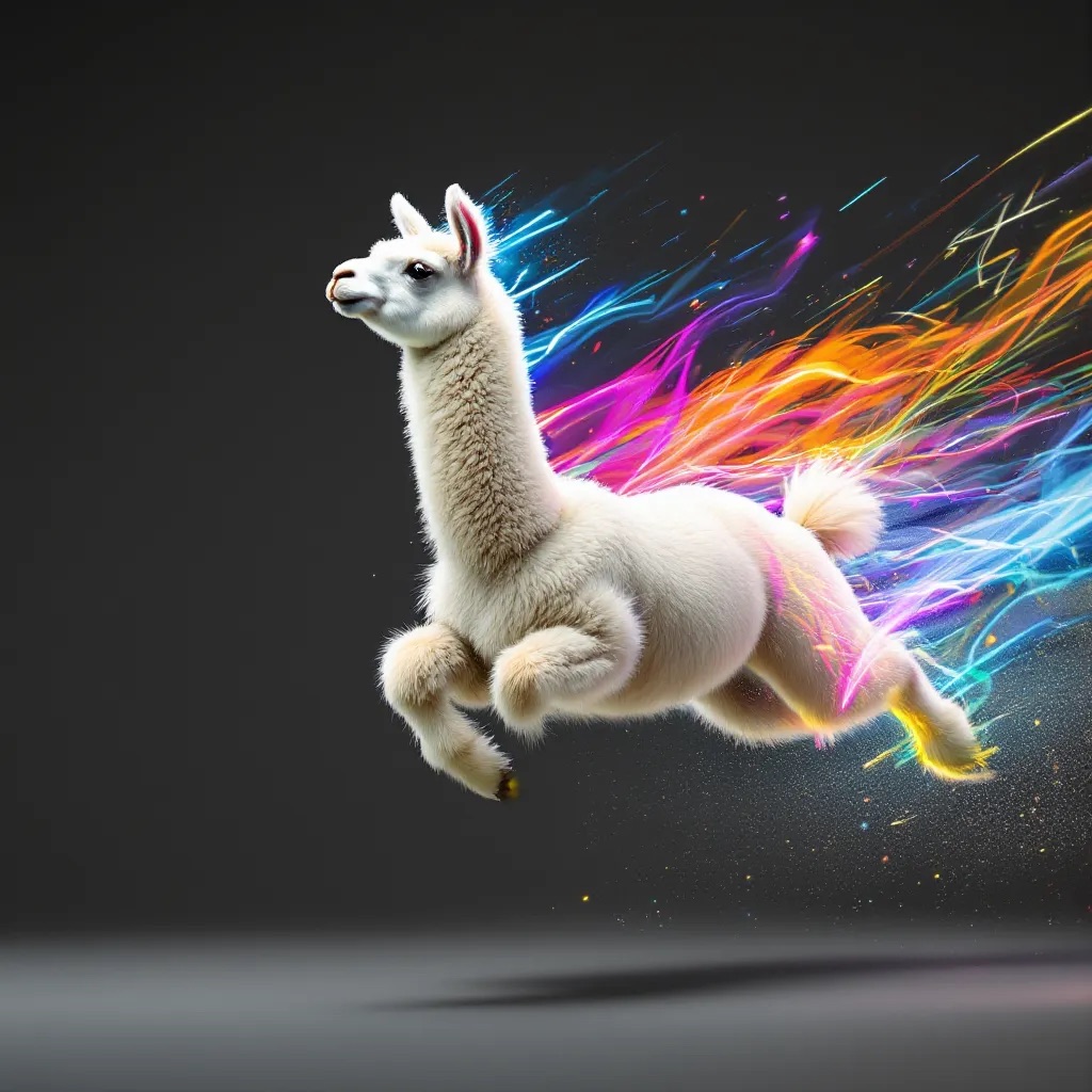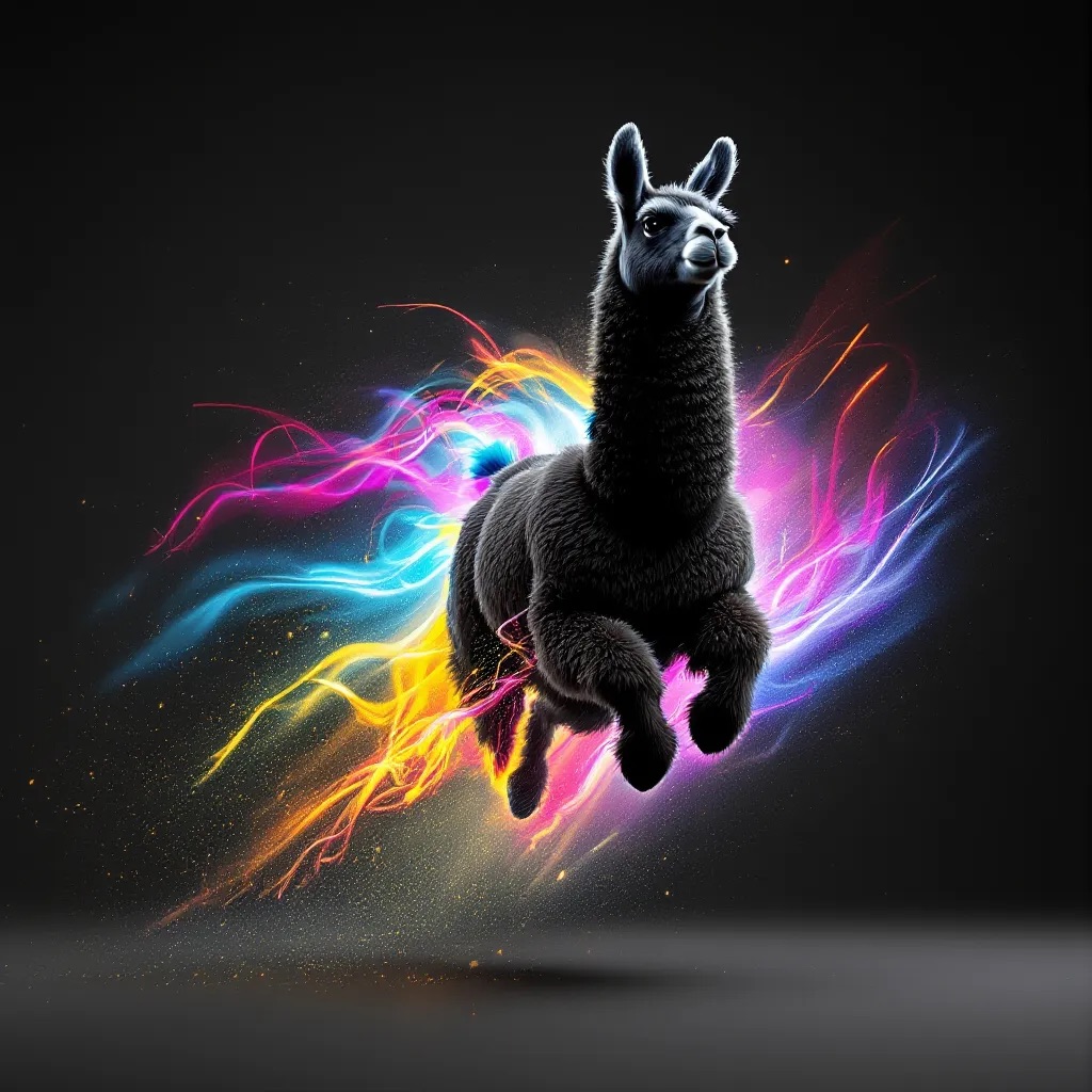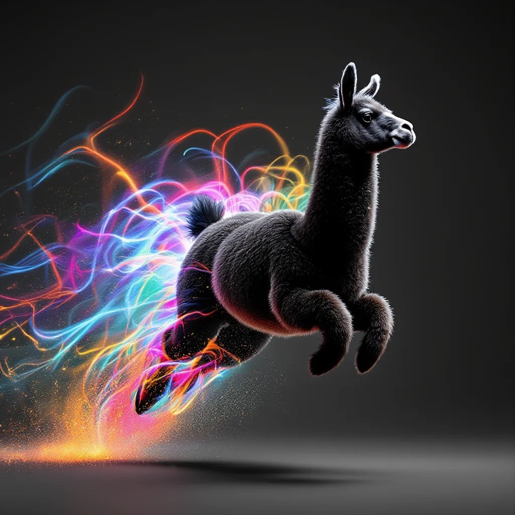Realistic shot of a dynamic action photo featuring a black/white llama running through the air, surrounded by colorful energy waves that highlight its speed and agility as it glides through space. The dark gray background creates strong contrast, with lighting that adds depth to emphasize motion and movement.