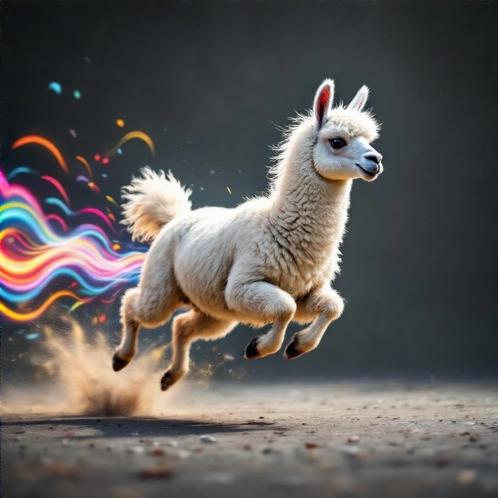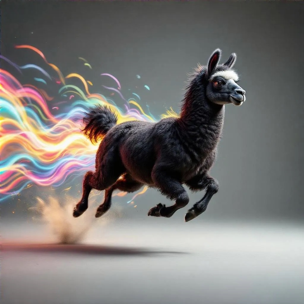 Realistic shot of a dynamic action photo featuring a black/white llama running through the air, surrounded by colorful energy waves that highlight its speed and agility as it glides through space. The dark gray background creates strong contrast, with lighting that adds depth to emphasize motion and movement.