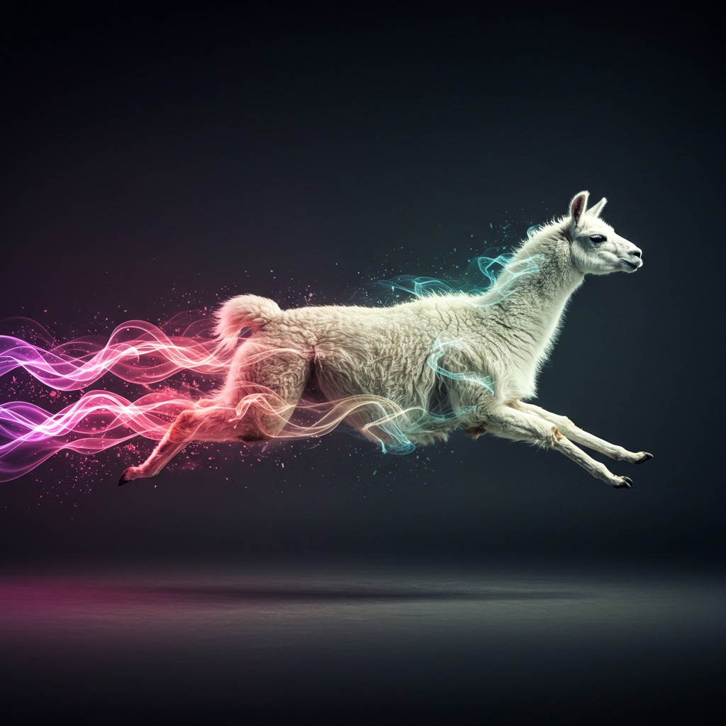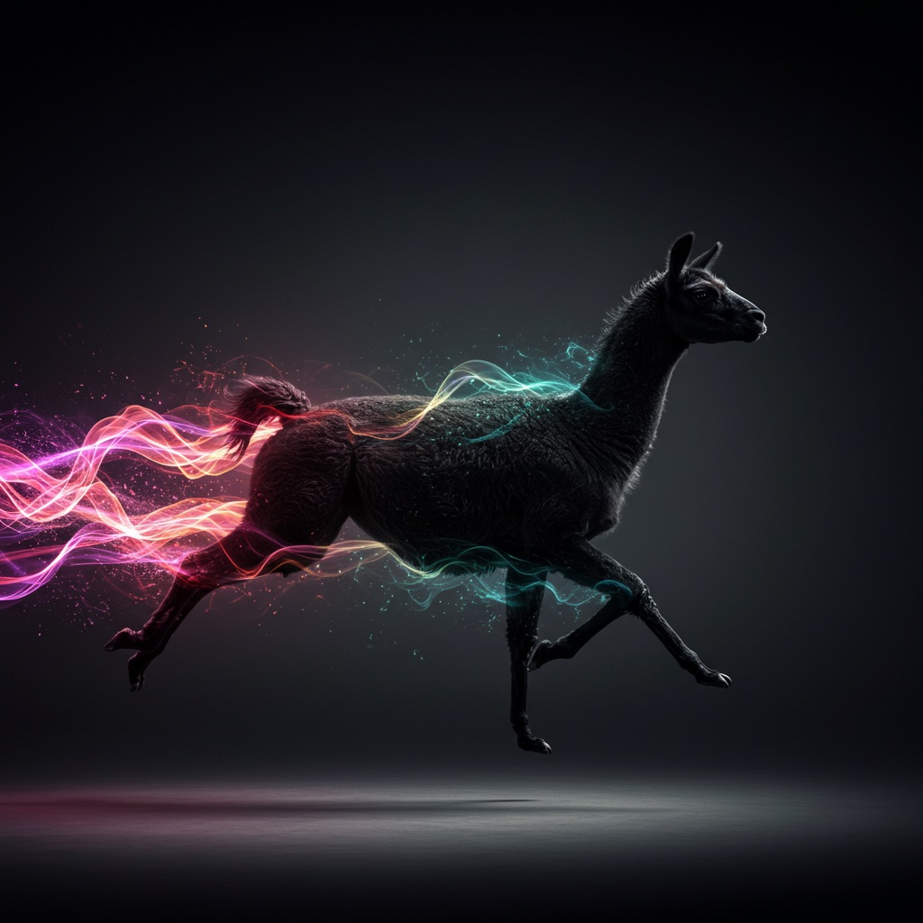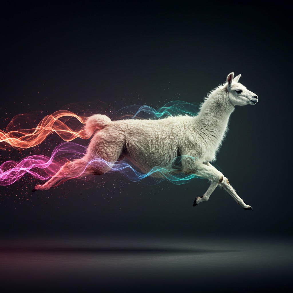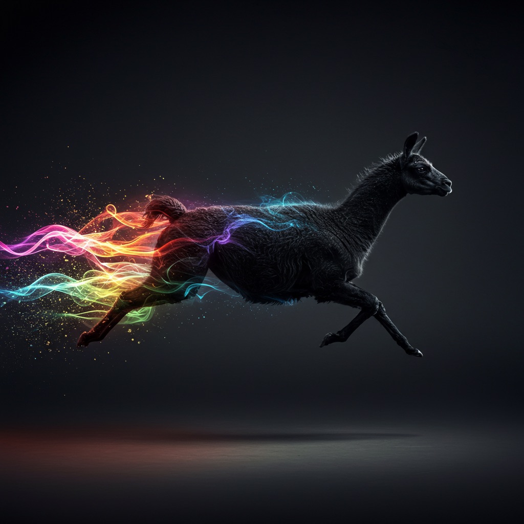 Realistic shot of a dynamic action photo featuring a black/white llama running through the air, surrounded by colorful energy waves that highlight its speed and agility as it glides through space. The dark gray background creates strong contrast, with lighting that adds depth to emphasize motion and movement.