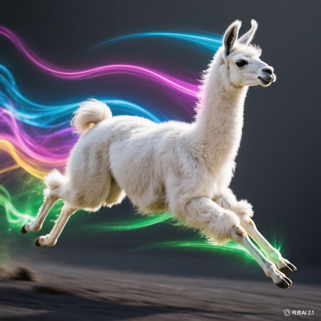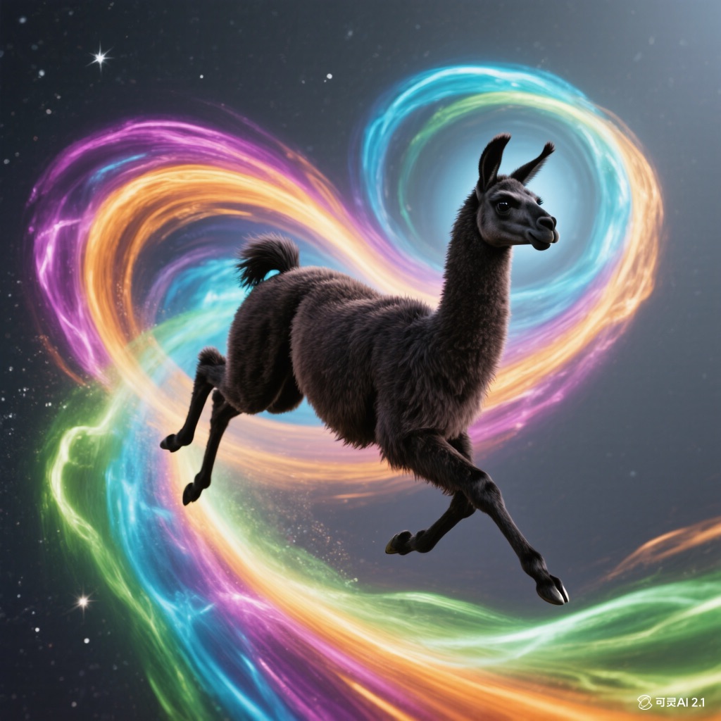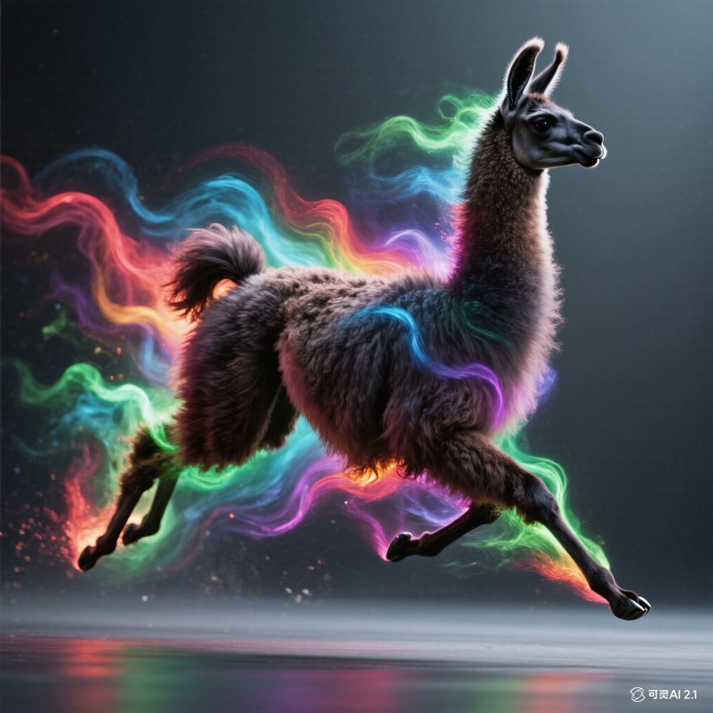 Realistic shot of a dynamic action photo featuring a black/white llama running through the air, surrounded by colorful energy waves that highlight its speed and agility as it glides through space. The dark gray background creates strong contrast, with lighting that adds depth to emphasize motion and movement.