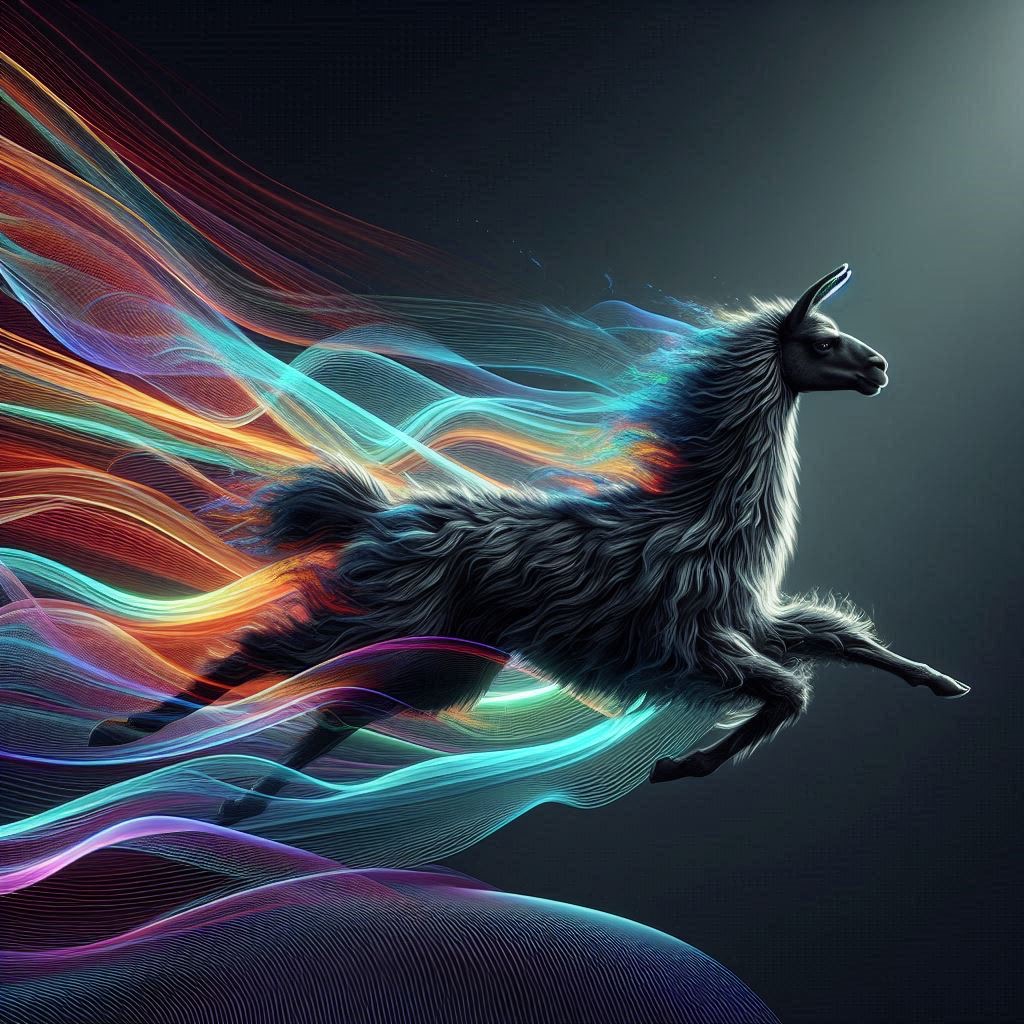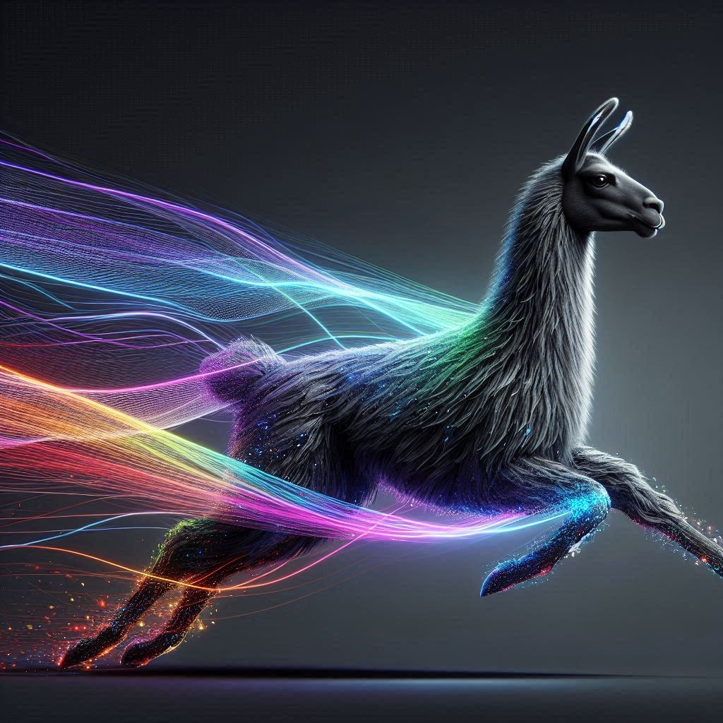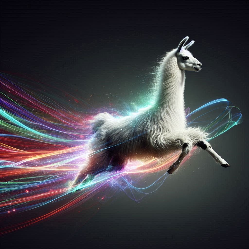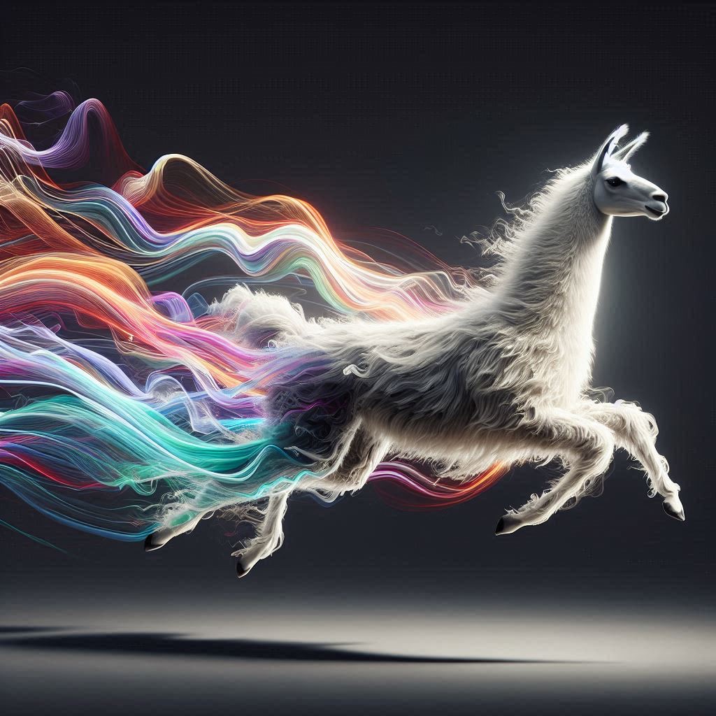 Realistic shot of a dynamic action photo featuring a black/white llama running through the air, surrounded by colorful energy waves that highlight its speed and agility as it glides through space. The dark gray background creates strong contrast, with lighting that adds depth to emphasize motion and movement.