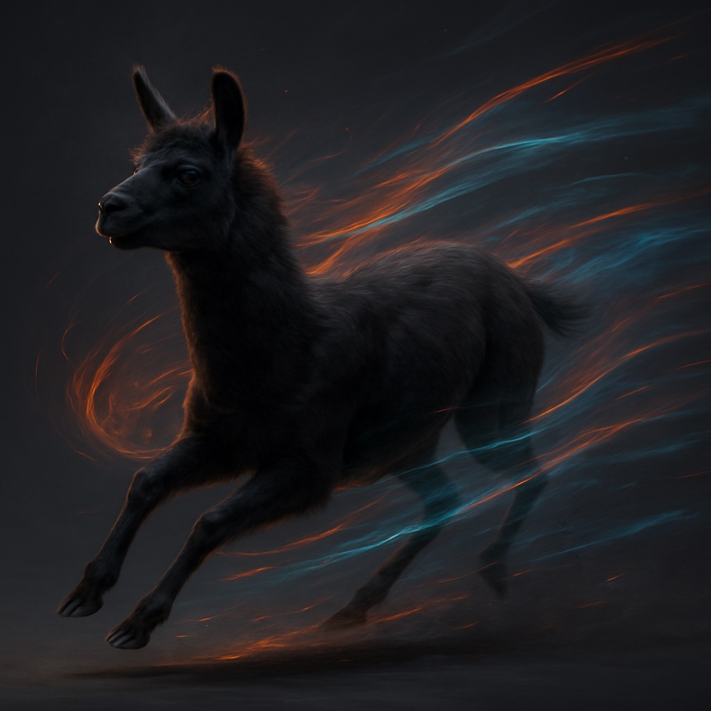 Realistic shot of a dynamic action photo featuring a black/white llama running through the air, surrounded by colorful energy waves that highlight its speed and agility as it glides through space. The dark gray background creates strong contrast, with lighting that adds depth to emphasize motion and movement.