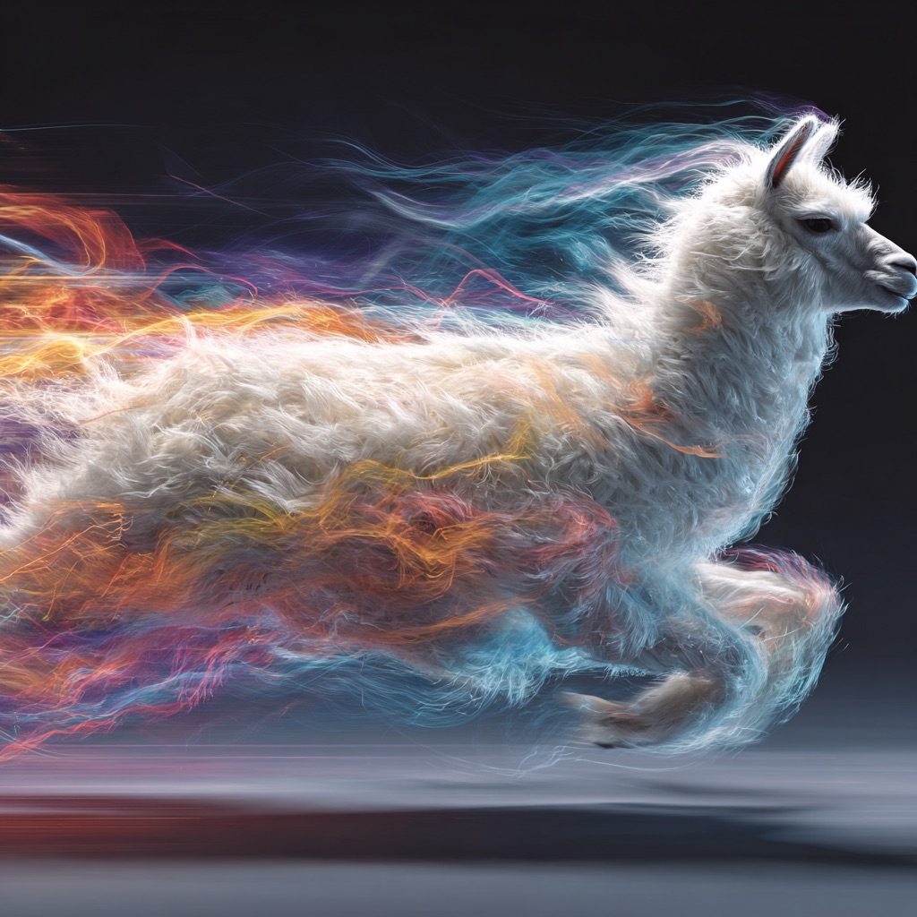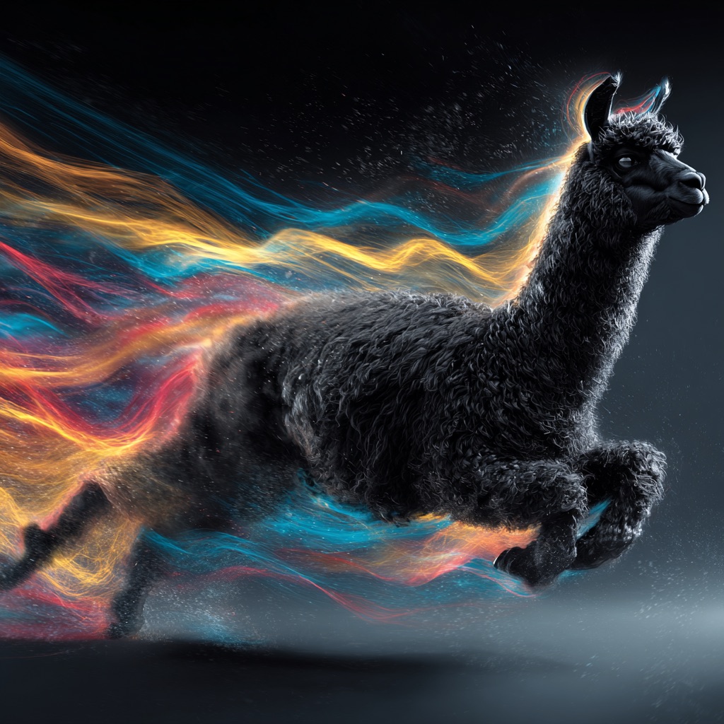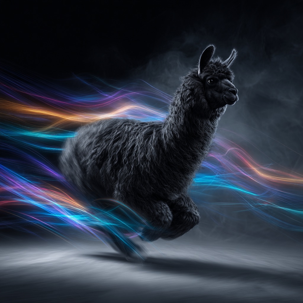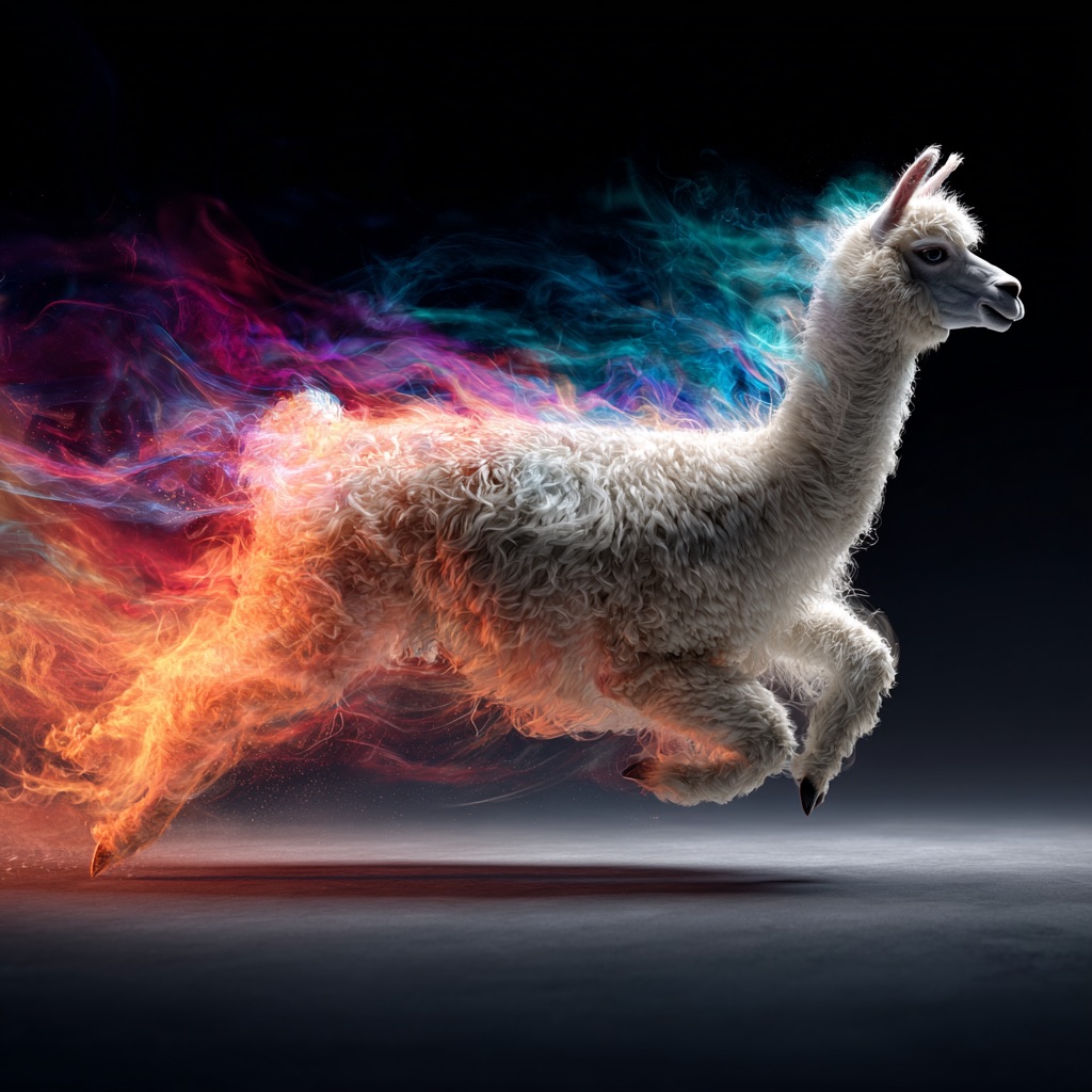 Realistic shot of a dynamic action photo featuring a black/white llama running through the air, surrounded by colorful energy waves that highlight its speed and agility as it glides through space. The dark gray background creates strong contrast, with lighting that adds depth to emphasize motion and movement.