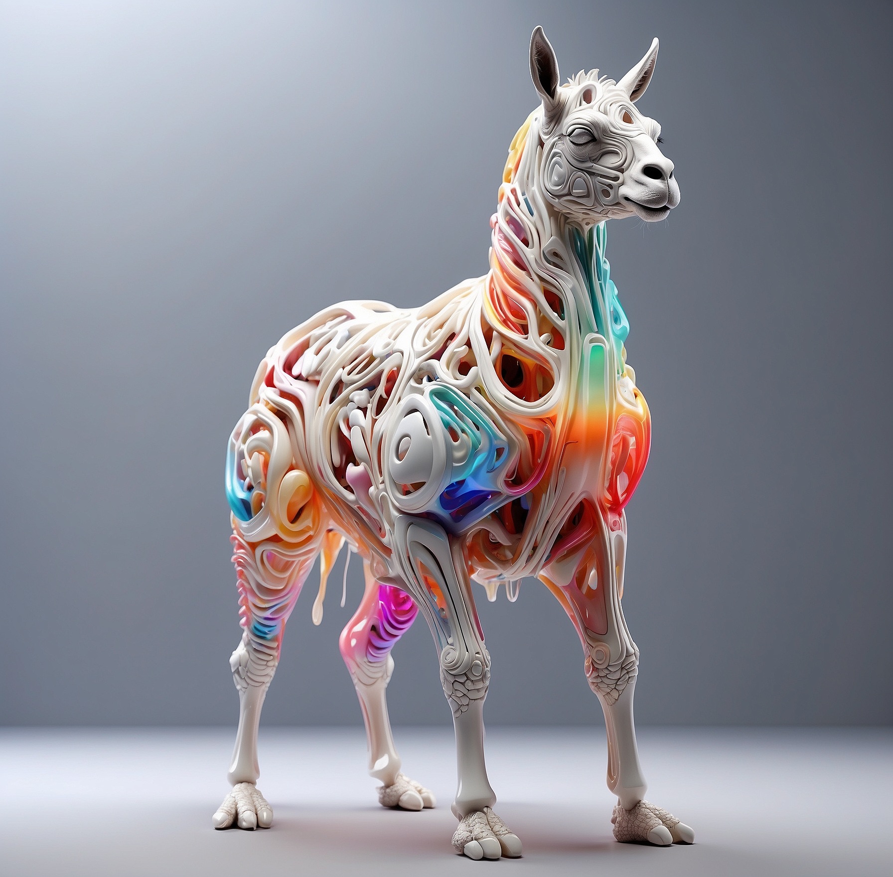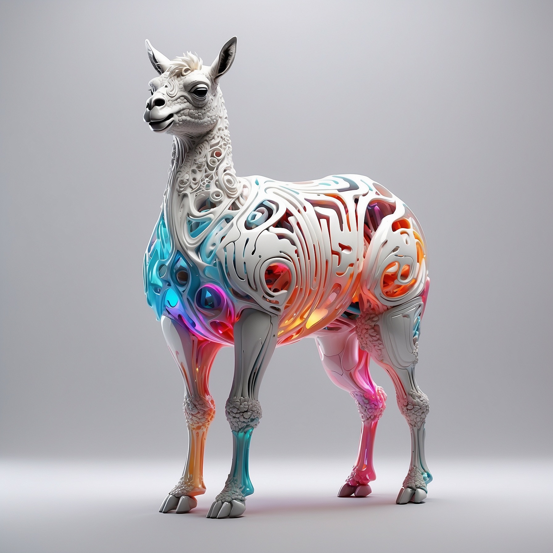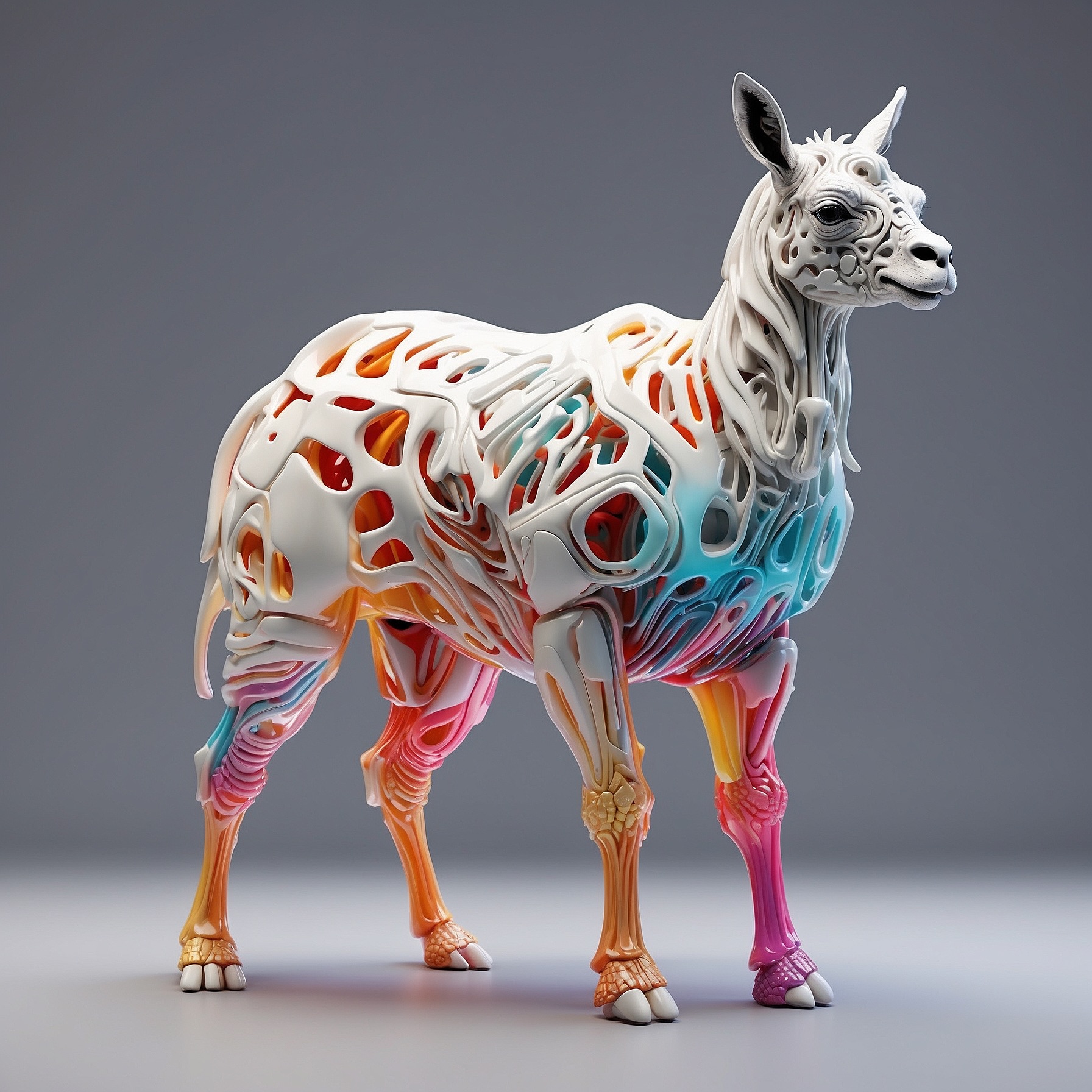 a futuristic 3D-rendered llama made of translucent Psychedelic Gradient Colors inner structure encased in a smooth white exoskeleton with organic holes and flowing biomorphic patterns, floating in a minimal soft gray background, high contrast lighting, hyperrealistic materials, octane render, modern digital sculpture