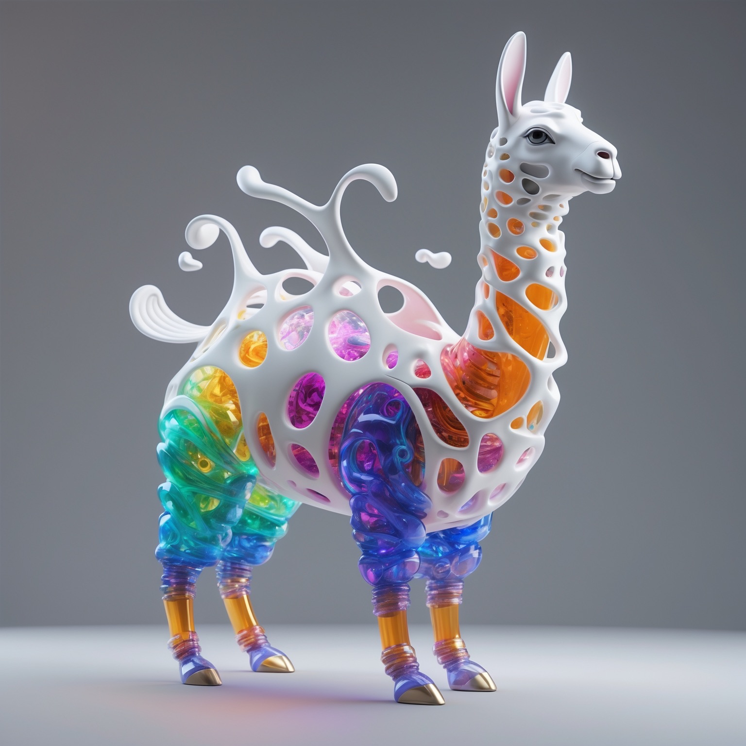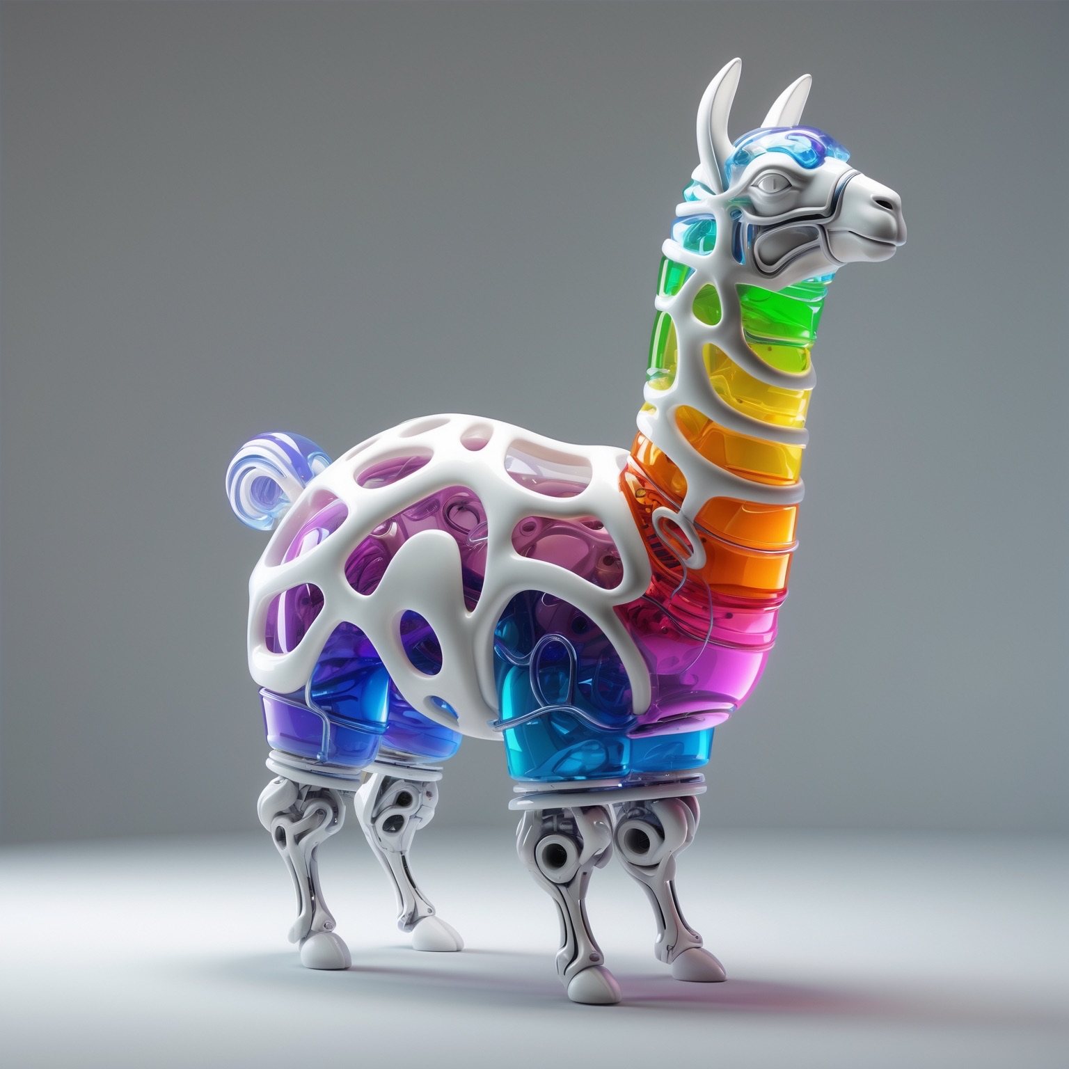 a futuristic 3D-rendered llama made of translucent Psychedelic Gradient Colors inner structure encased in a smooth white exoskeleton with organic holes and flowing biomorphic patterns, floating in a minimal soft gray background, high contrast lighting, hyperrealistic materials, octane render, modern digital sculpture