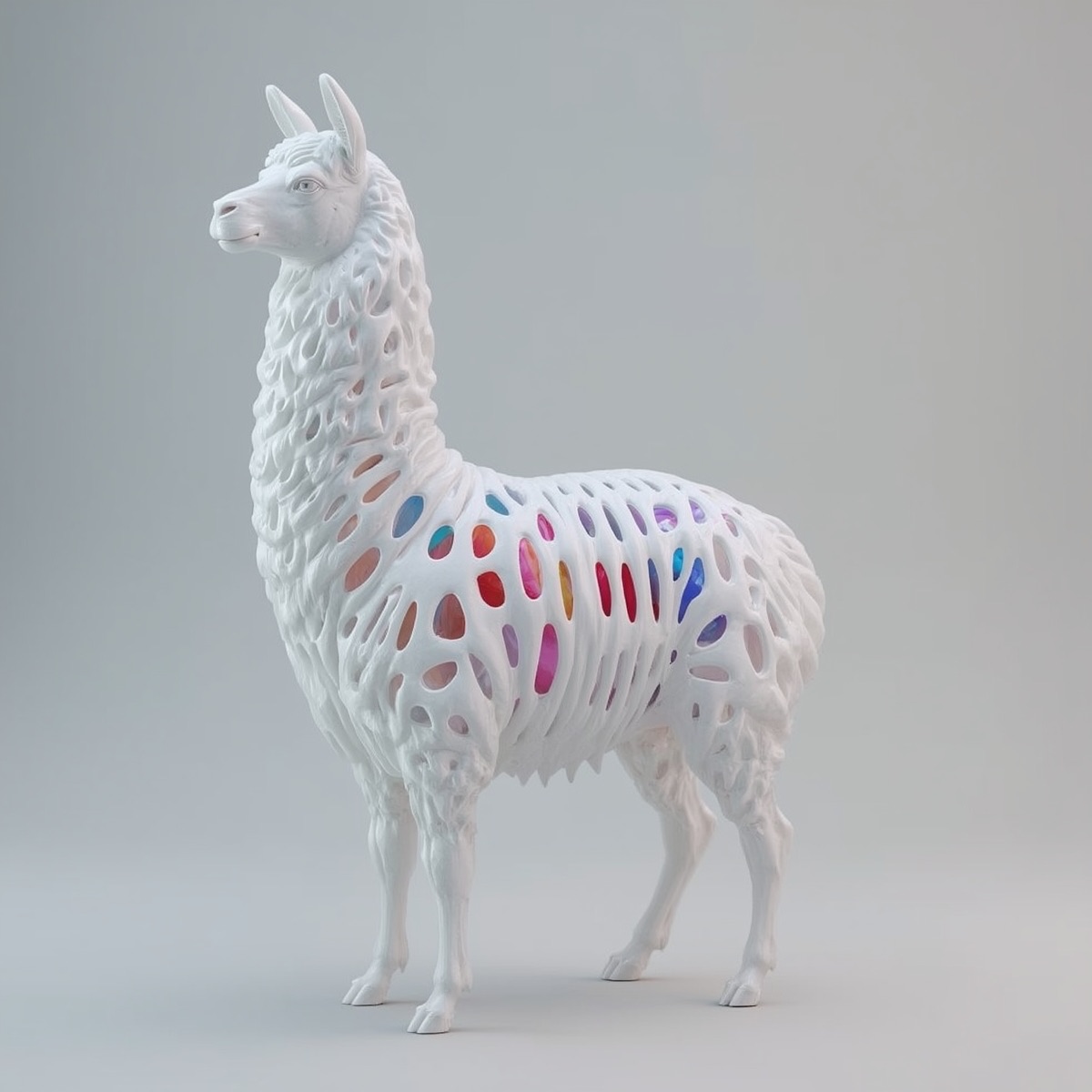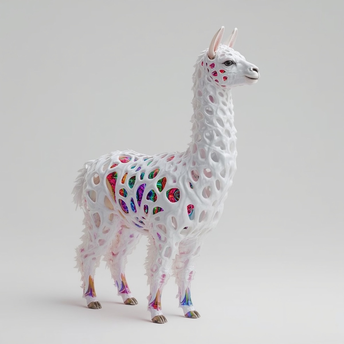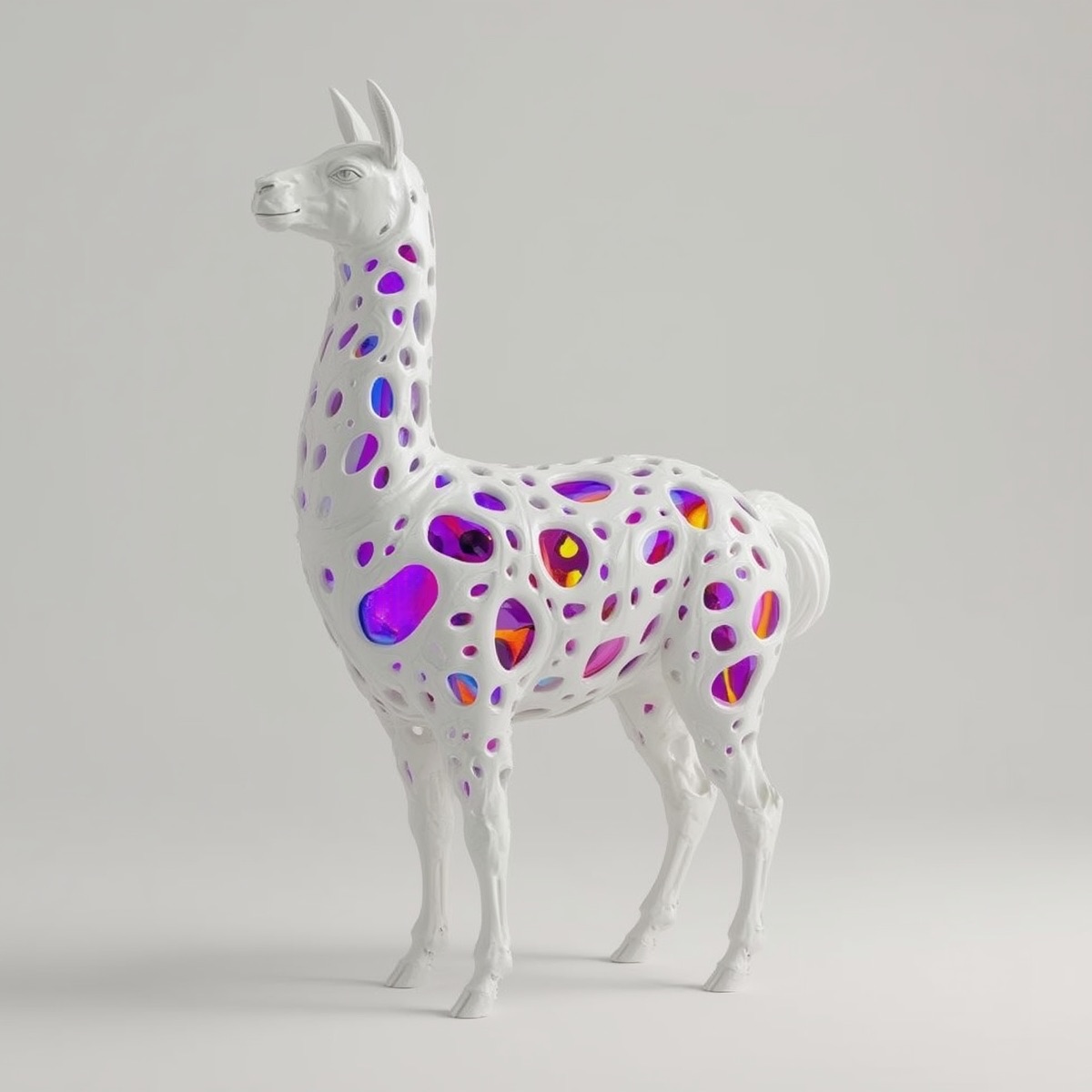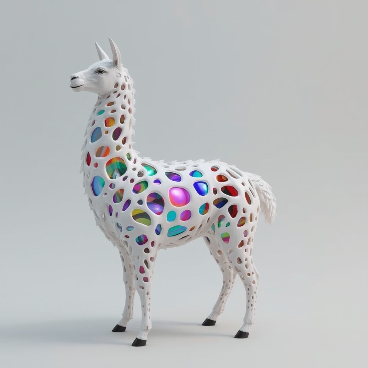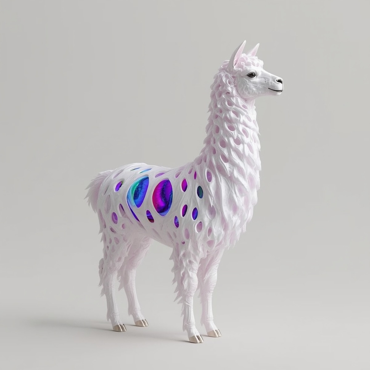 a futuristic 3D-rendered llama made of translucent Psychedelic Gradient Colors inner structure encased in a smooth white exoskeleton with organic holes and flowing biomorphic patterns, floating in a minimal soft gray background, high contrast lighting, hyperrealistic materials, octane render, modern digital sculpture