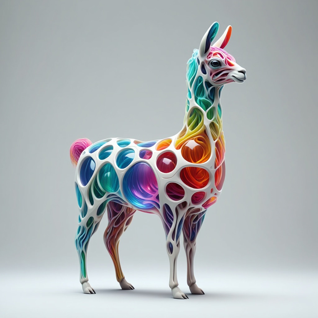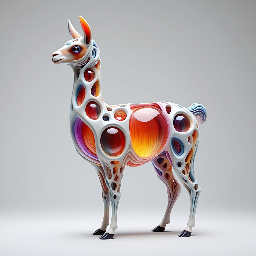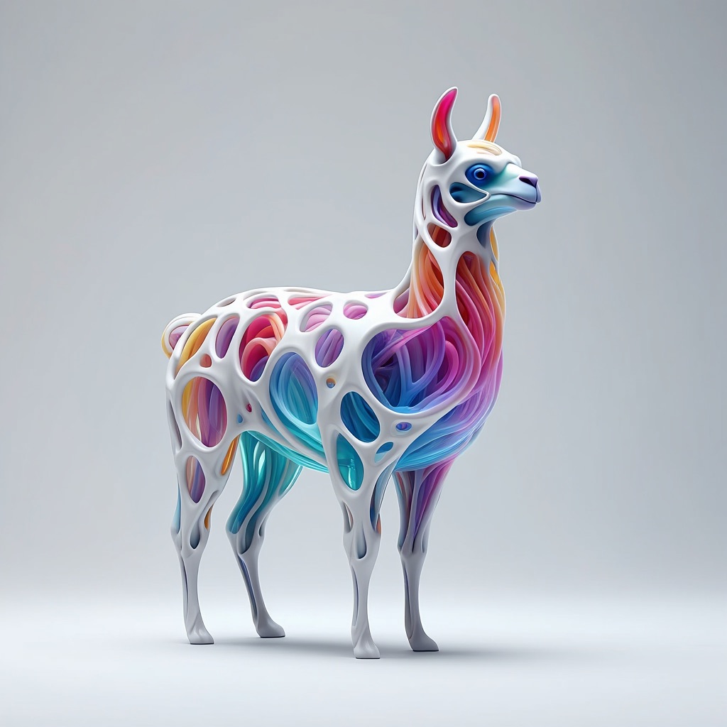 a futuristic 3D-rendered llama made of translucent Psychedelic Gradient Colors inner structure encased in a smooth white exoskeleton with organic holes and flowing biomorphic patterns, floating in a minimal soft gray background, high contrast lighting, hyperrealistic materials, octane render, modern digital sculpture