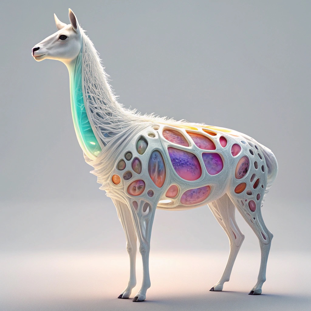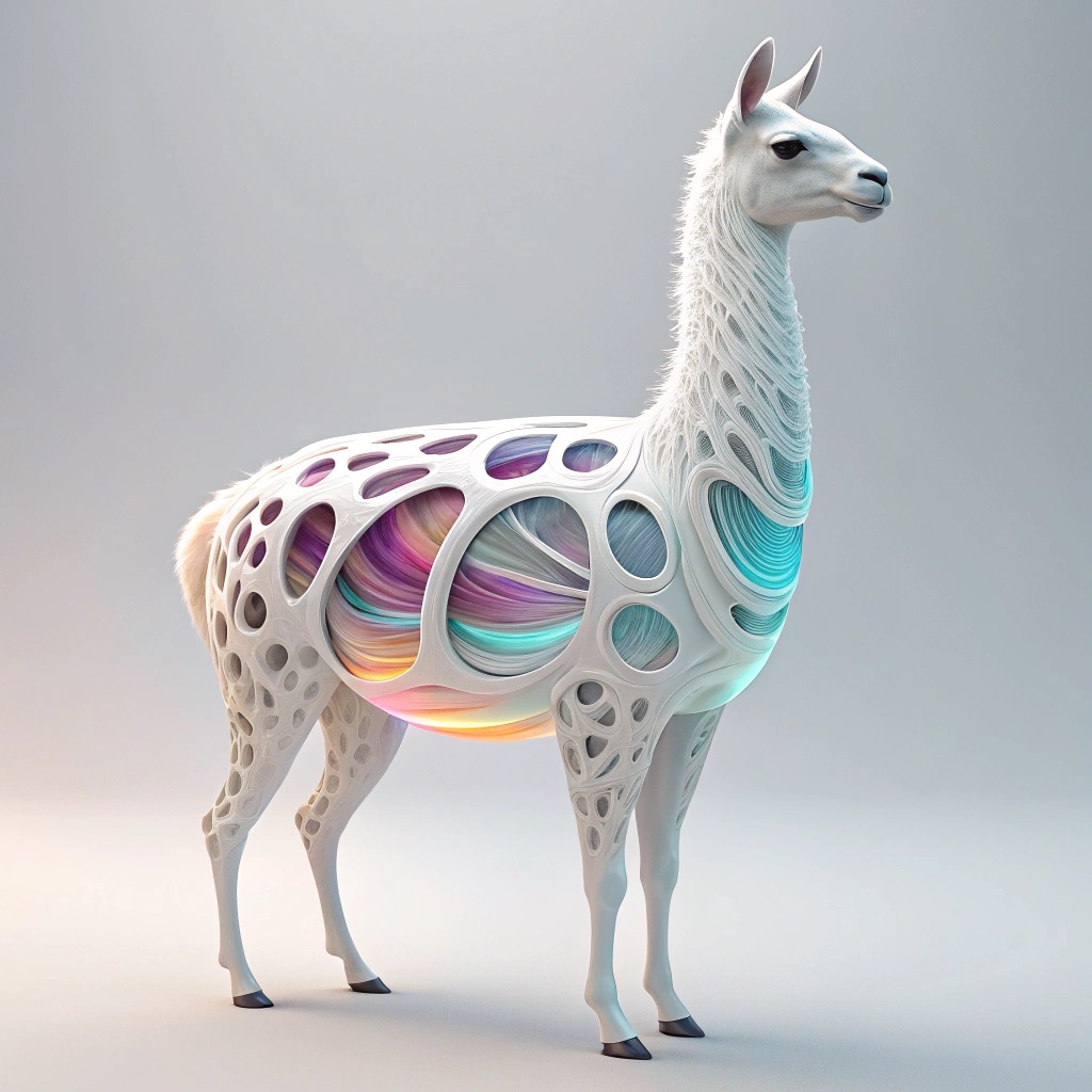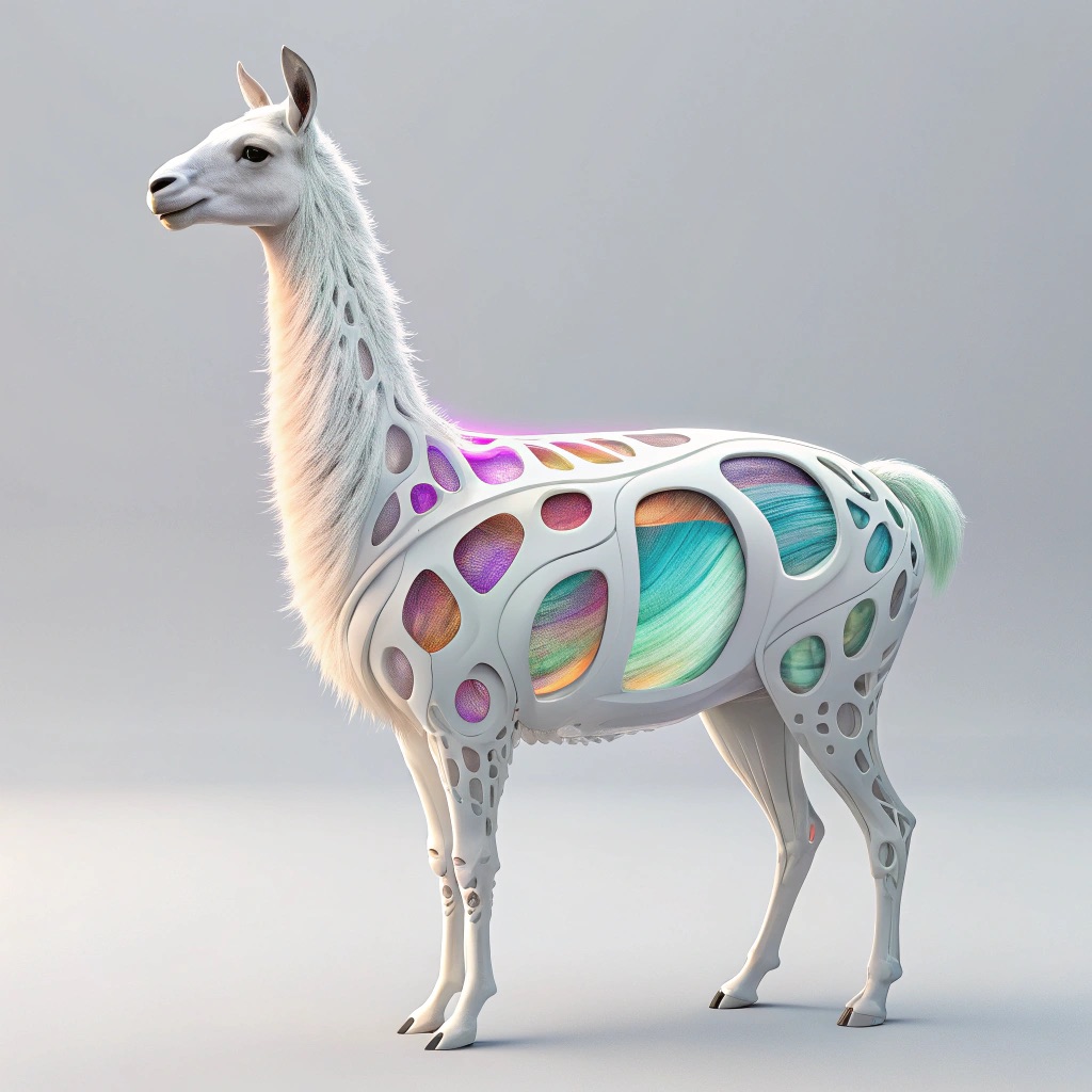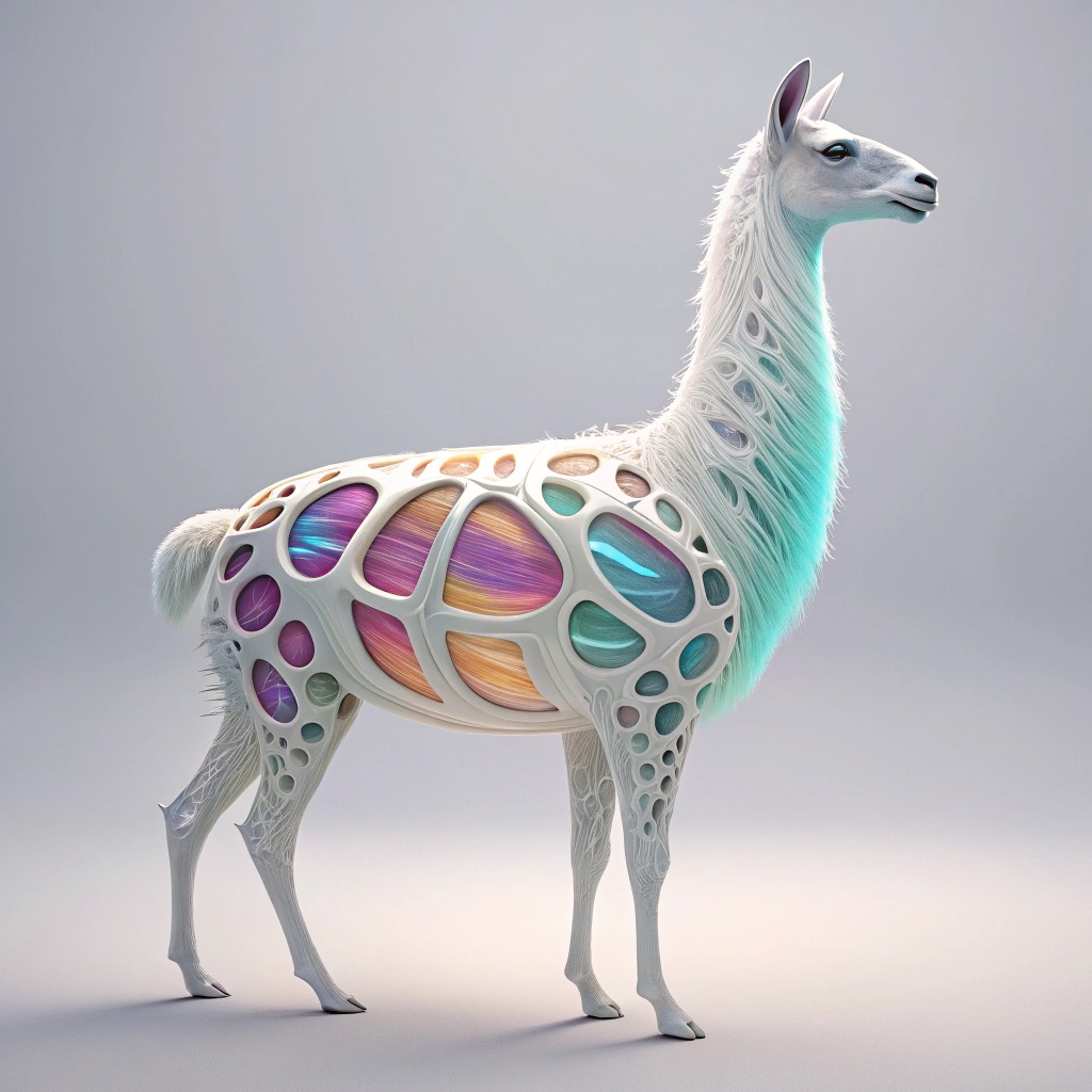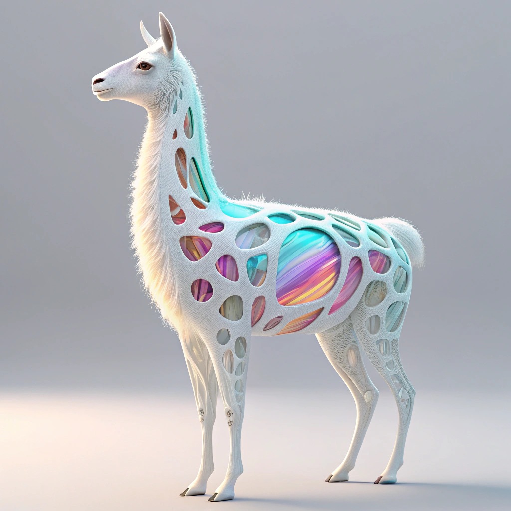 a futuristic 3D-rendered llama made of translucent Psychedelic Gradient Colors inner structure encased in a smooth white exoskeleton with organic holes and flowing biomorphic patterns, floating in a minimal soft gray background, high contrast lighting, hyperrealistic materials, octane render, modern digital sculpture