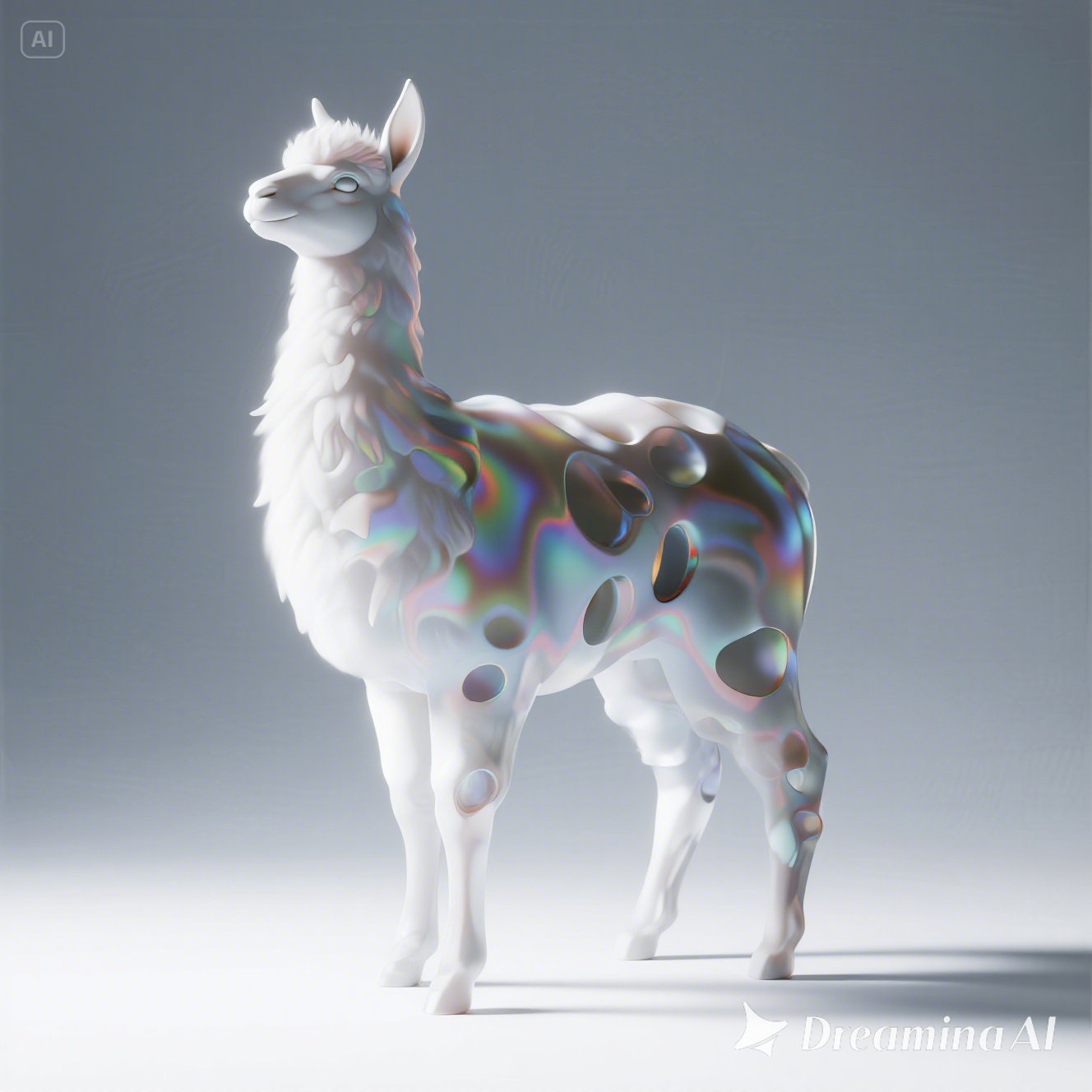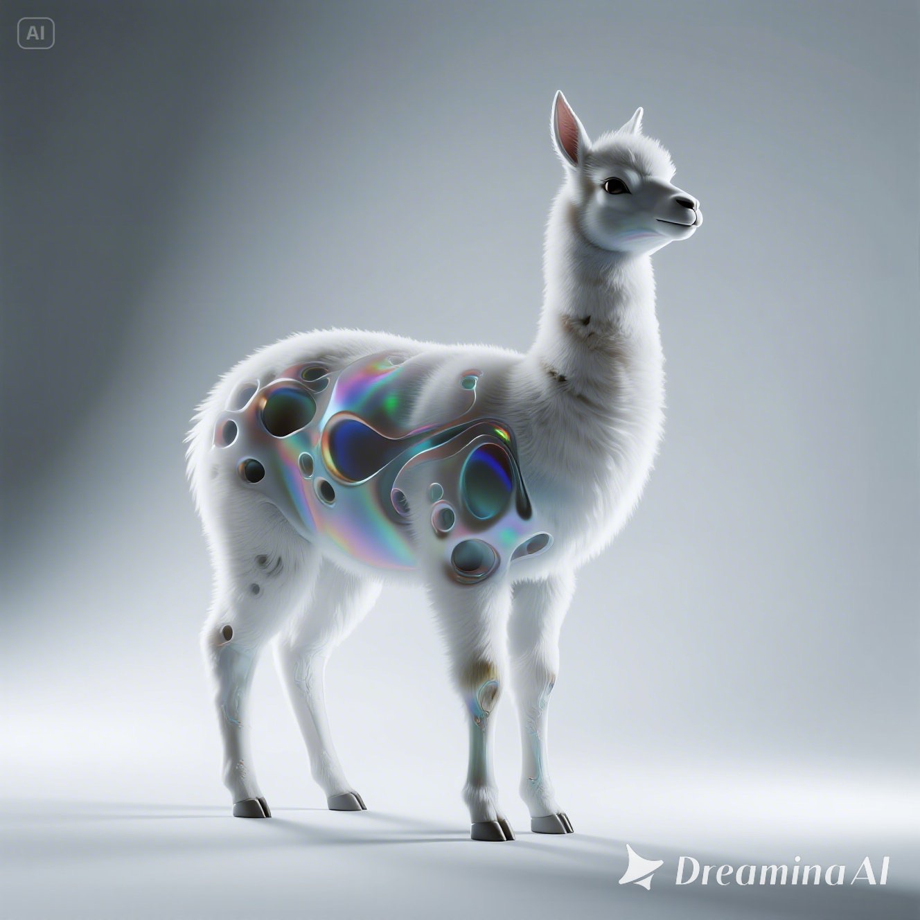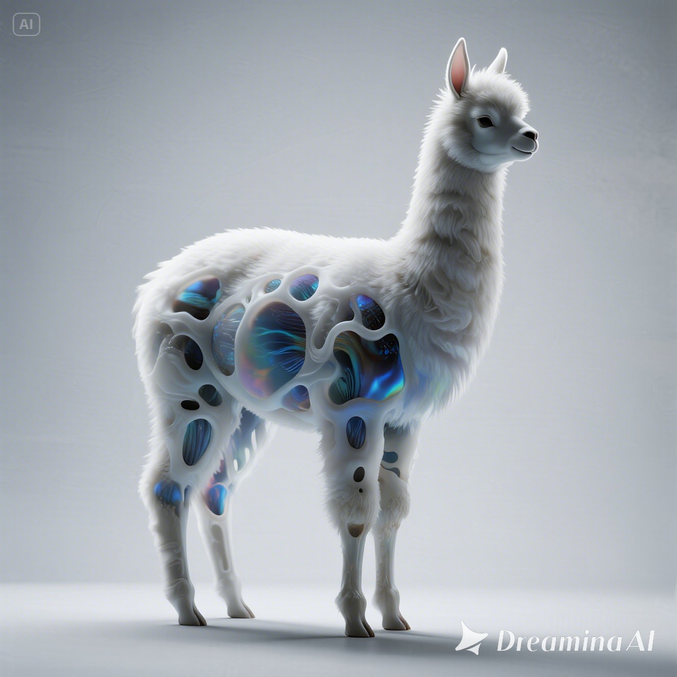 a futuristic 3D-rendered llama made of translucent Psychedelic Gradient Colors inner structure encased in a smooth white exoskeleton with organic holes and flowing biomorphic patterns, floating in a minimal soft gray background, high contrast lighting, hyperrealistic materials, octane render, modern digital sculpture