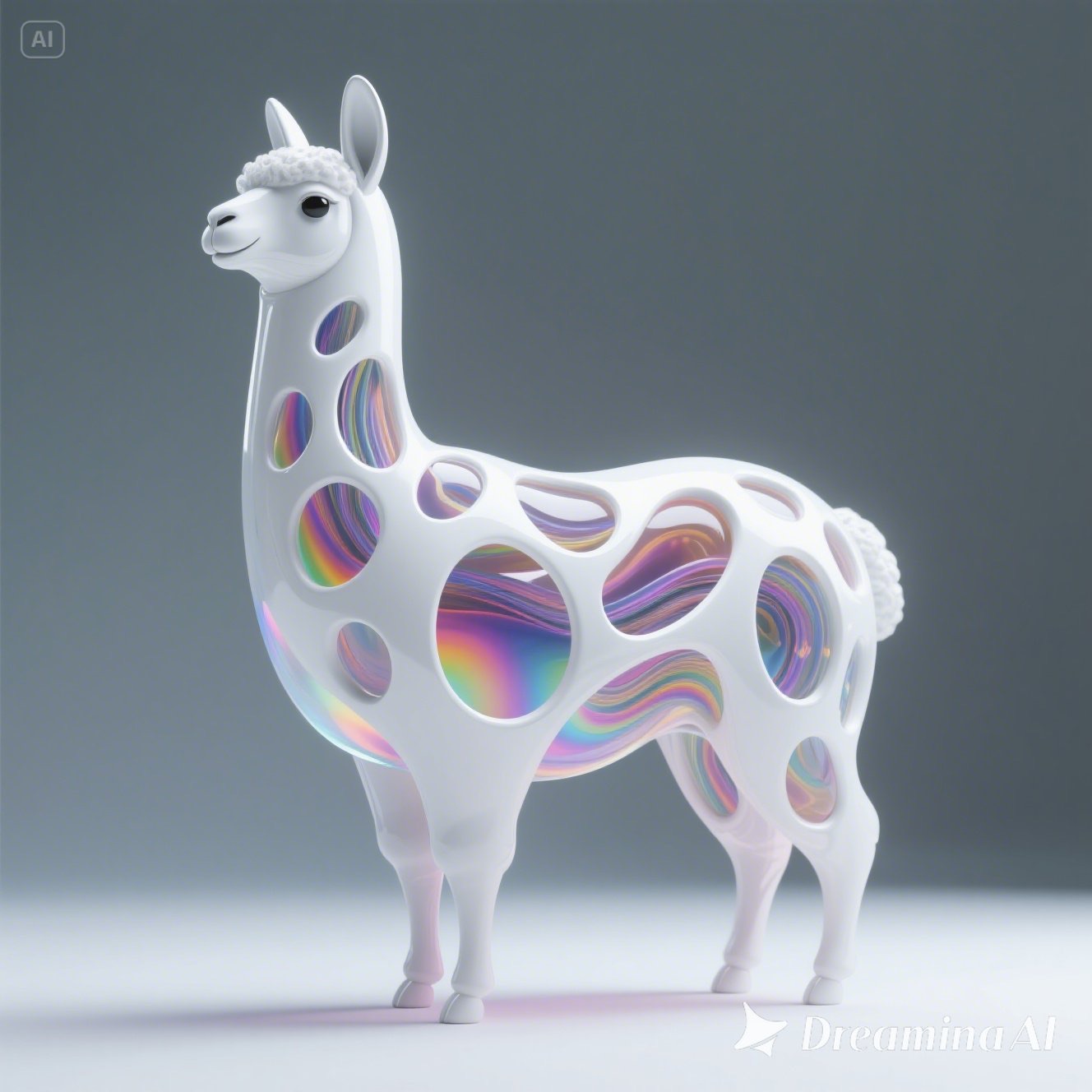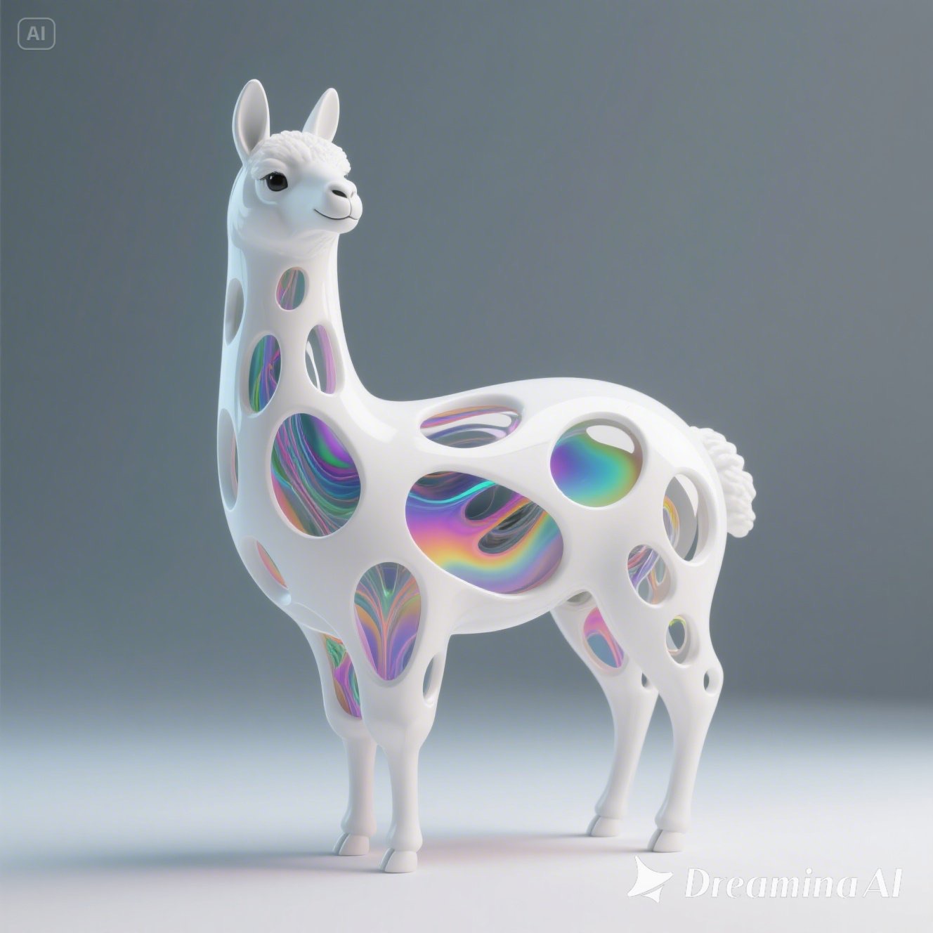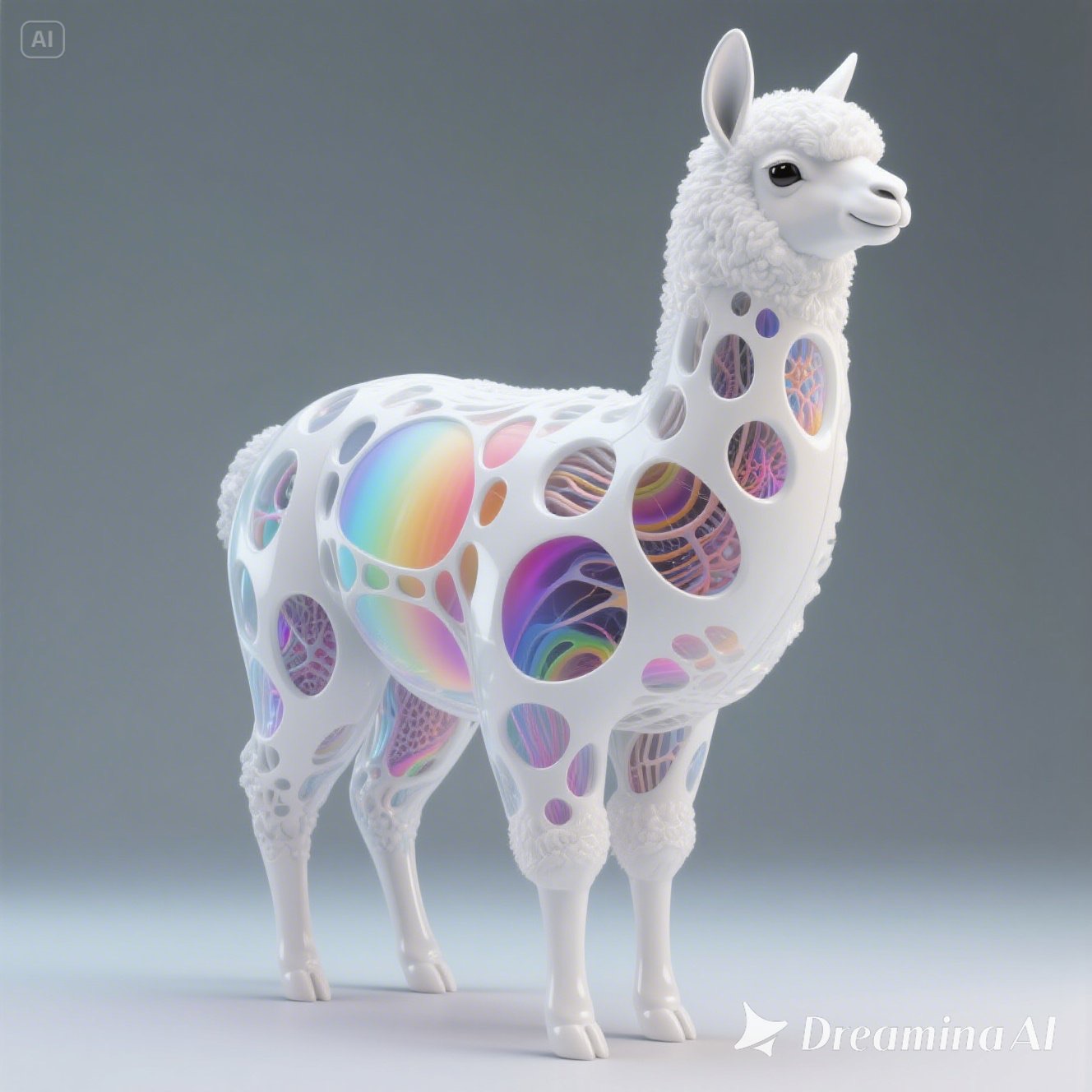 a futuristic 3D-rendered llama made of translucent Psychedelic Gradient Colors inner structure encased in a smooth white exoskeleton with organic holes and flowing biomorphic patterns, floating in a minimal soft gray background, high contrast lighting, hyperrealistic materials, octane render, modern digital sculpture