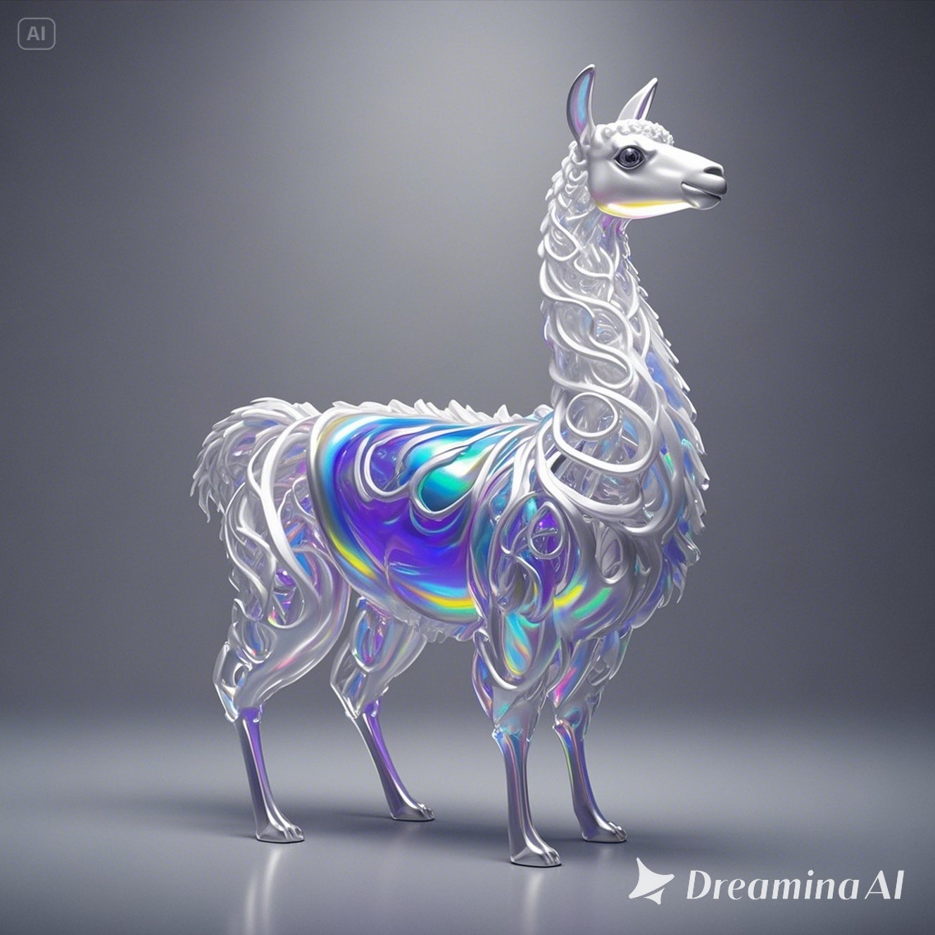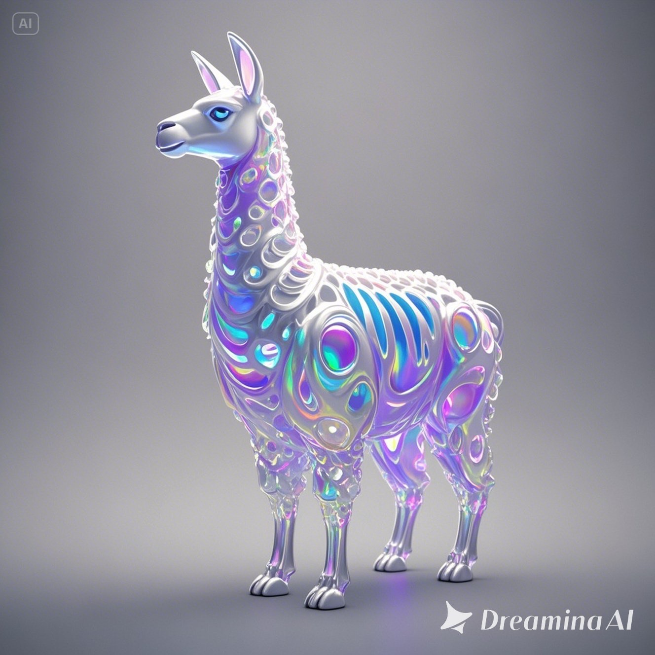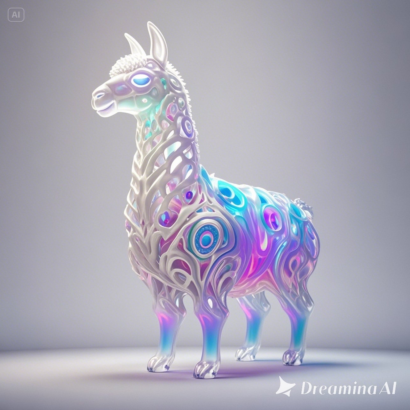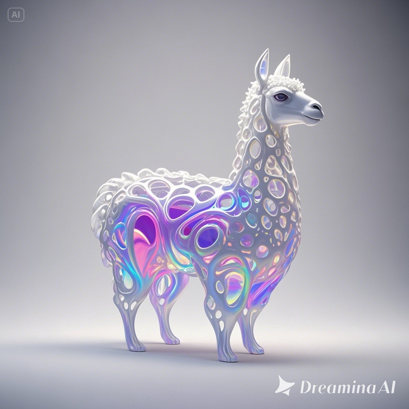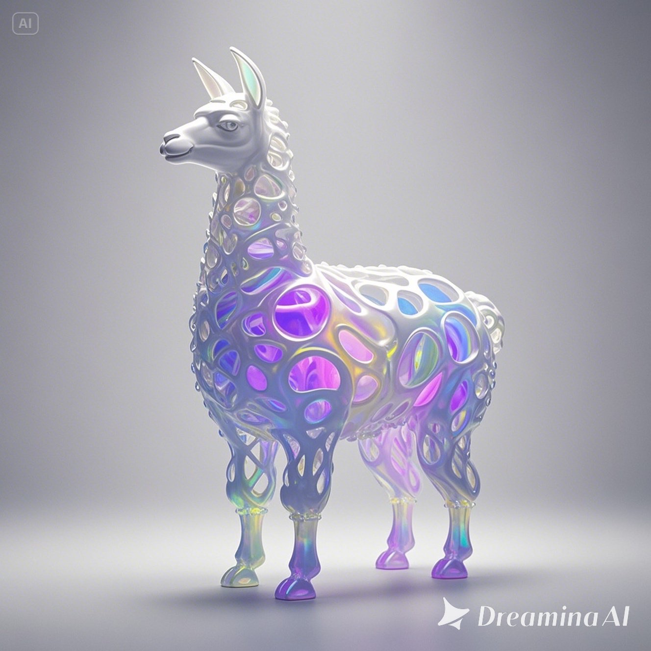 a futuristic 3D-rendered llama made of translucent Psychedelic Gradient Colors inner structure encased in a smooth white exoskeleton with organic holes and flowing biomorphic patterns, floating in a minimal soft gray background, high contrast lighting, hyperrealistic materials, octane render, modern digital sculpture