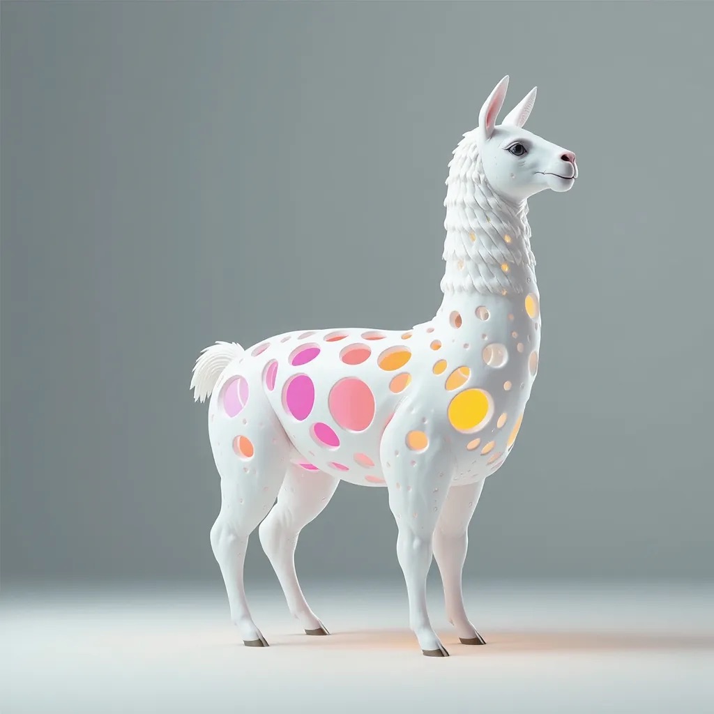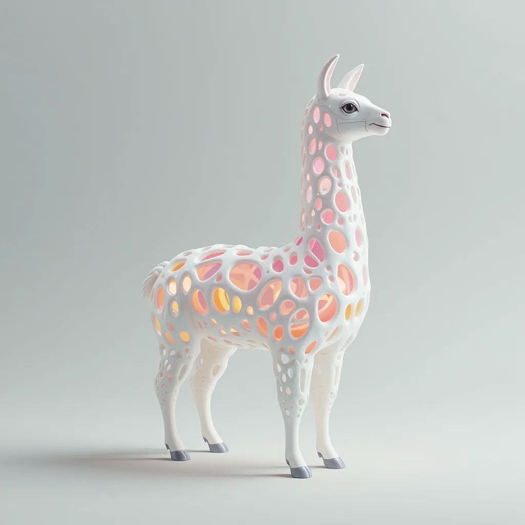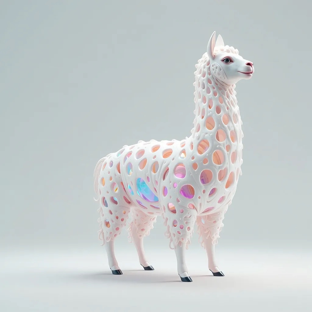 a futuristic 3D-rendered llama made of translucent Psychedelic Gradient Colors inner structure encased in a smooth white exoskeleton with organic holes and flowing biomorphic patterns, floating in a minimal soft gray background, high contrast lighting, hyperrealistic materials, octane render, modern digital sculpture