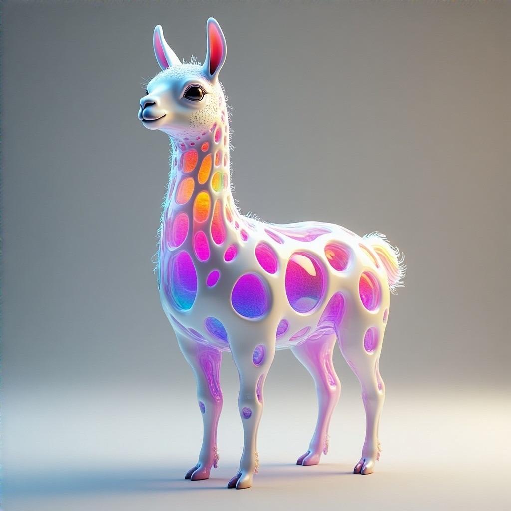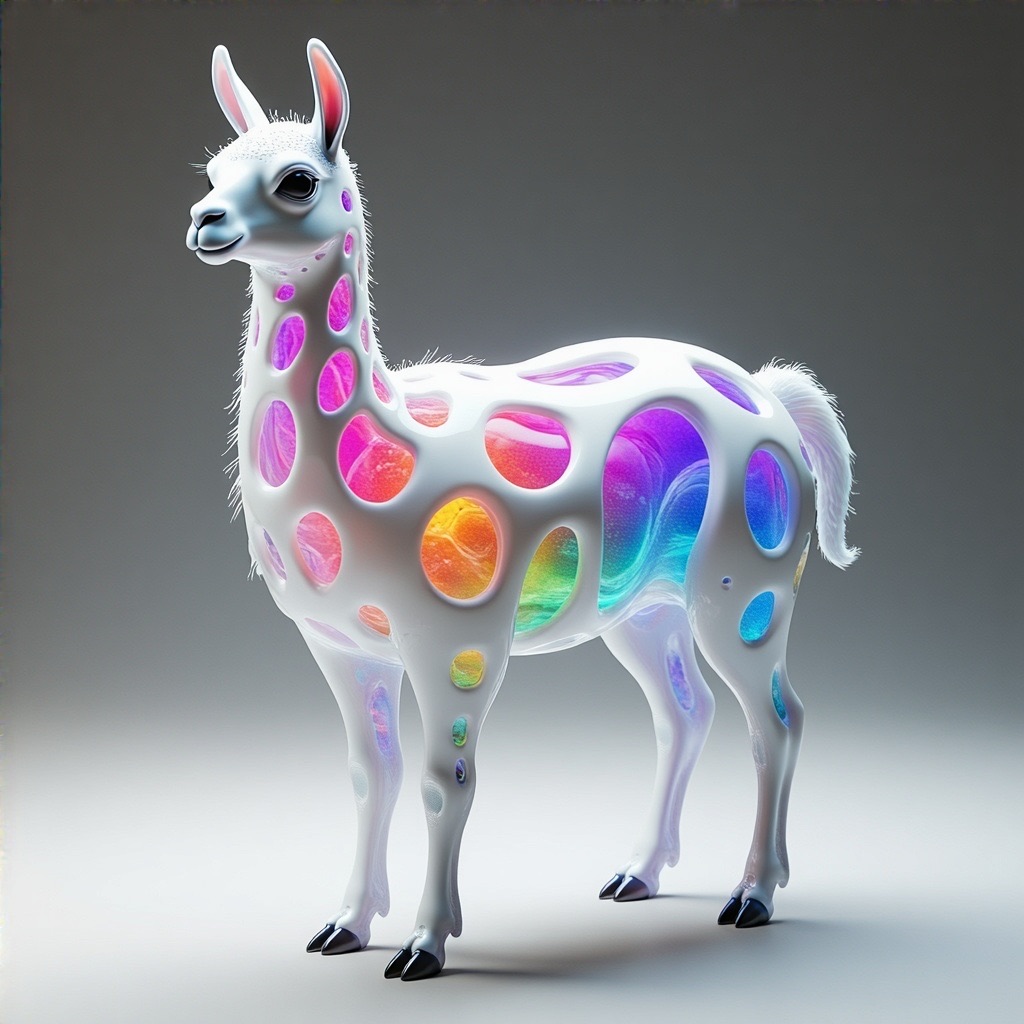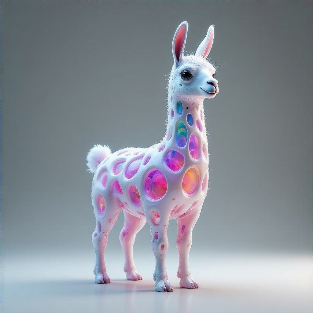 a futuristic 3D-rendered llama made of translucent Psychedelic Gradient Colors inner structure encased in a smooth white exoskeleton with organic holes and flowing biomorphic patterns, floating in a minimal soft gray background, high contrast lighting, hyperrealistic materials, octane render, modern digital sculpture