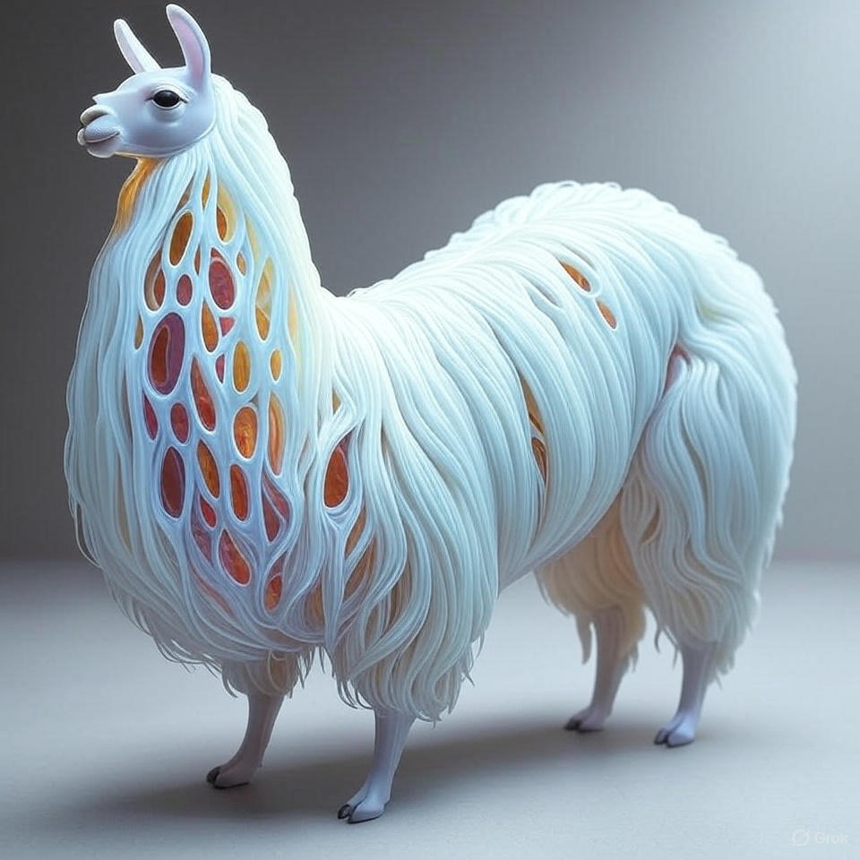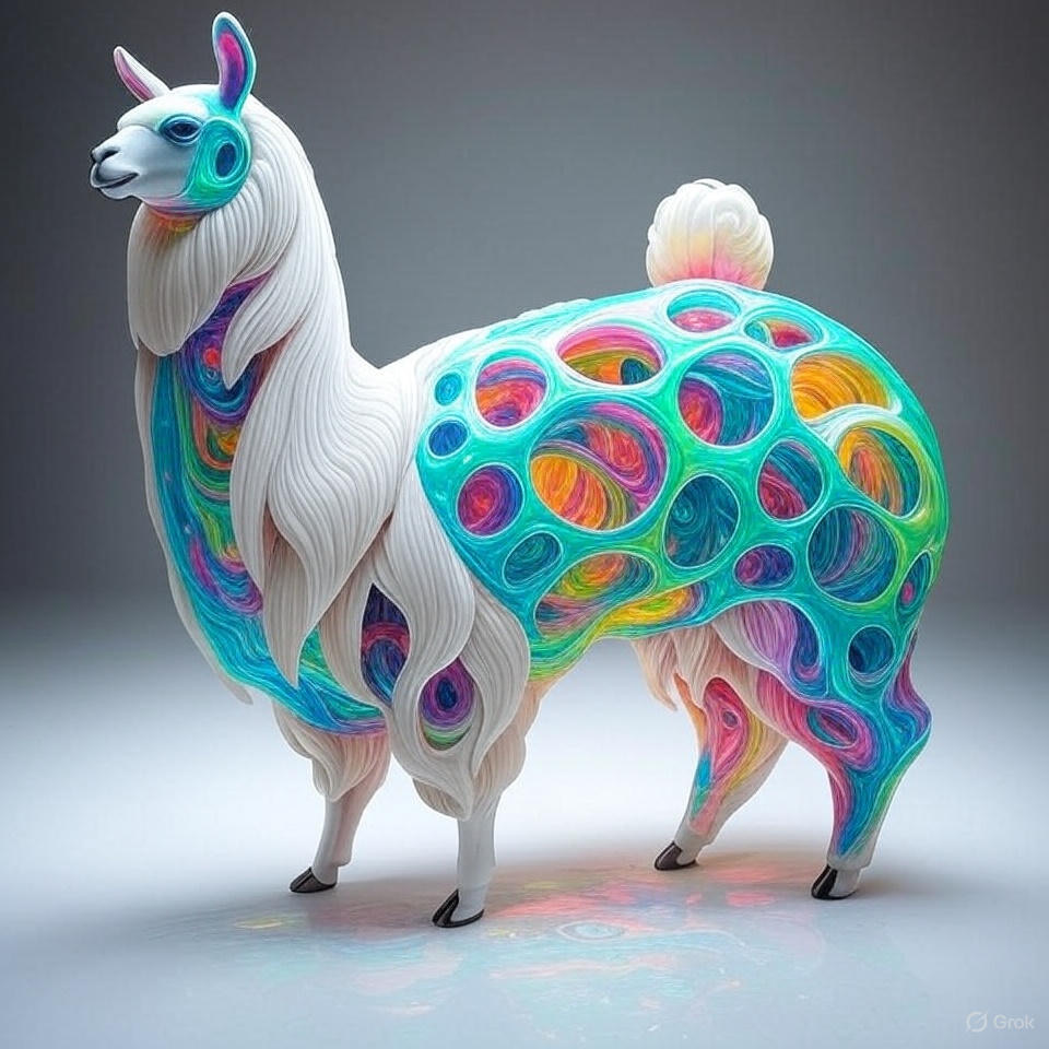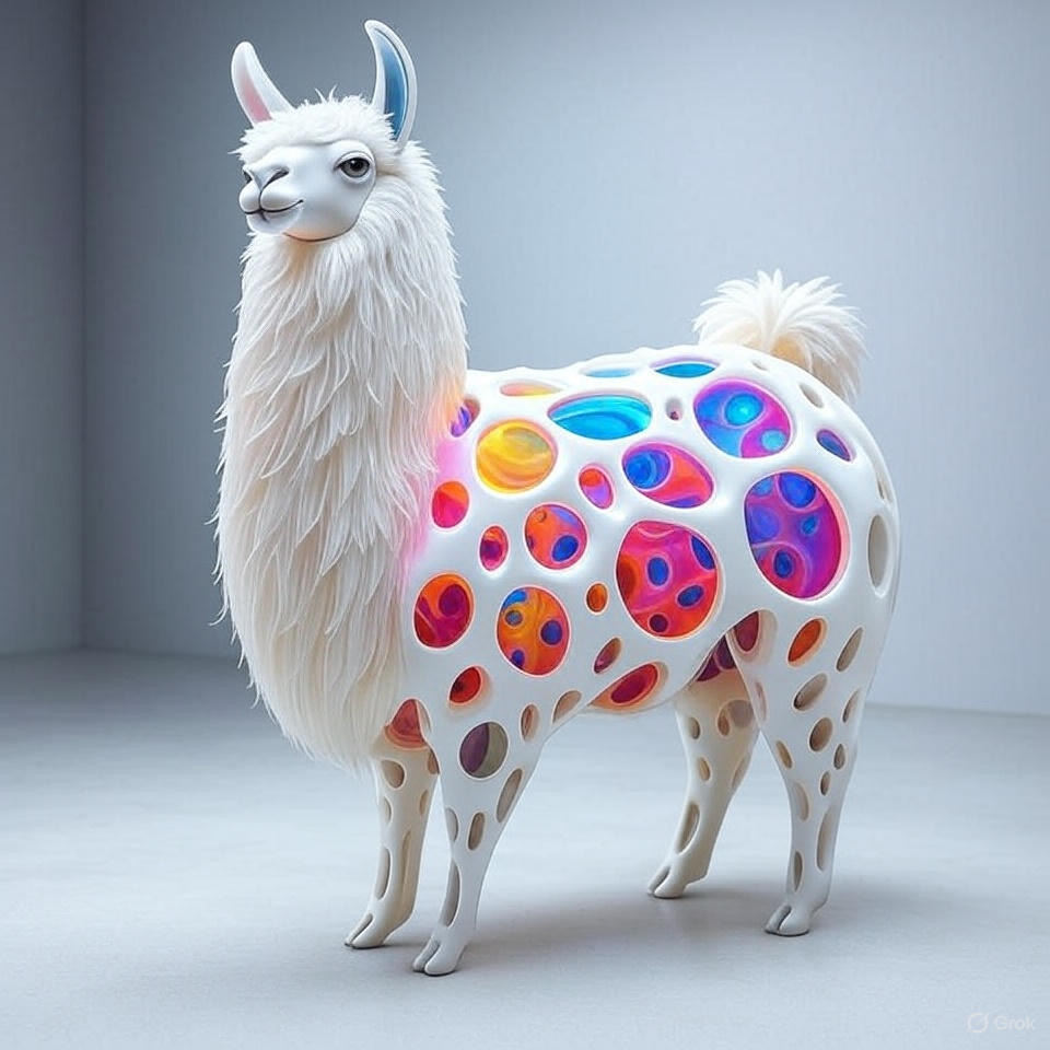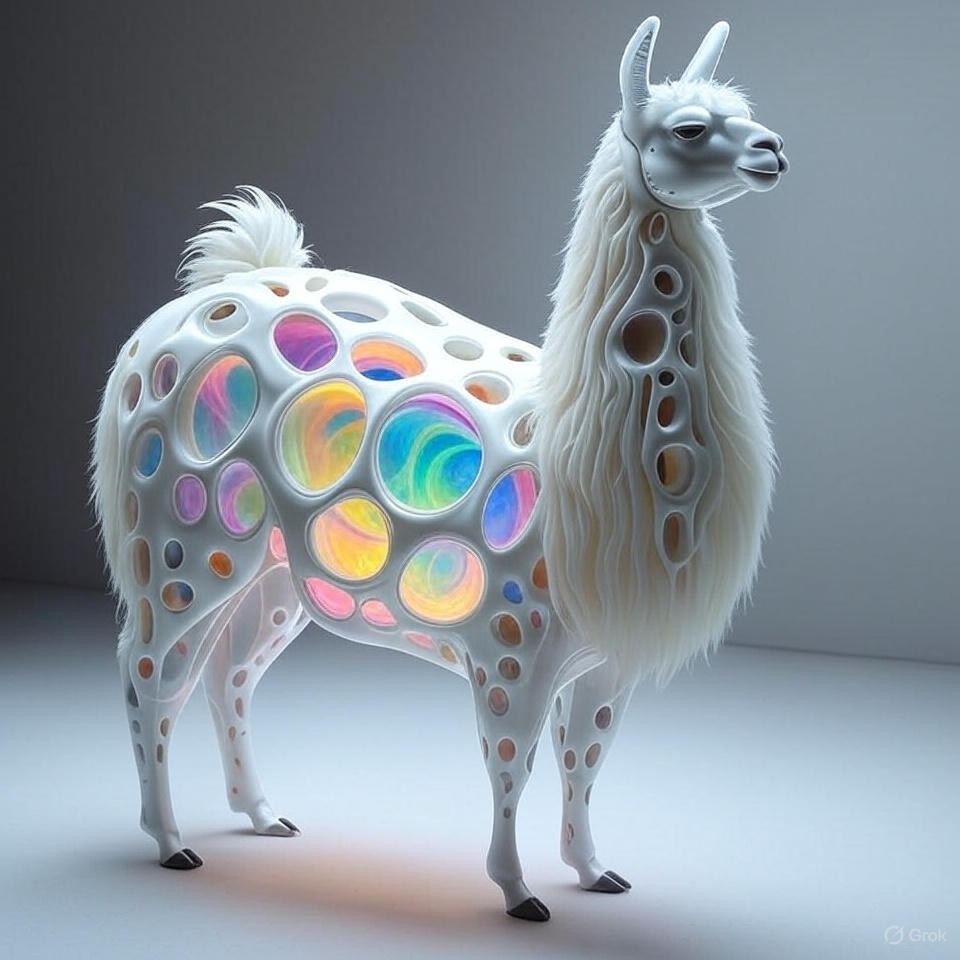 a futuristic 3D-rendered llama made of translucent Psychedelic Gradient Colors inner structure encased in a smooth white exoskeleton with organic holes and flowing biomorphic patterns, floating in a minimal soft gray background, high contrast lighting, hyperrealistic materials, octane render, modern digital sculpture