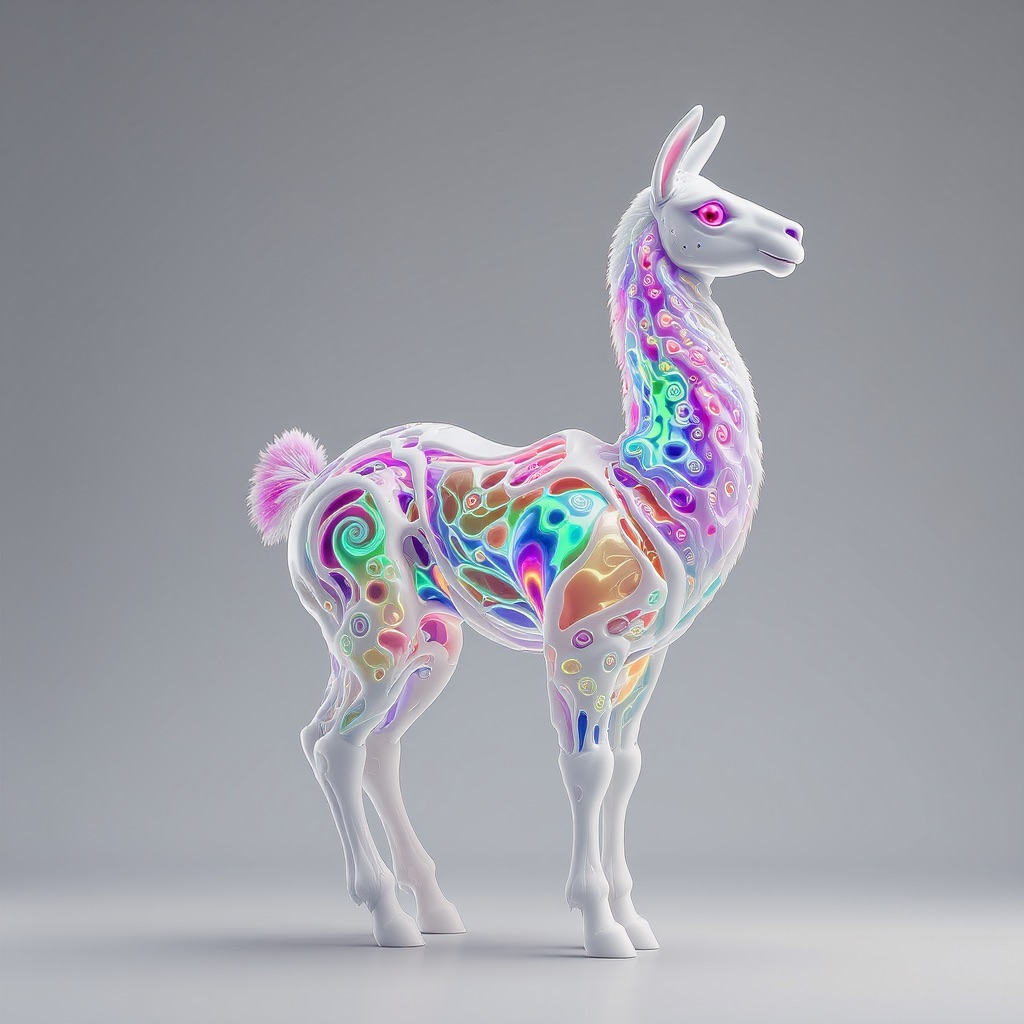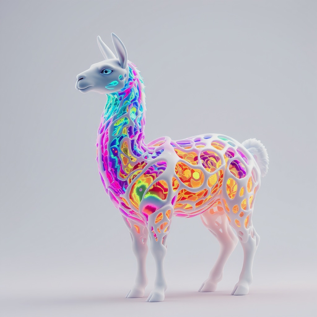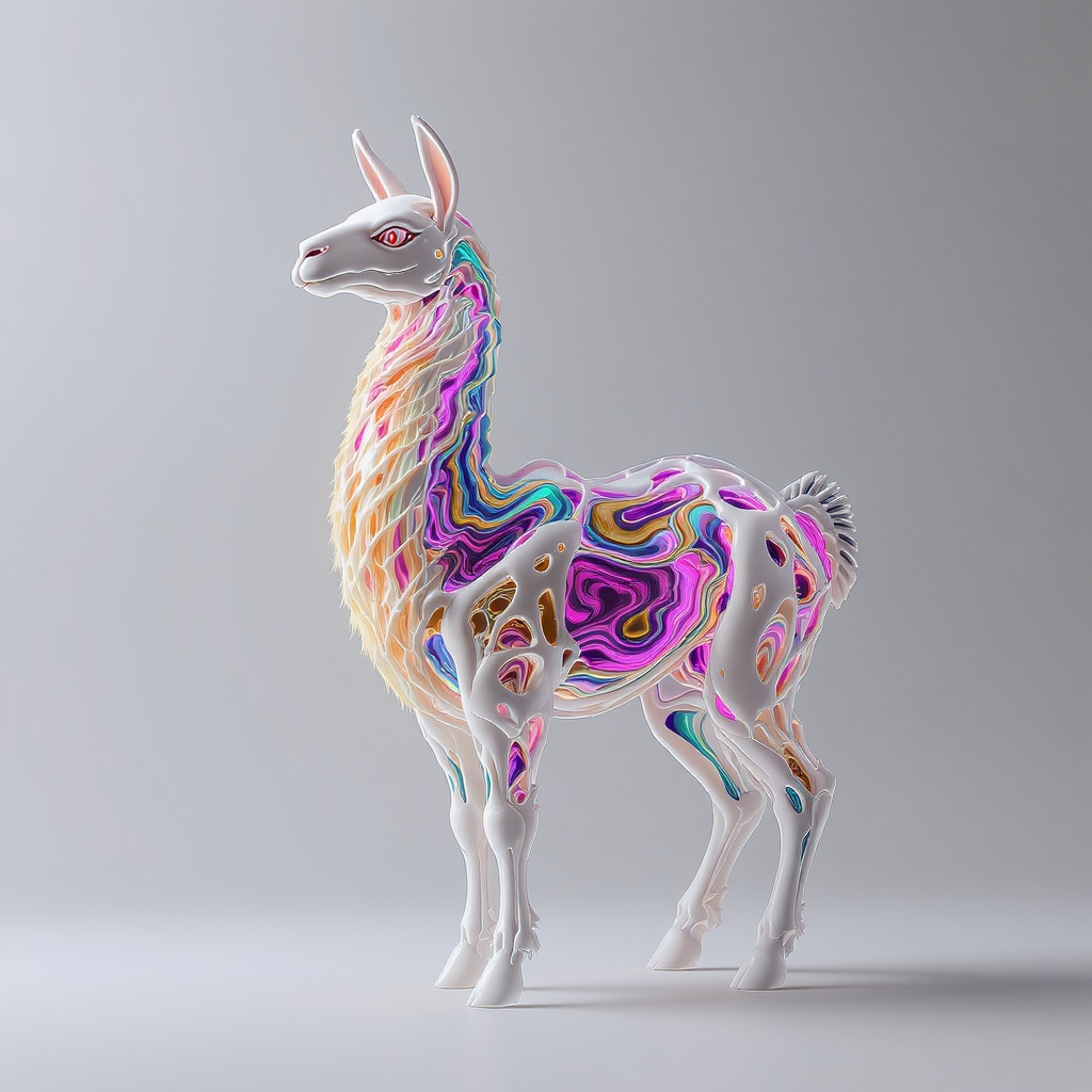 a futuristic 3D-rendered llama made of translucent Psychedelic Gradient Colors inner structure encased in a smooth white exoskeleton with organic holes and flowing biomorphic patterns, floating in a minimal soft gray background, high contrast lighting, hyperrealistic materials, octane render, modern digital sculpture