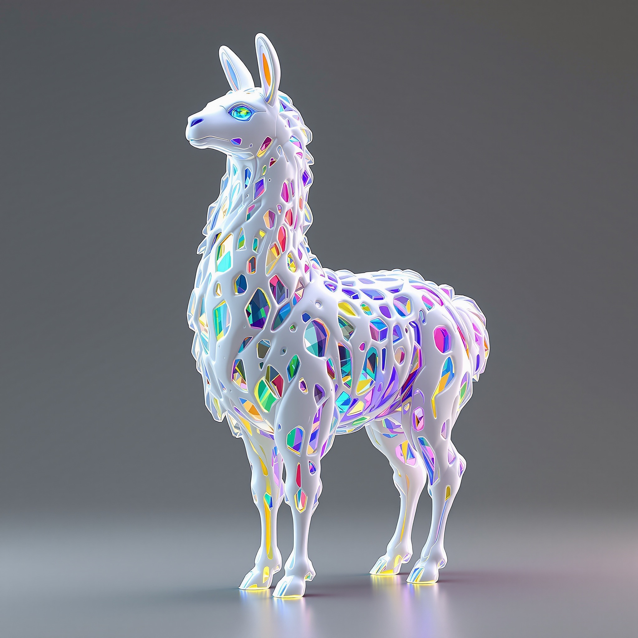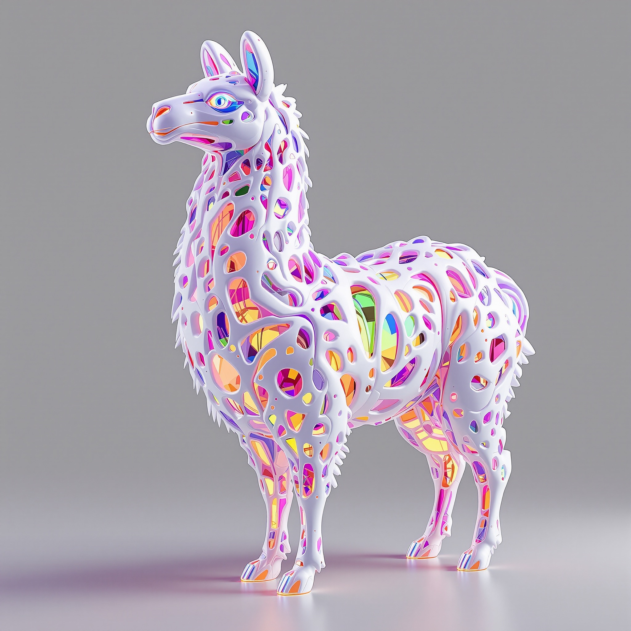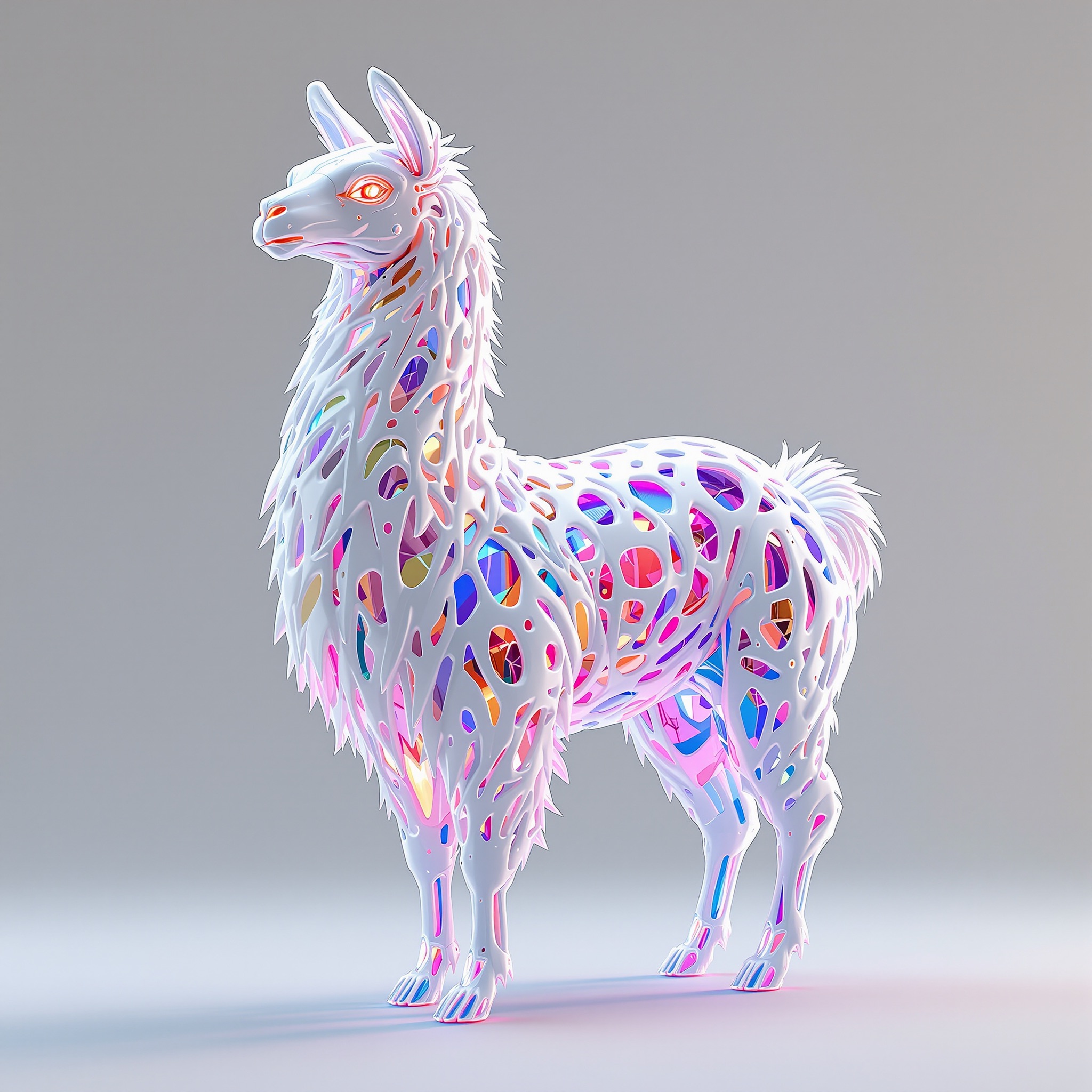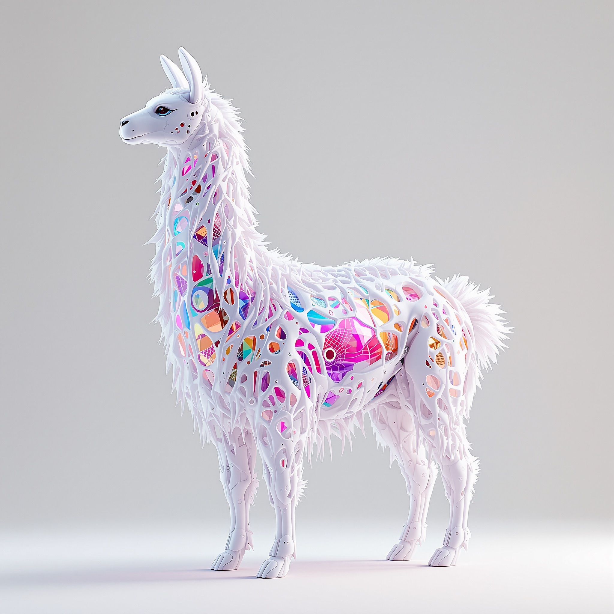 a futuristic 3D-rendered llama made of translucent Psychedelic Gradient Colors inner structure encased in a smooth white exoskeleton with organic holes and flowing biomorphic patterns, floating in a minimal soft gray background, high contrast lighting, hyperrealistic materials, octane render, modern digital sculpture