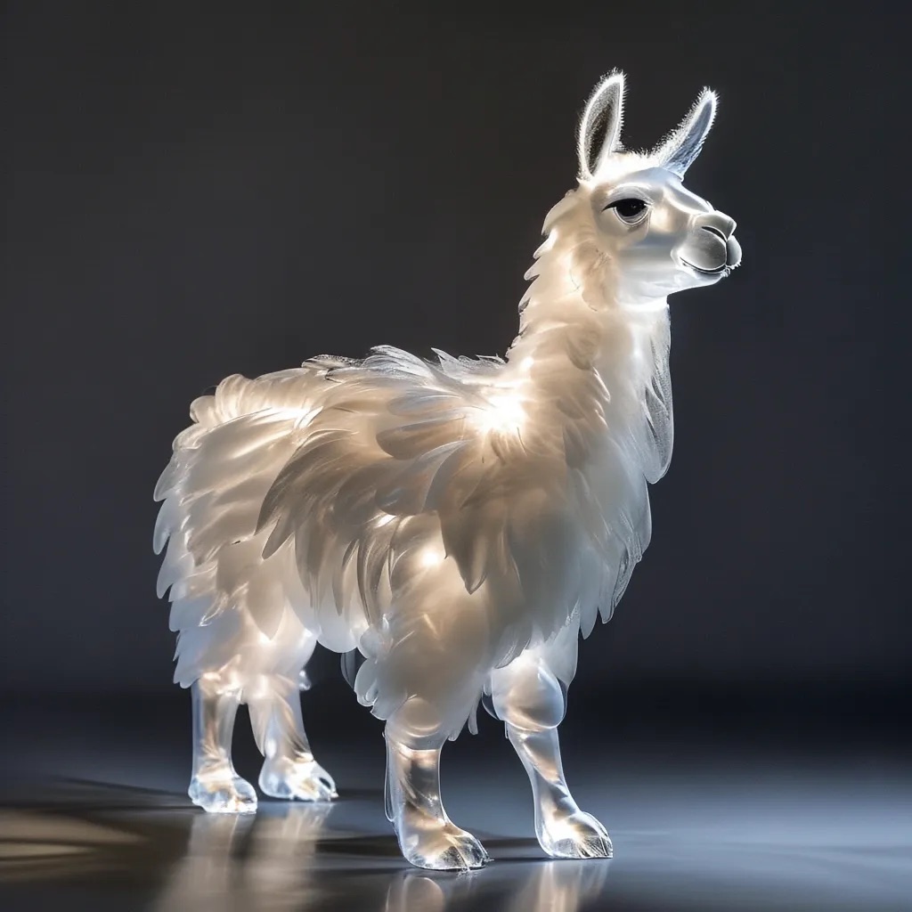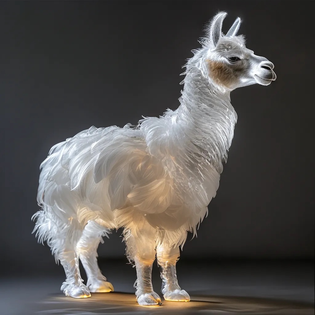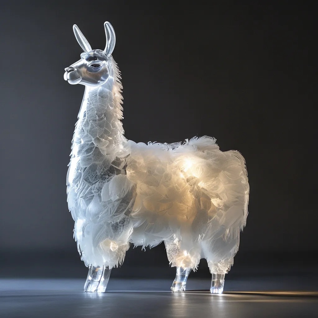 A full-body llama made of clear crystalline material with smooth curves. Inside, soft white and cream feathers are delicately layered. Soft ambient light reflects gently on the curved surfaces. The figure is placed against a simple dark background to highlight contrast and elegance.