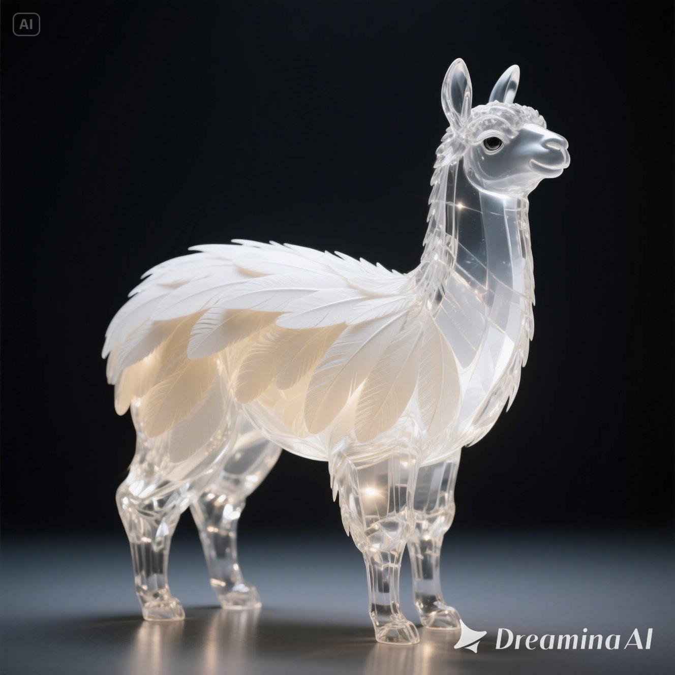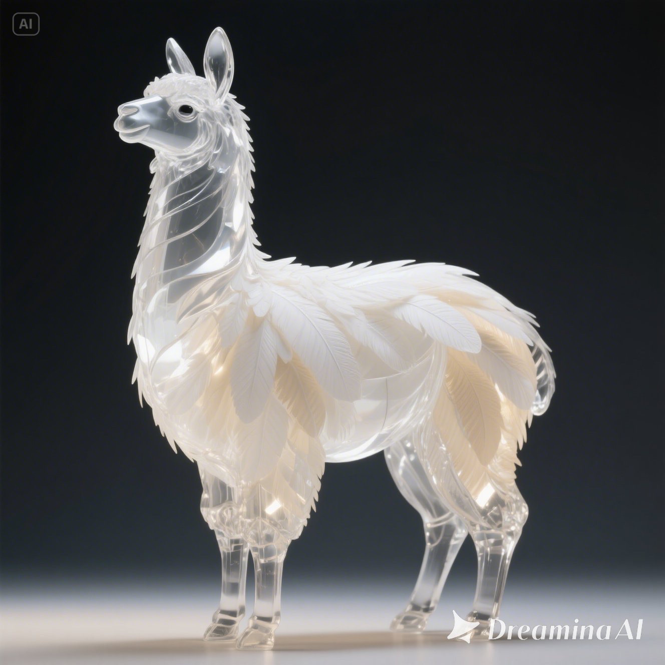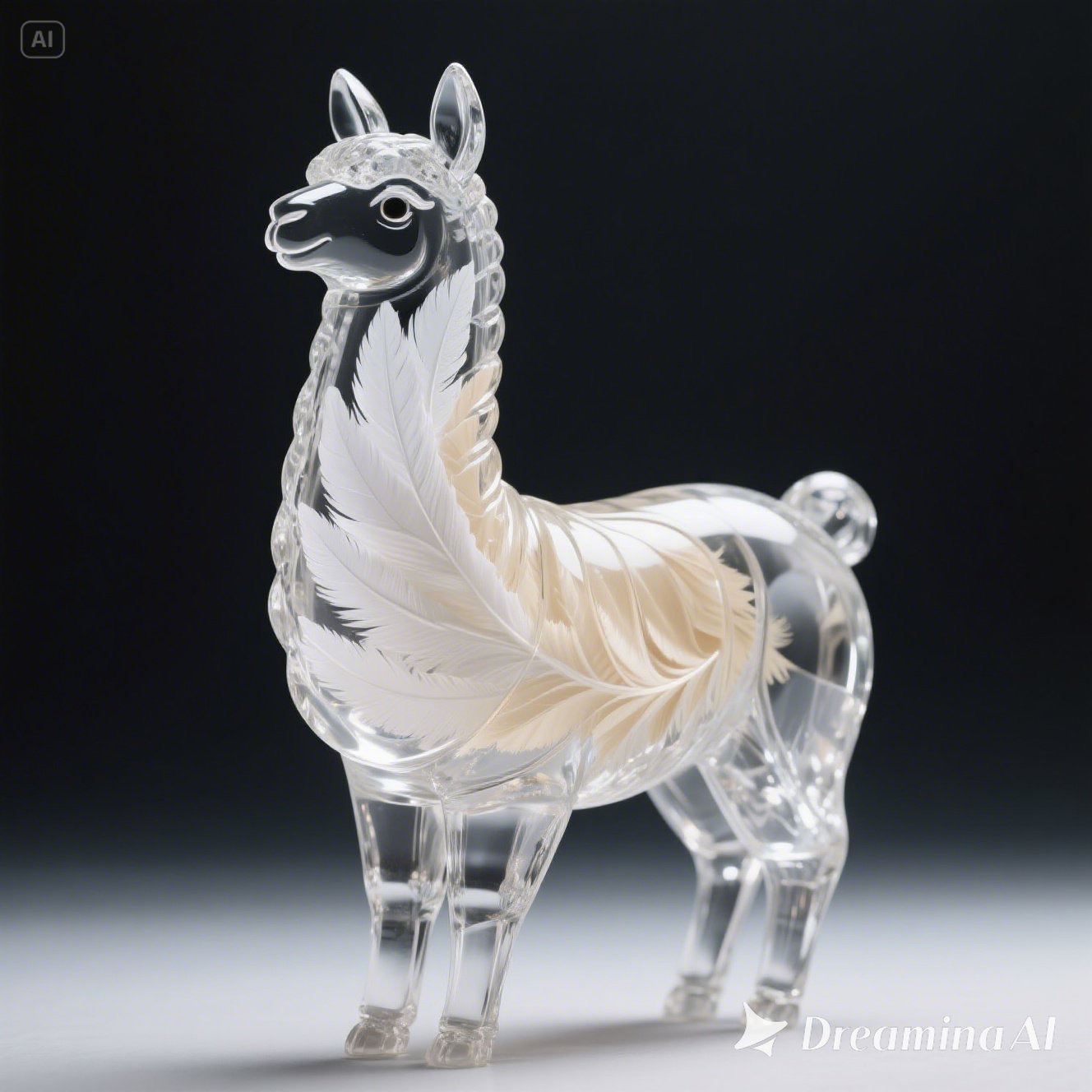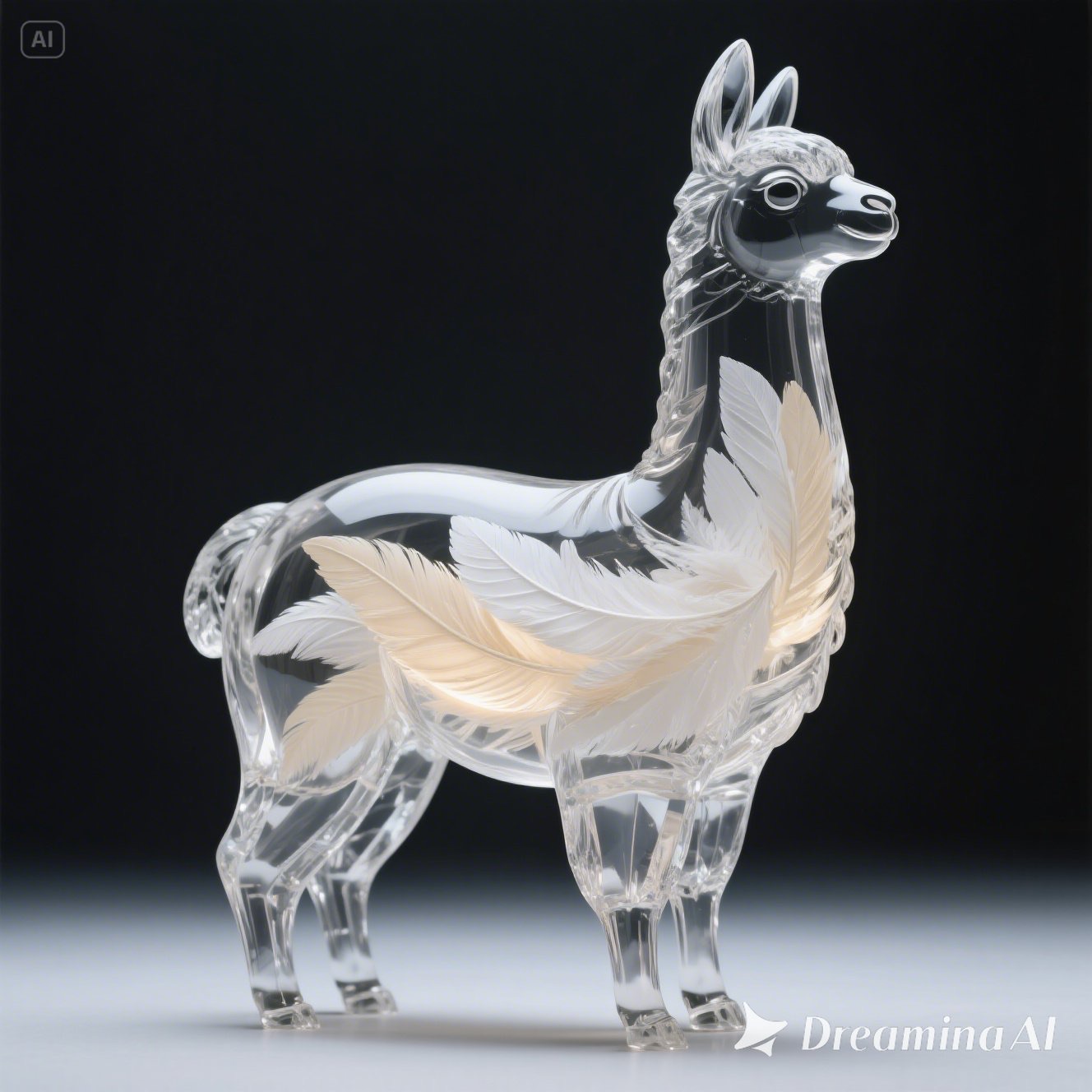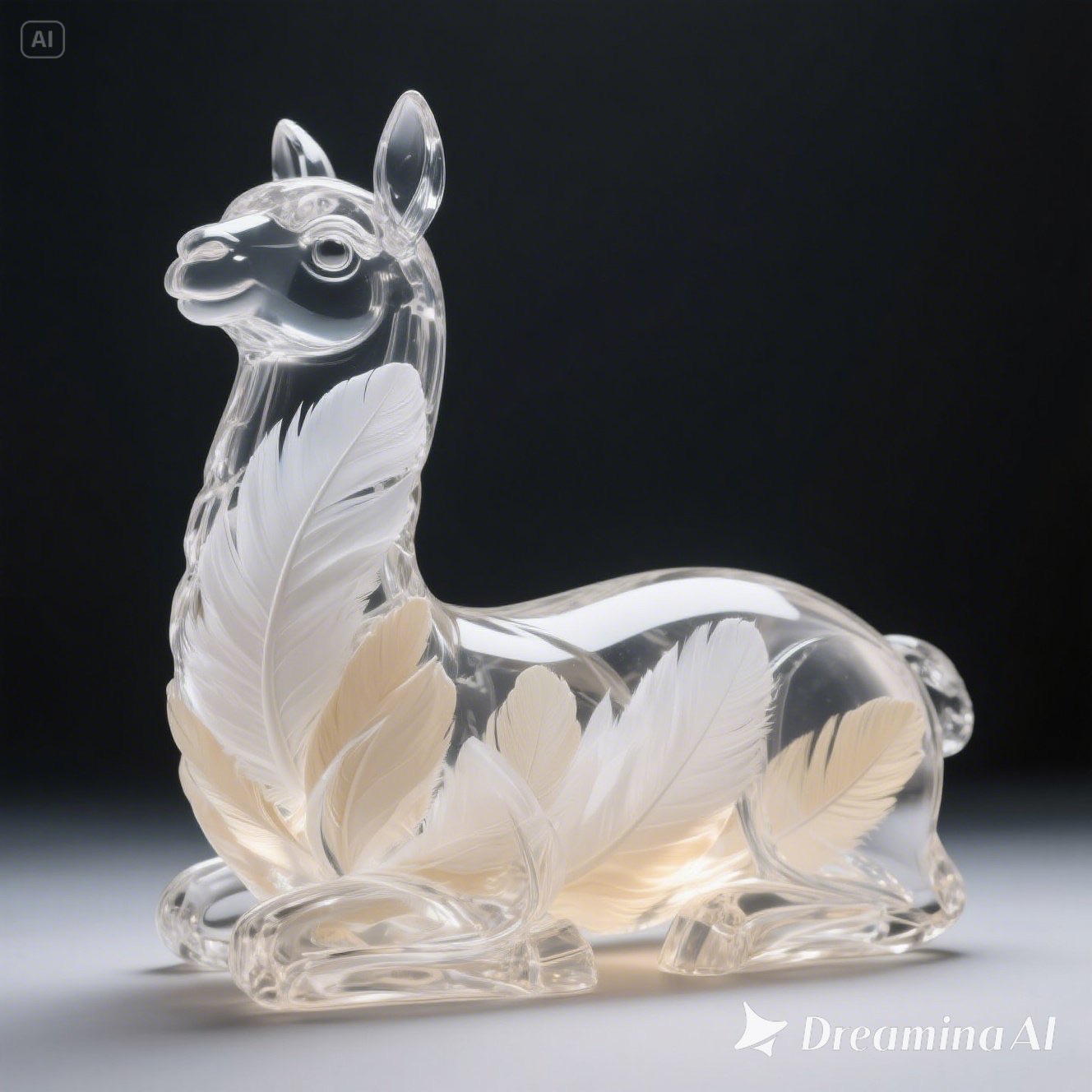 A full-body llama made of clear crystalline material with smooth curves. Inside, soft white and cream feathers are delicately layered. Soft ambient light reflects gently on the curved surfaces. The figure is placed against a simple dark background to highlight contrast and elegance.