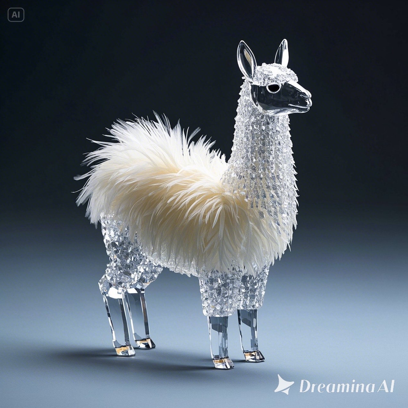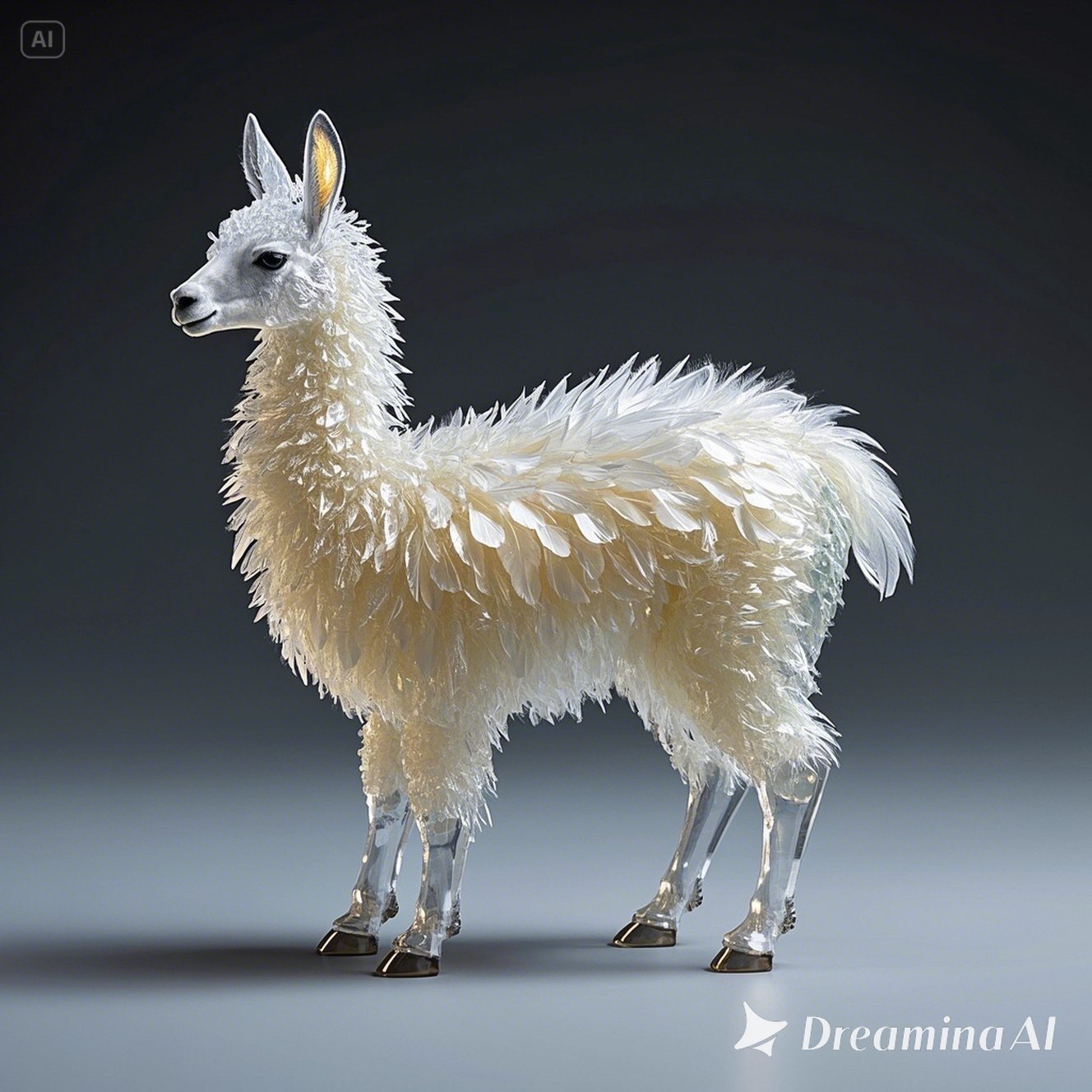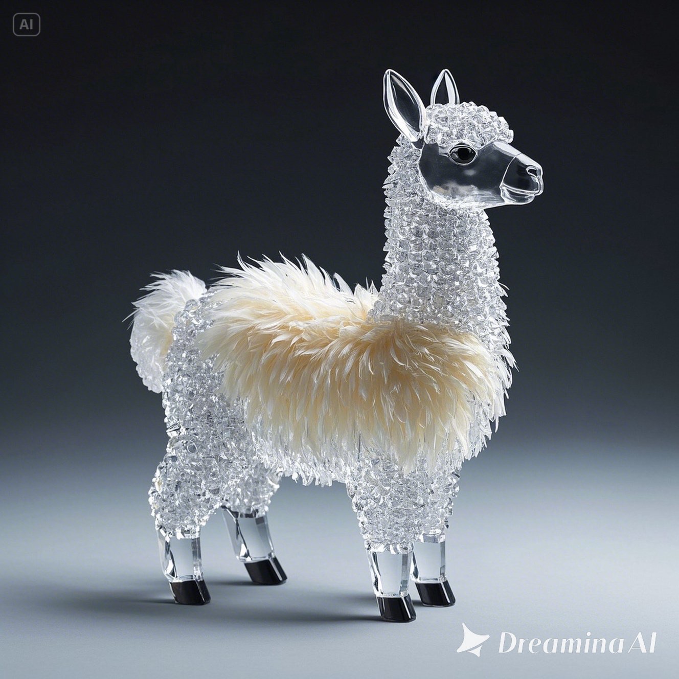 A full-body llama made of clear crystalline material with smooth curves. Inside, soft white and cream feathers are delicately layered. Soft ambient light reflects gently on the curved surfaces. The figure is placed against a simple dark background to highlight contrast and elegance.