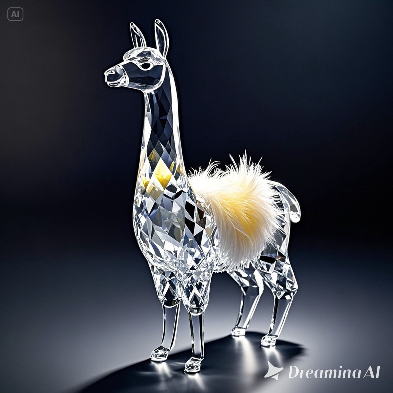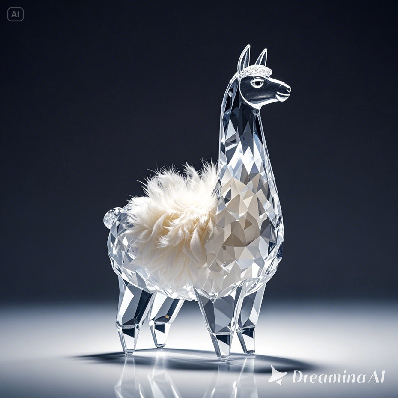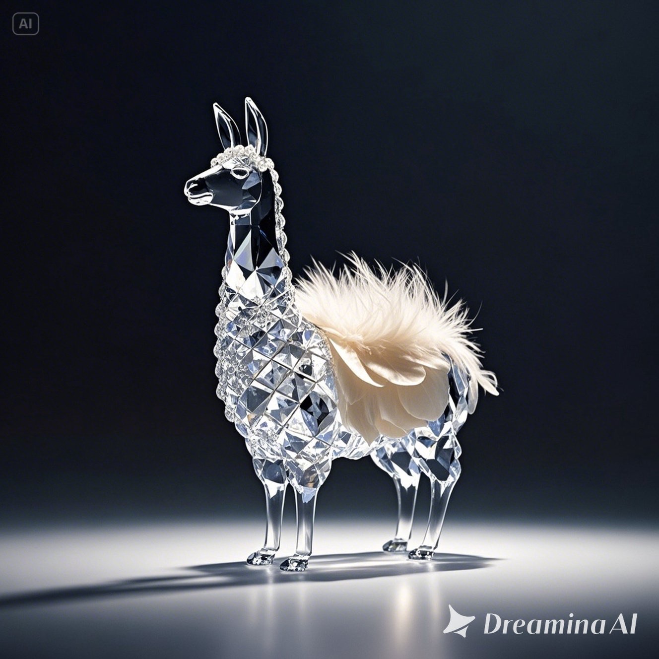 A full-body llama made of clear crystalline material with smooth curves. Inside, soft white and cream feathers are delicately layered. Soft ambient light reflects gently on the curved surfaces. The figure is placed against a simple dark background to highlight contrast and elegance.