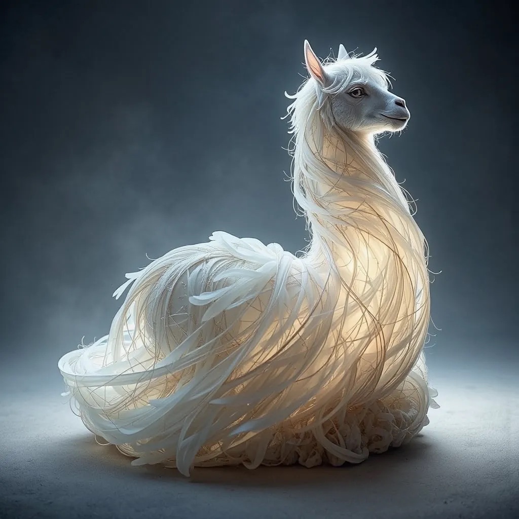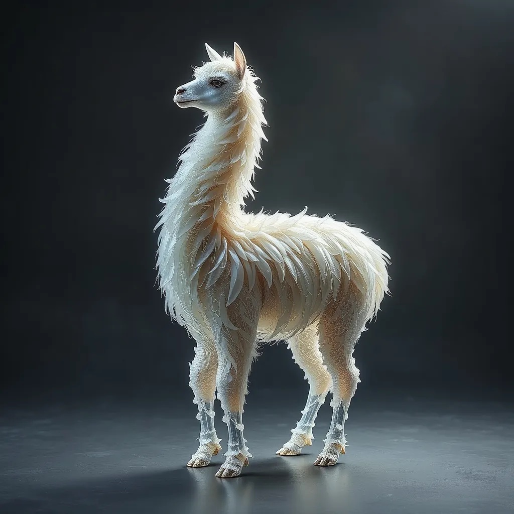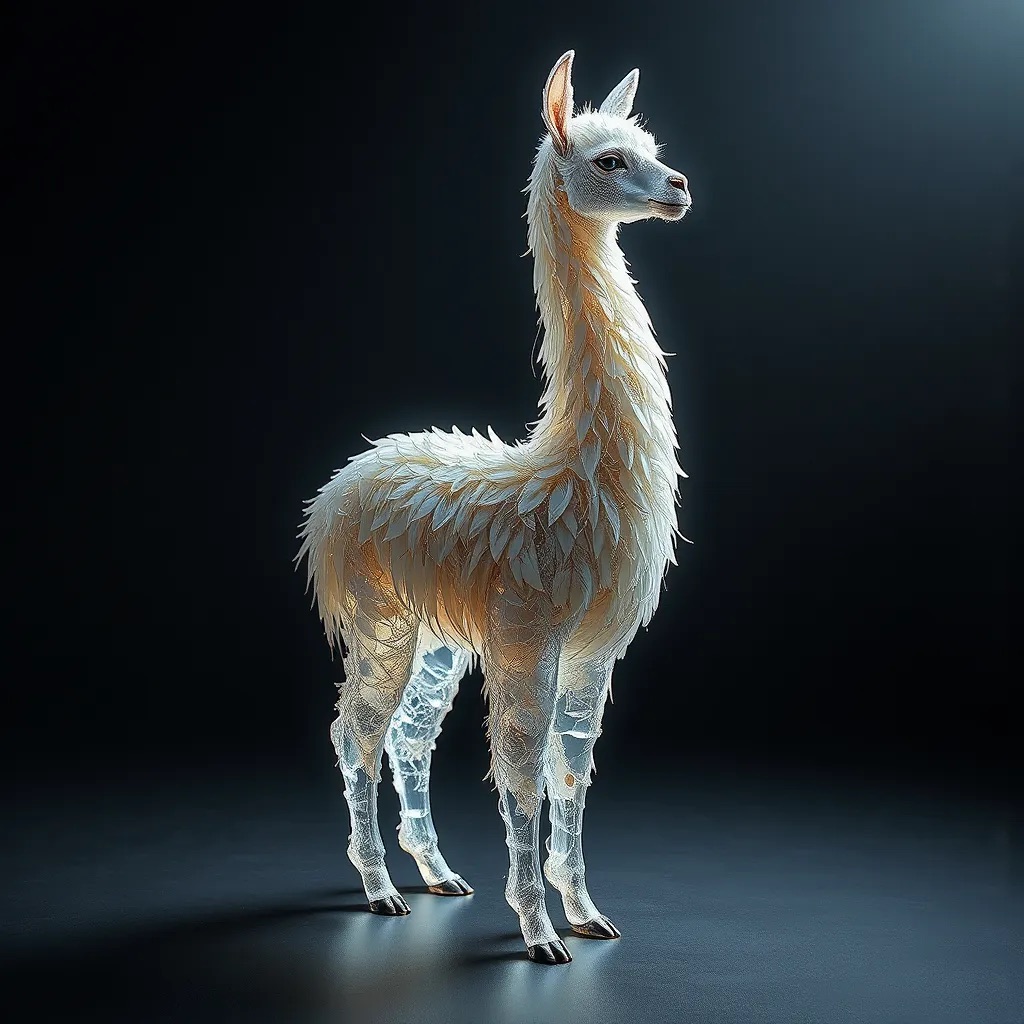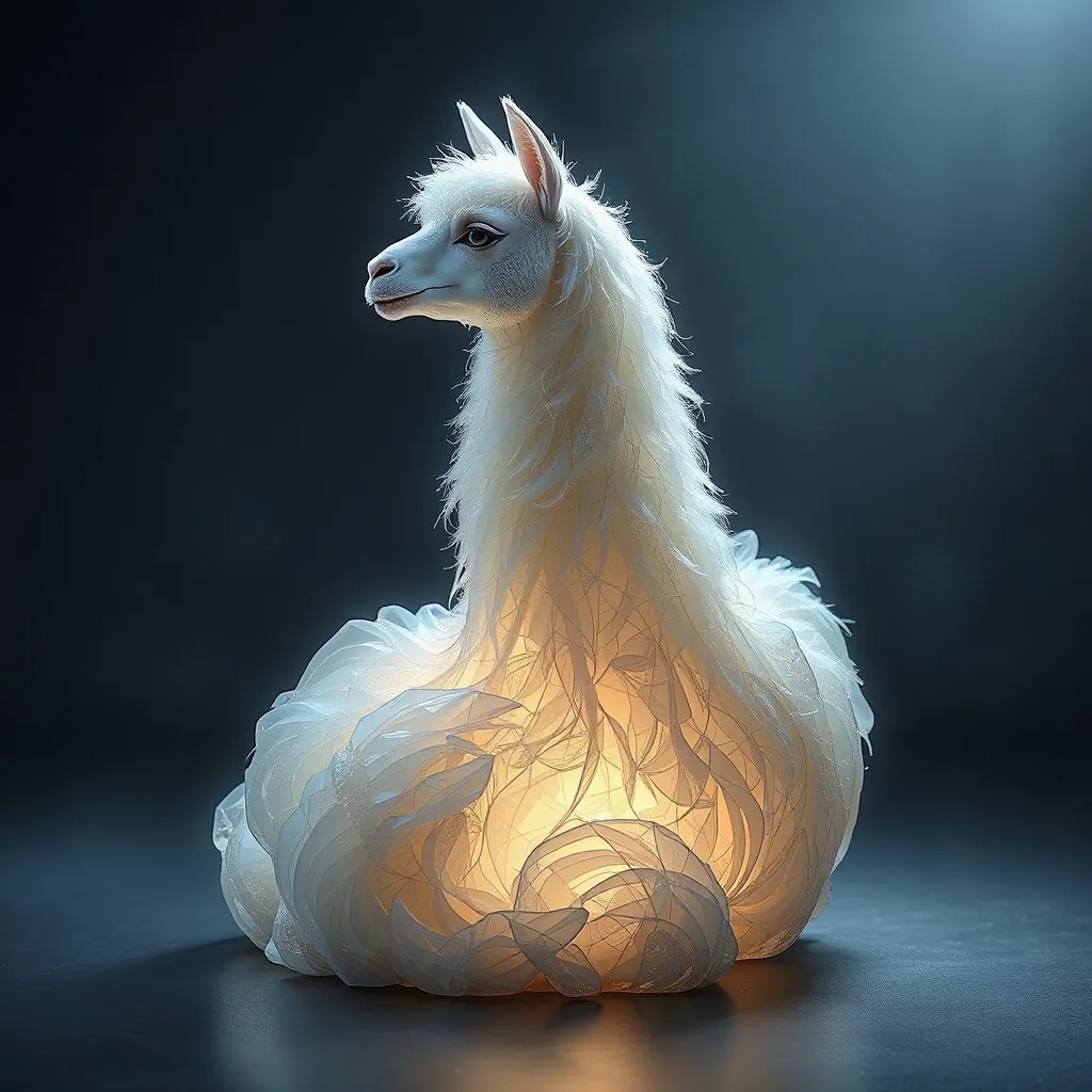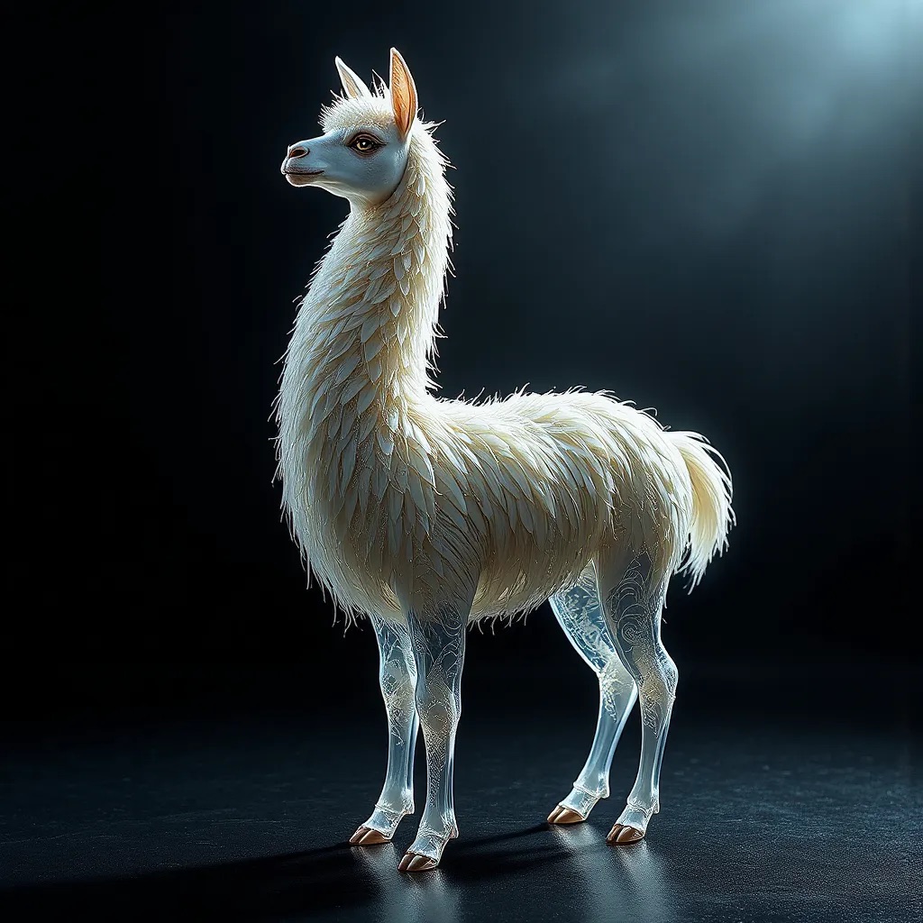 A full-body llama made of clear crystalline material with smooth curves. Inside, soft white and cream feathers are delicately layered. Soft ambient light reflects gently on the curved surfaces. The figure is placed against a simple dark background to highlight contrast and elegance.