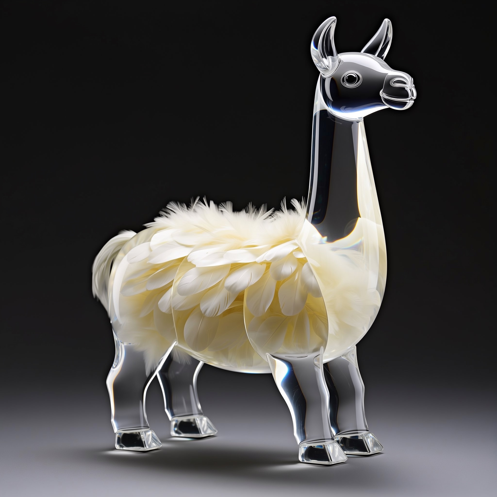 A full-body llama made of clear crystalline material with smooth curves. Inside, soft white and cream feathers are delicately layered. Soft ambient light reflects gently on the curved surfaces. The figure is placed against a simple dark background to highlight contrast and elegance.