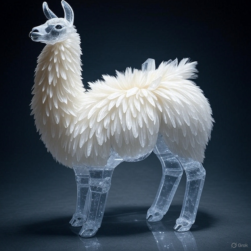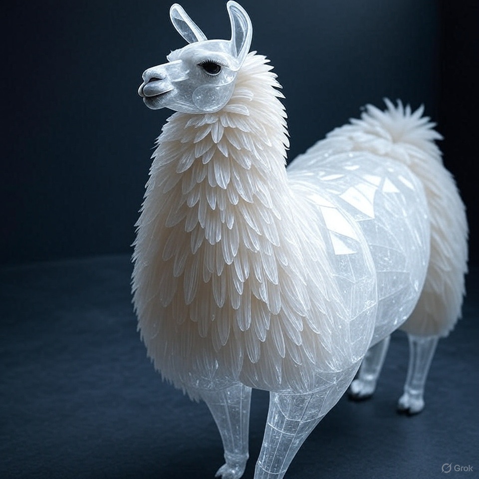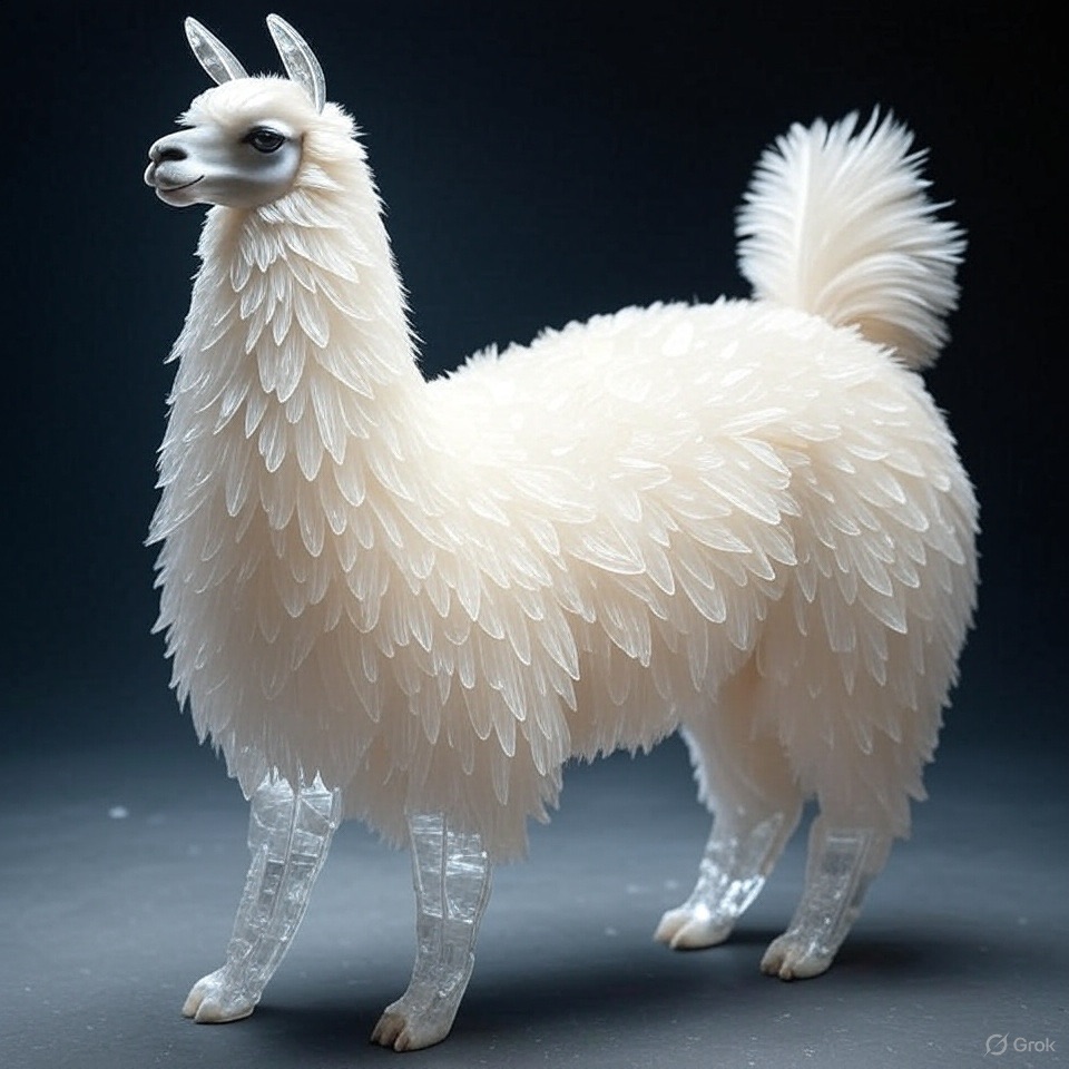 A full-body llama made of clear crystalline material with smooth curves. Inside, soft white and cream feathers are delicately layered. Soft ambient light reflects gently on the curved surfaces. The figure is placed against a simple dark background to highlight contrast and elegance.