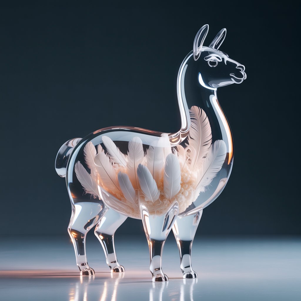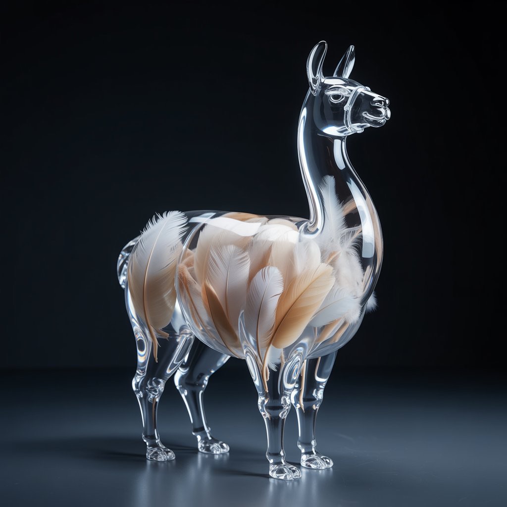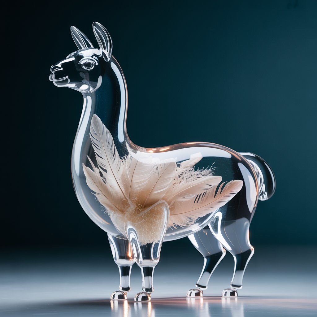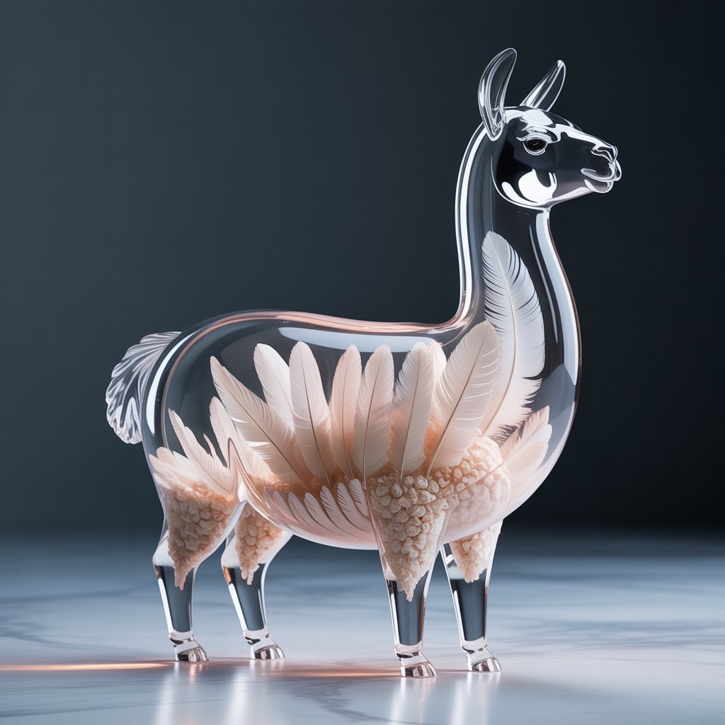 A full-body llama made of clear crystalline material with smooth curves. Inside, soft white and cream feathers are delicately layered. Soft ambient light reflects gently on the curved surfaces. The figure is placed against a simple dark background to highlight contrast and elegance.