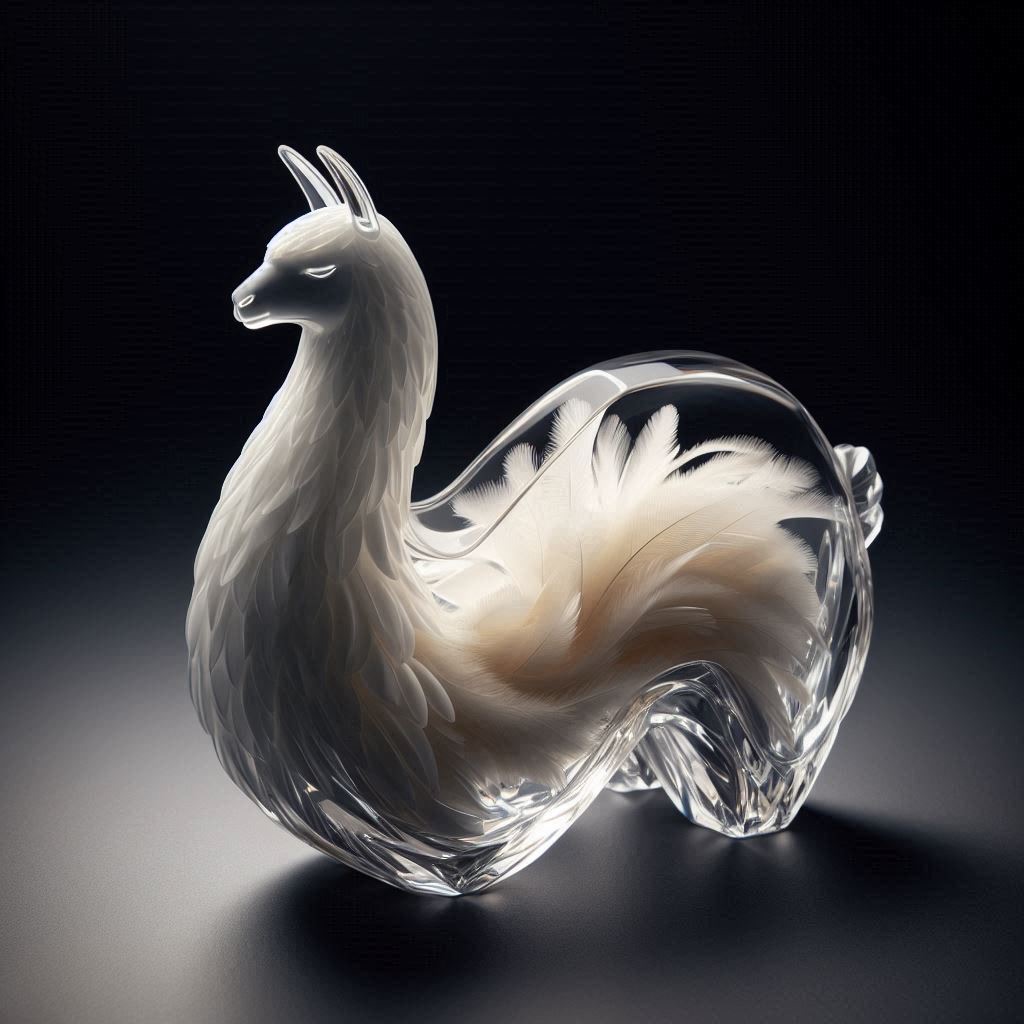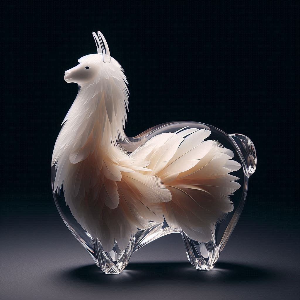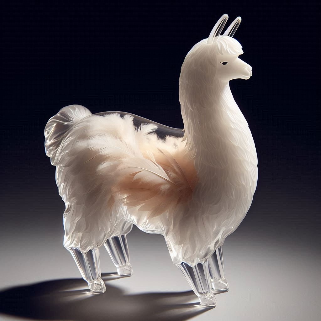 A full-body llama made of clear crystalline material with smooth curves. Inside, soft white and cream feathers are delicately layered. Soft ambient light reflects gently on the curved surfaces. The figure is placed against a simple dark background to highlight contrast and elegance.