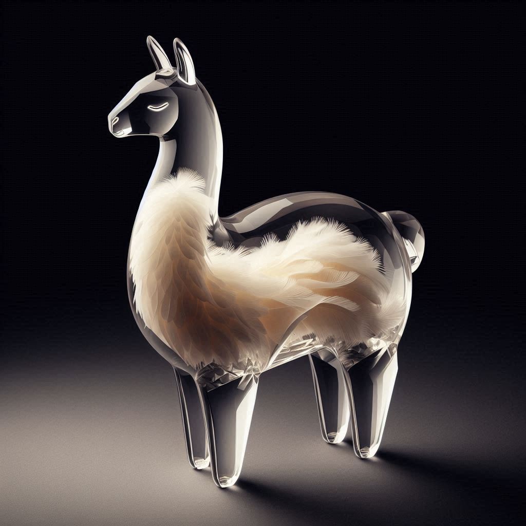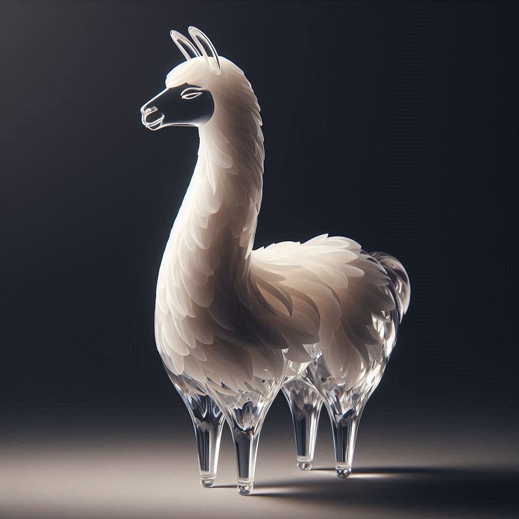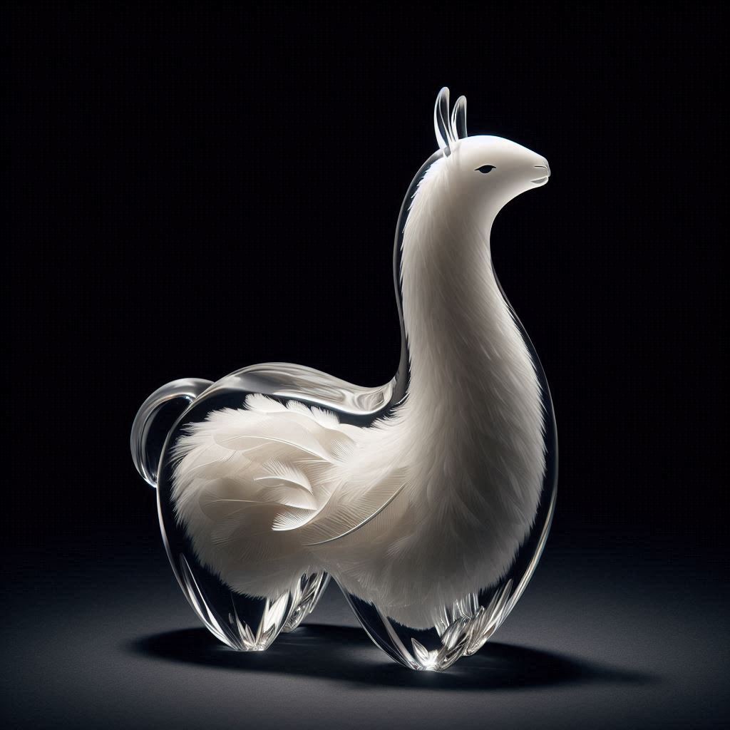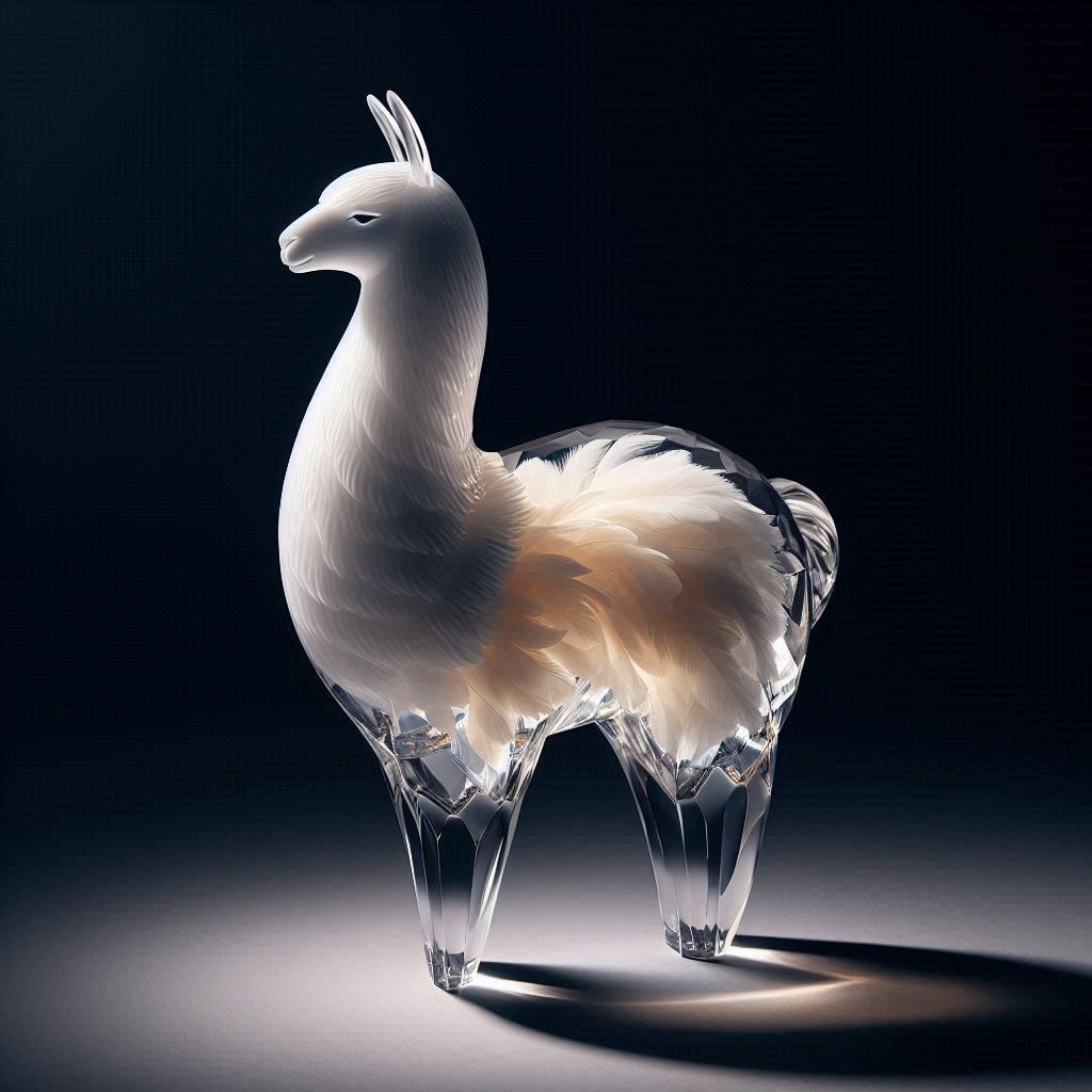 A full-body llama made of clear crystalline material with smooth curves. Inside, soft white and cream feathers are delicately layered. Soft ambient light reflects gently on the curved surfaces. The figure is placed against a simple dark background to highlight contrast and elegance.