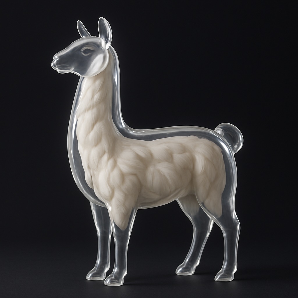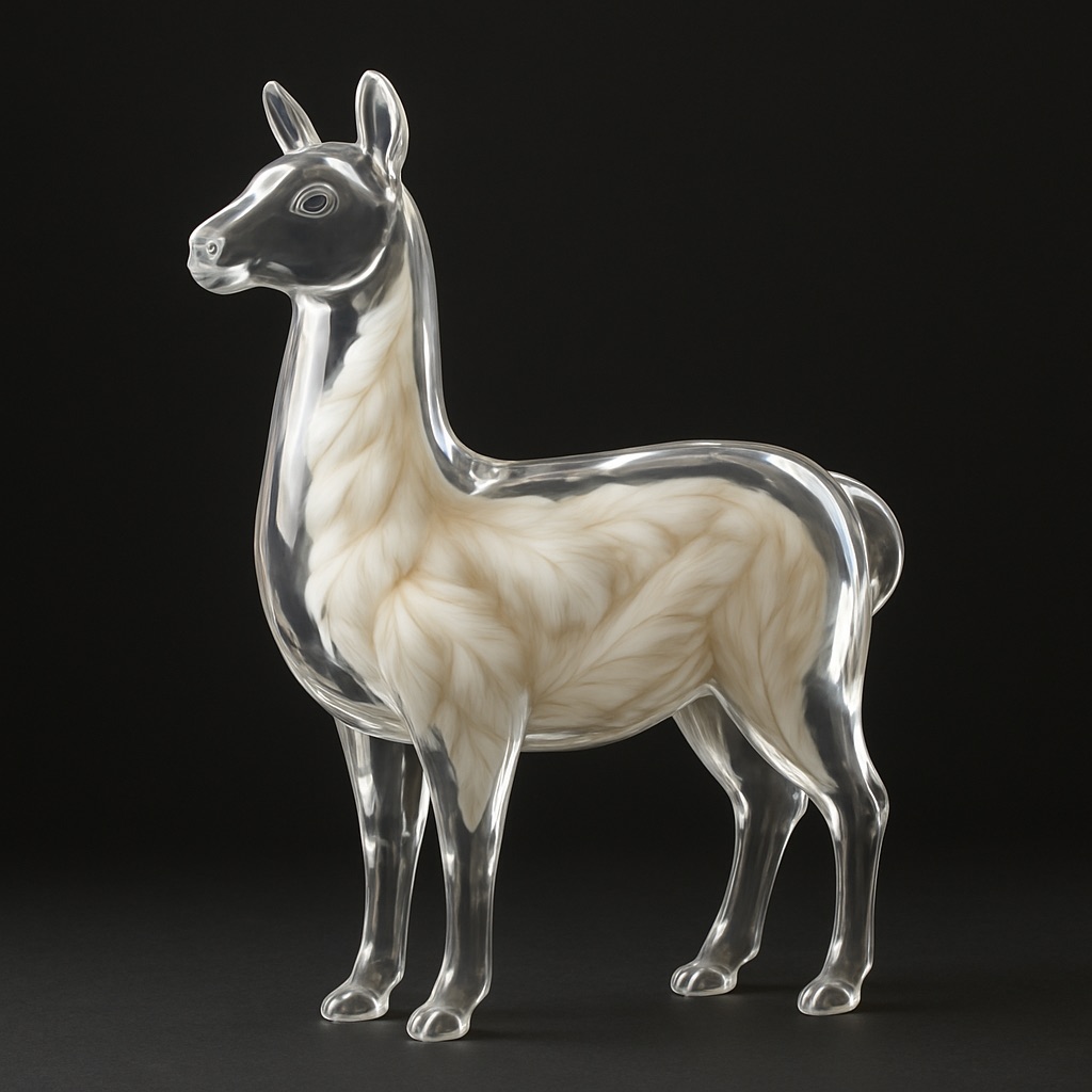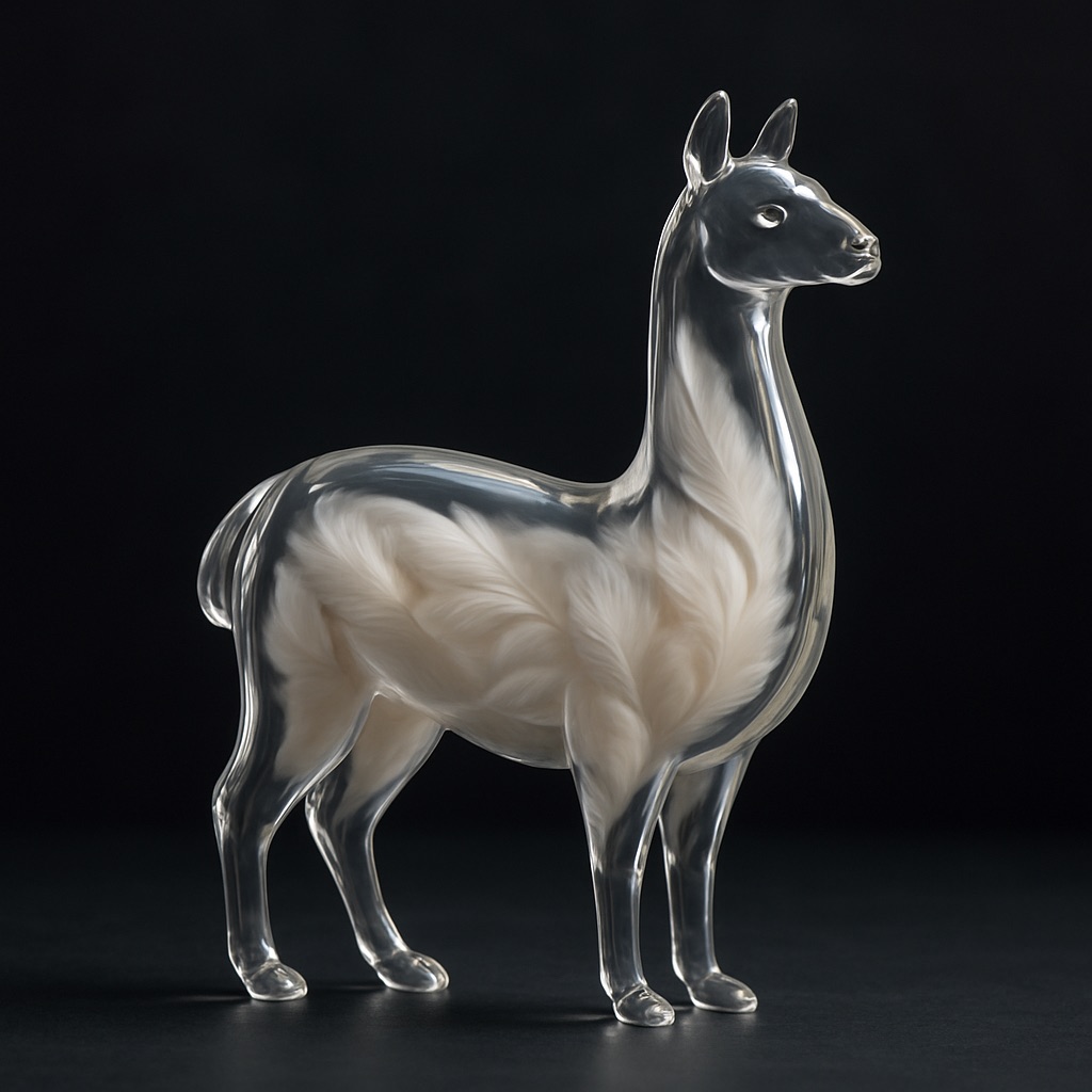 A full-body llama made of clear crystalline material with smooth curves. Inside, soft white and cream feathers are delicately layered. Soft ambient light reflects gently on the curved surfaces. The figure is placed against a simple dark background to highlight contrast and elegance.