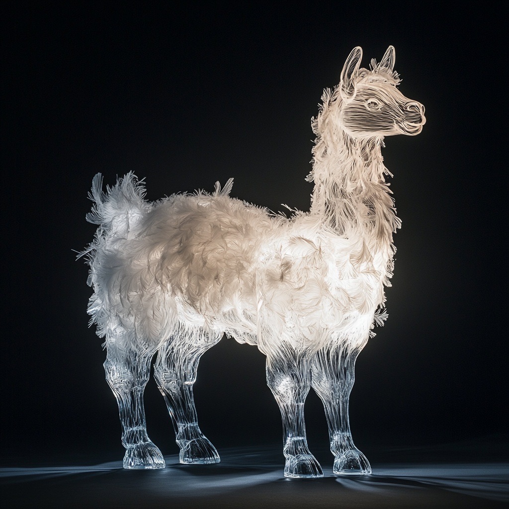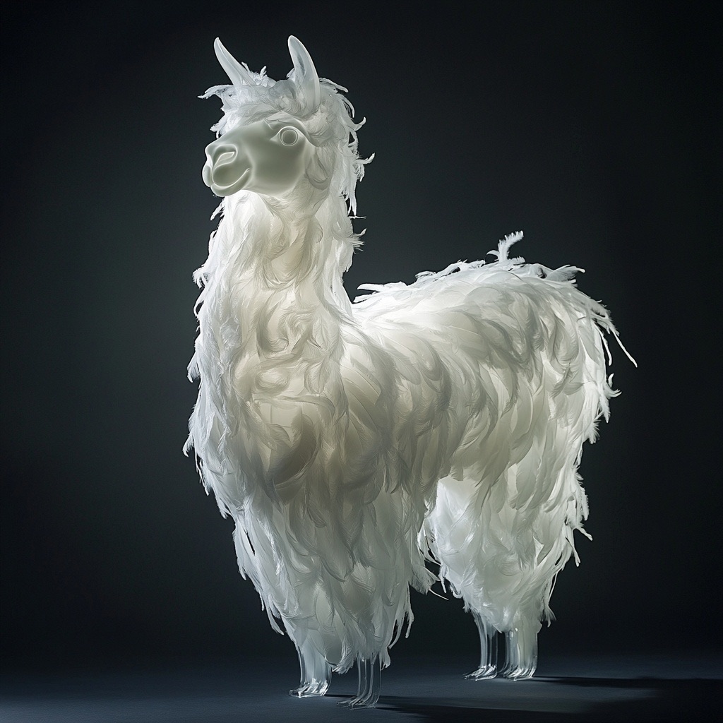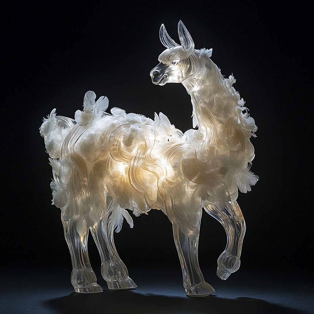 A full-body llama made of clear crystalline material with smooth curves. Inside, soft white and cream feathers are delicately layered. Soft ambient light reflects gently on the curved surfaces. The figure is placed against a simple dark background to highlight contrast and elegance.